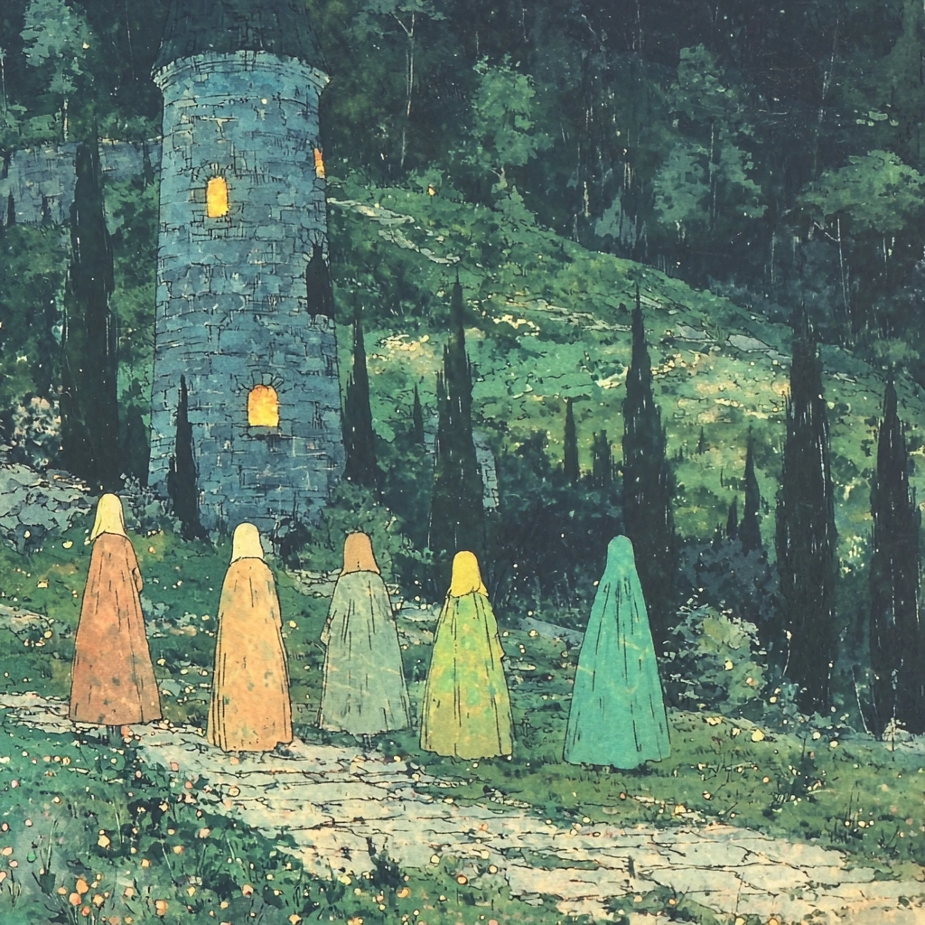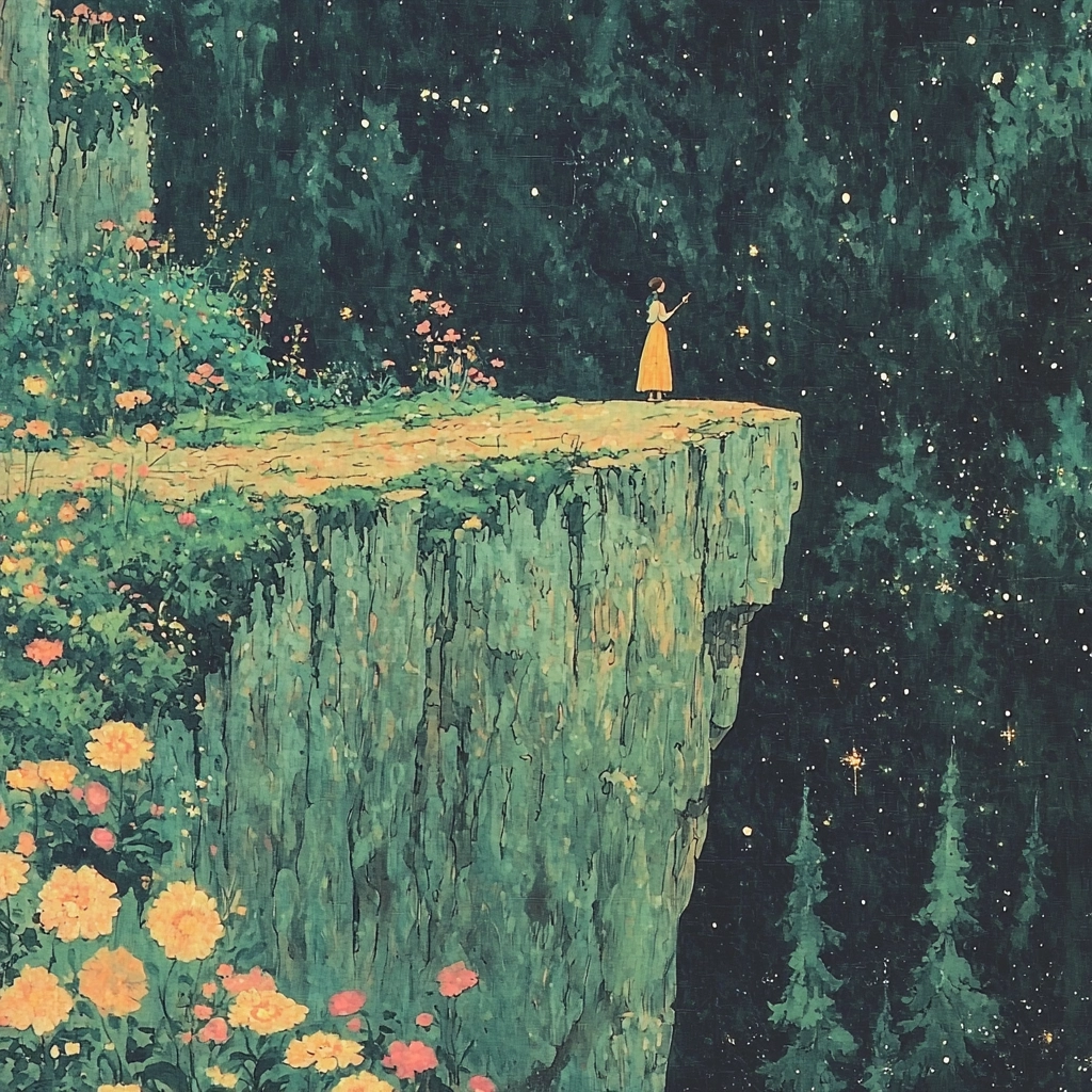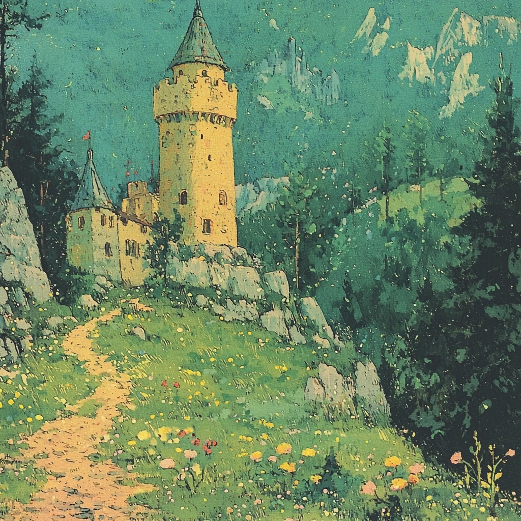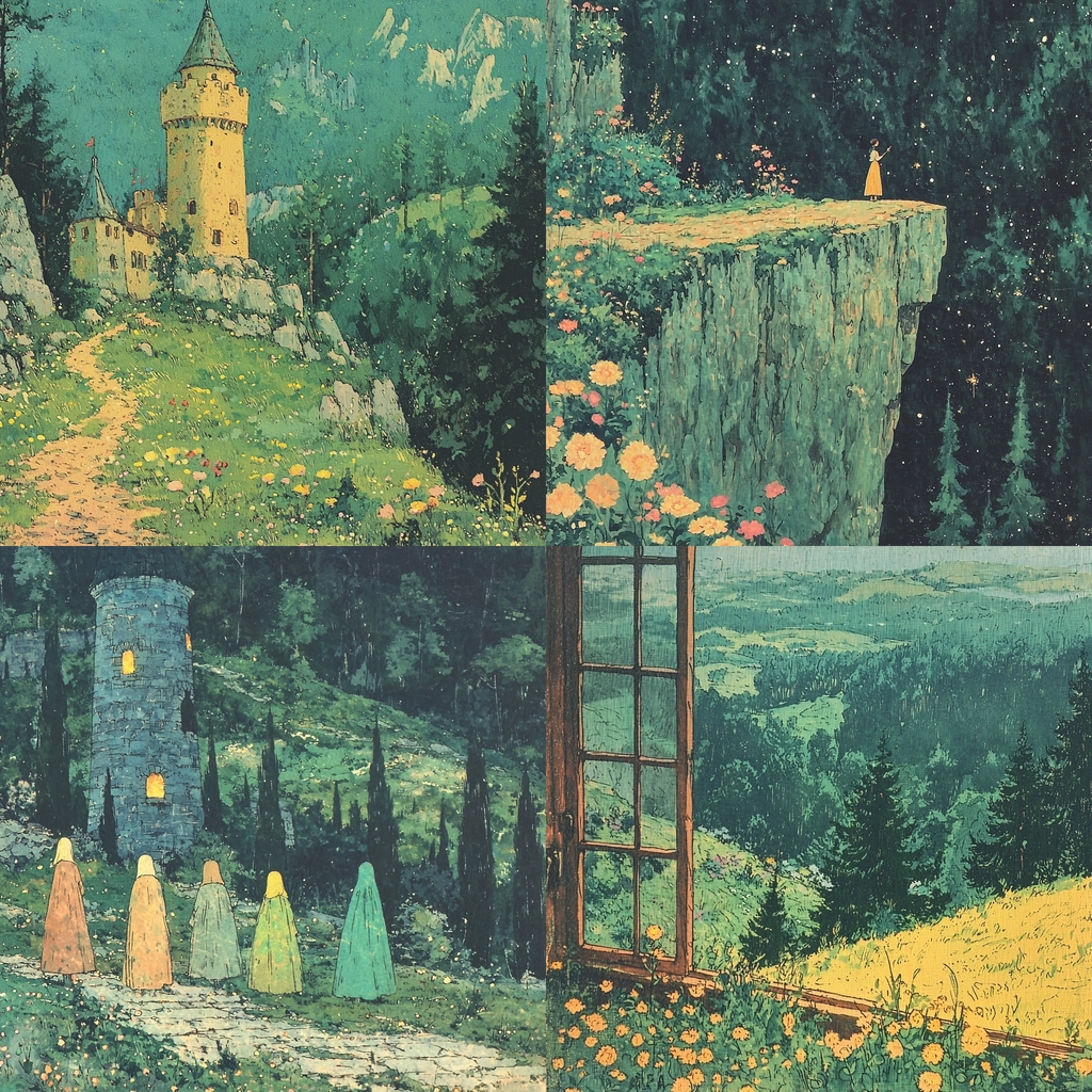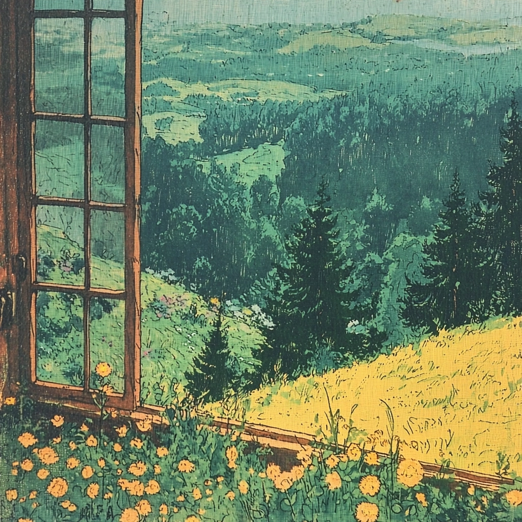 The lighting implicates both day and dusk, with hues gently transitioning across natural sceneries. Saturation varies, creating vivid and subdued areas, which translates to a spacious yet intimate setting. Visible brushwork defines delicate textures.