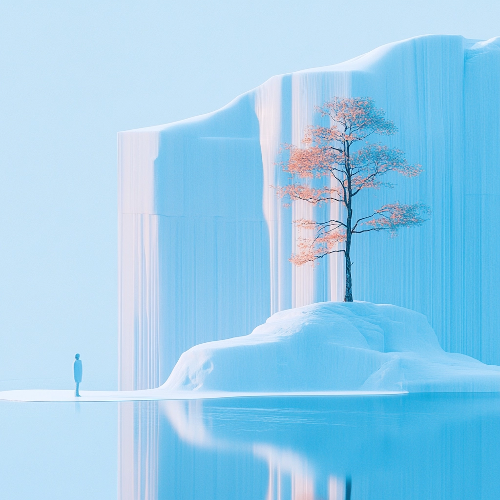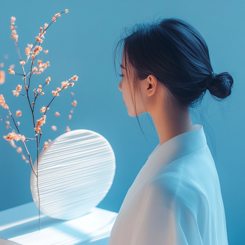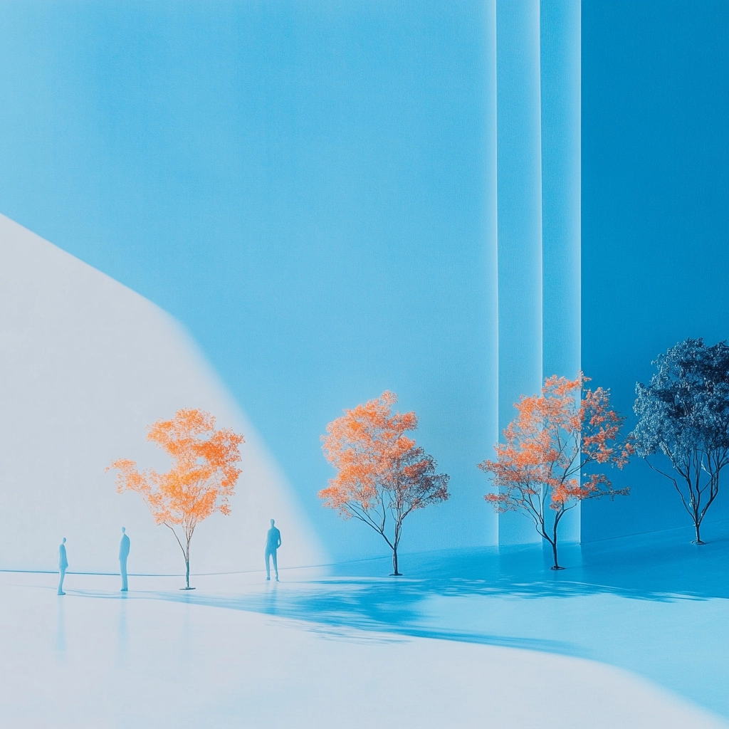 Gentle, diffused lighting creates subtle shadows and highlights, enhancing the soft textures and smooth surfaces. The color palette is dominated by cool blues and accented by warm oranges, providing a harmonious balance. Space is utilized with precision, giving a sense of openness and clarity.