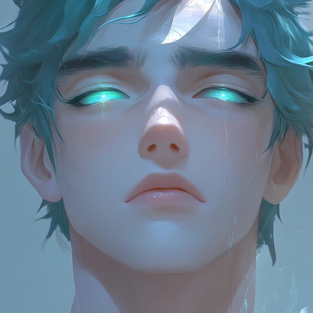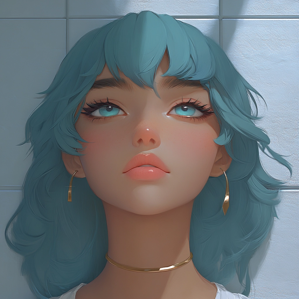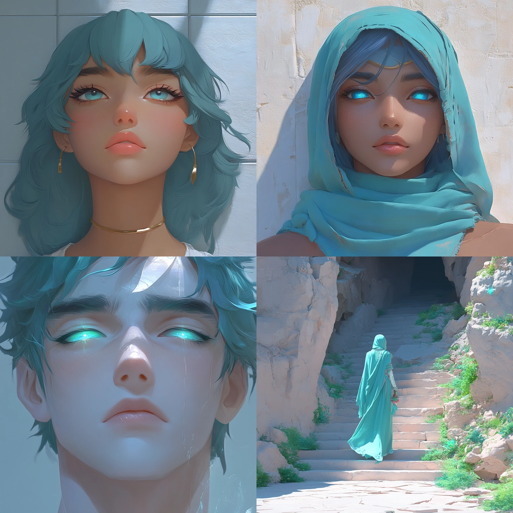 Features a balanced use of cool cyan tones against light, natural backgrounds with soft, diffused lighting.