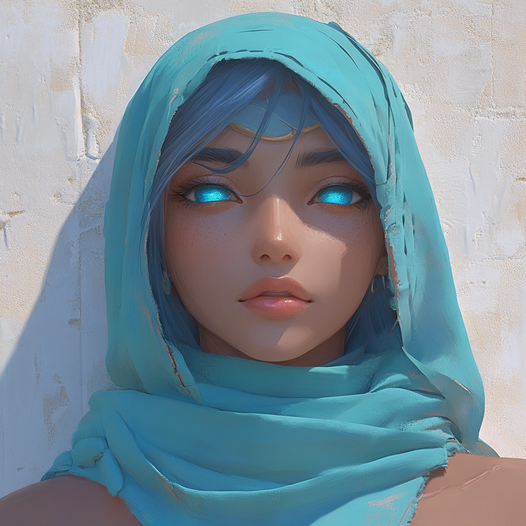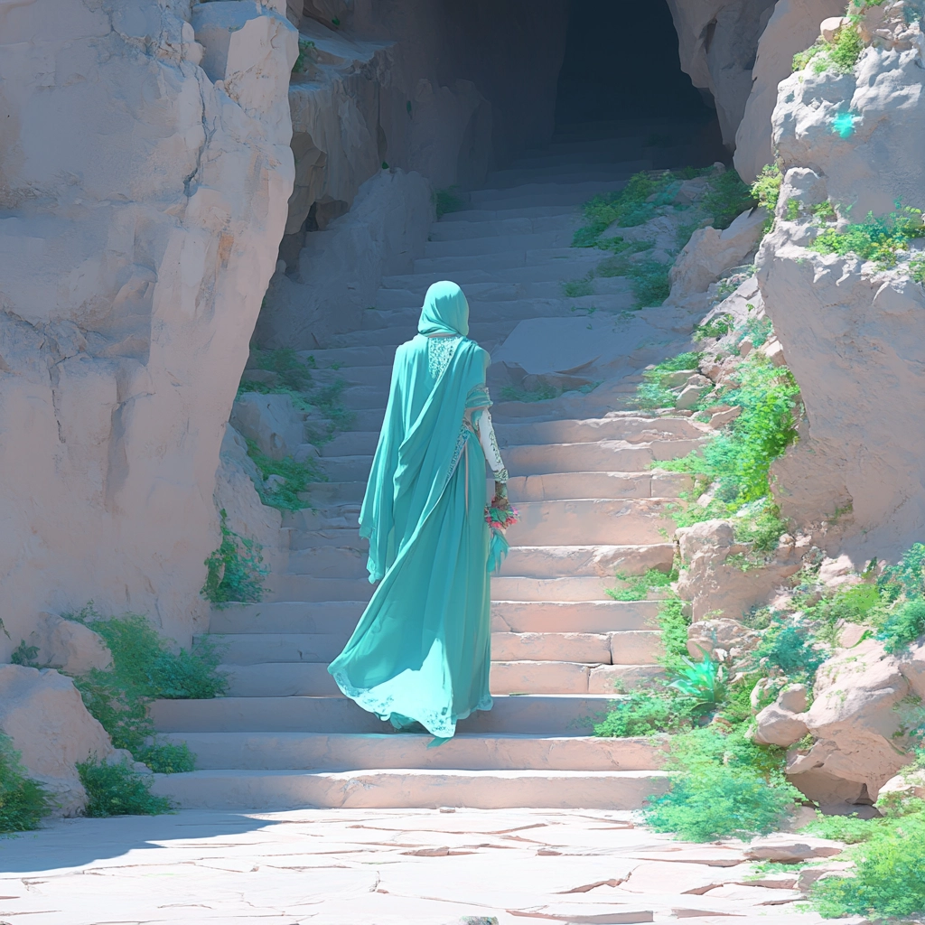 The lighting creates a luminous effect, gently highlighting the cyan drapery and hair texture while casting subtle shadows that enhance depth. The spatial composition leads the eye upward through pathways and organic landscapes, creating a cohesive visual flow.