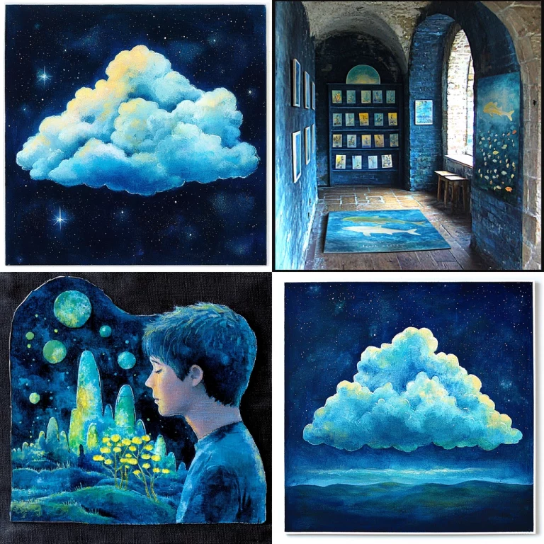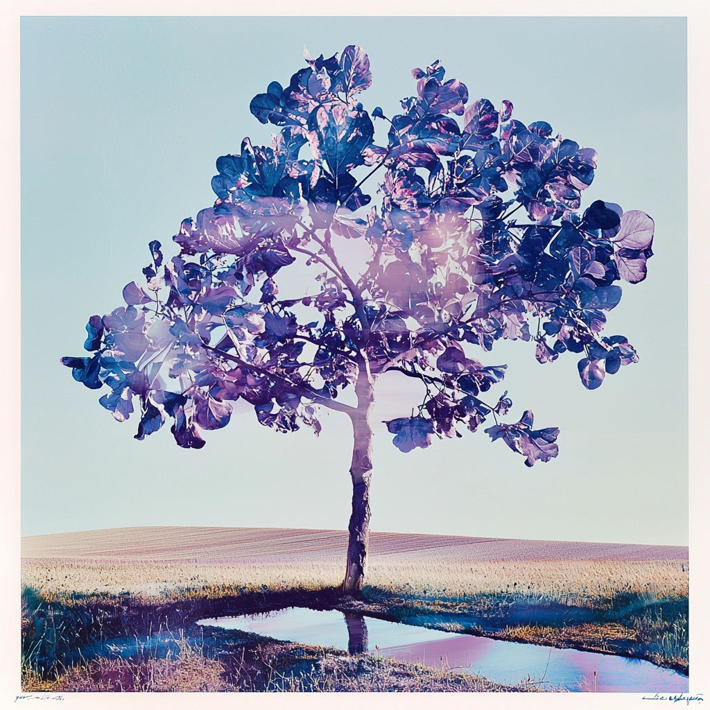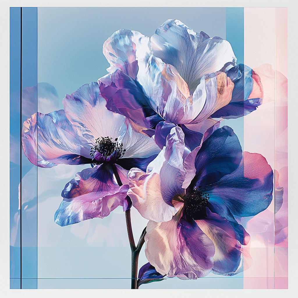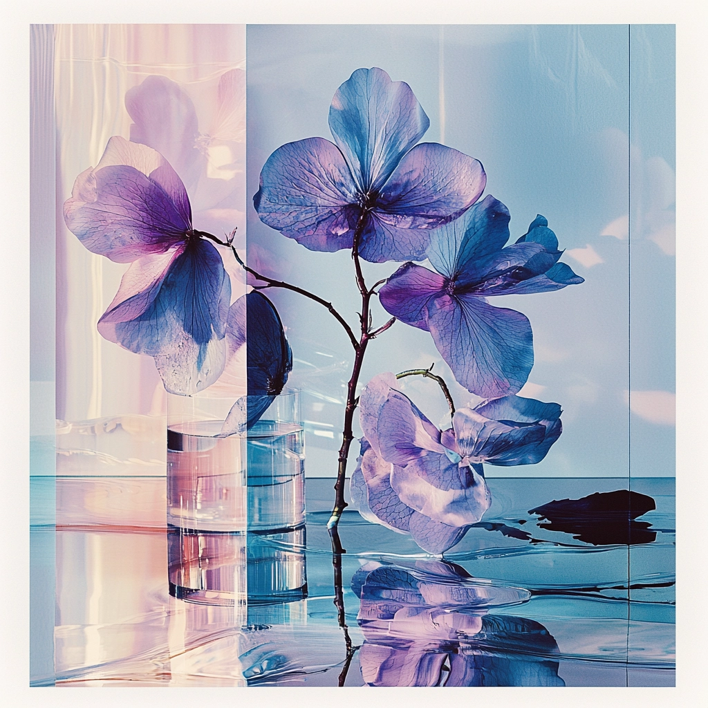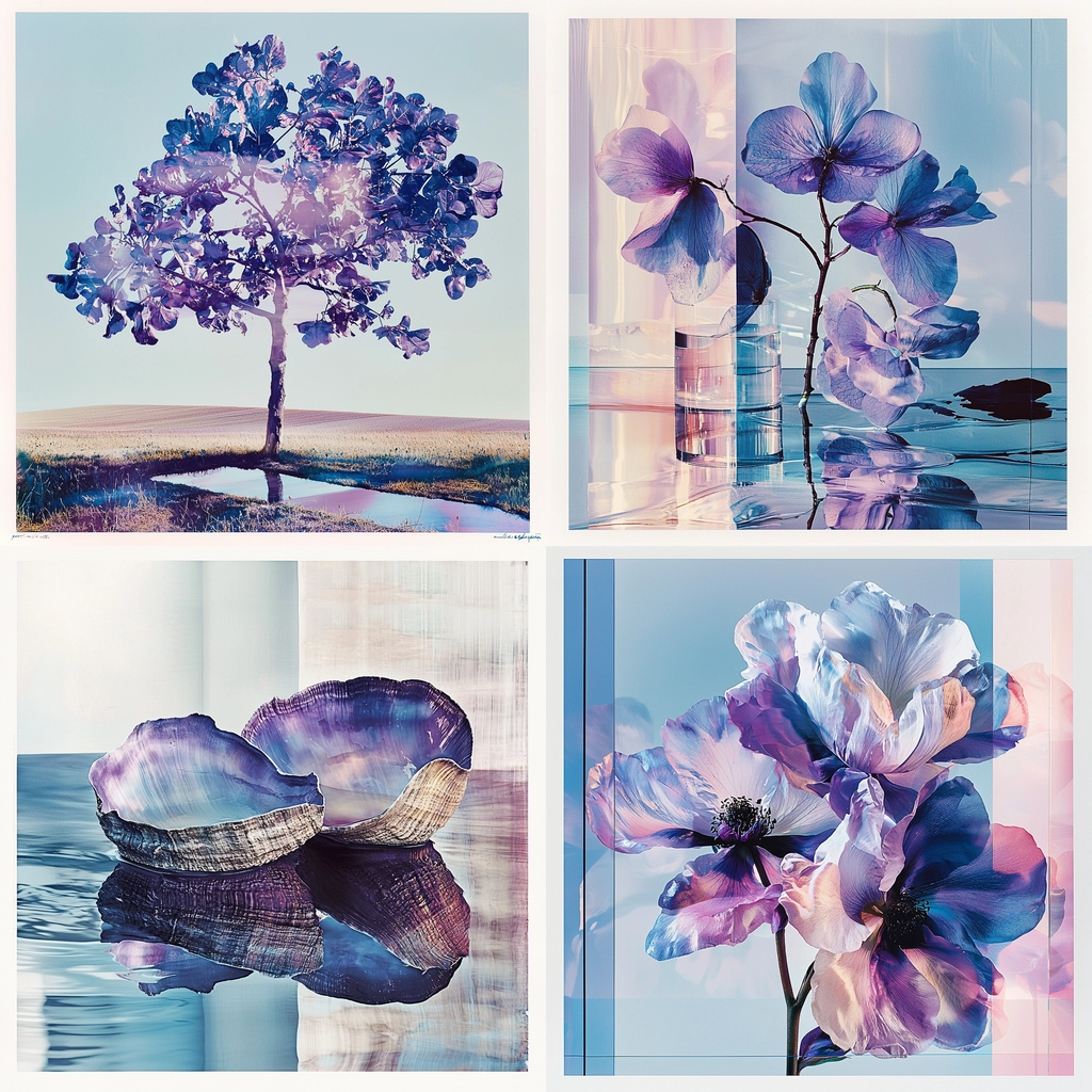 The use of soft lighting enhances the subtle gradients of purple and blue, creating a gentle transition between subjects. Reflections add depth, while the textures emphasize smooth, fluid surfaces, balancing the solid structures against ethereal backgrounds.