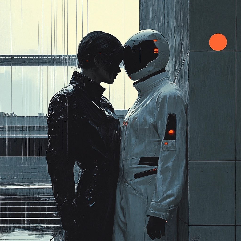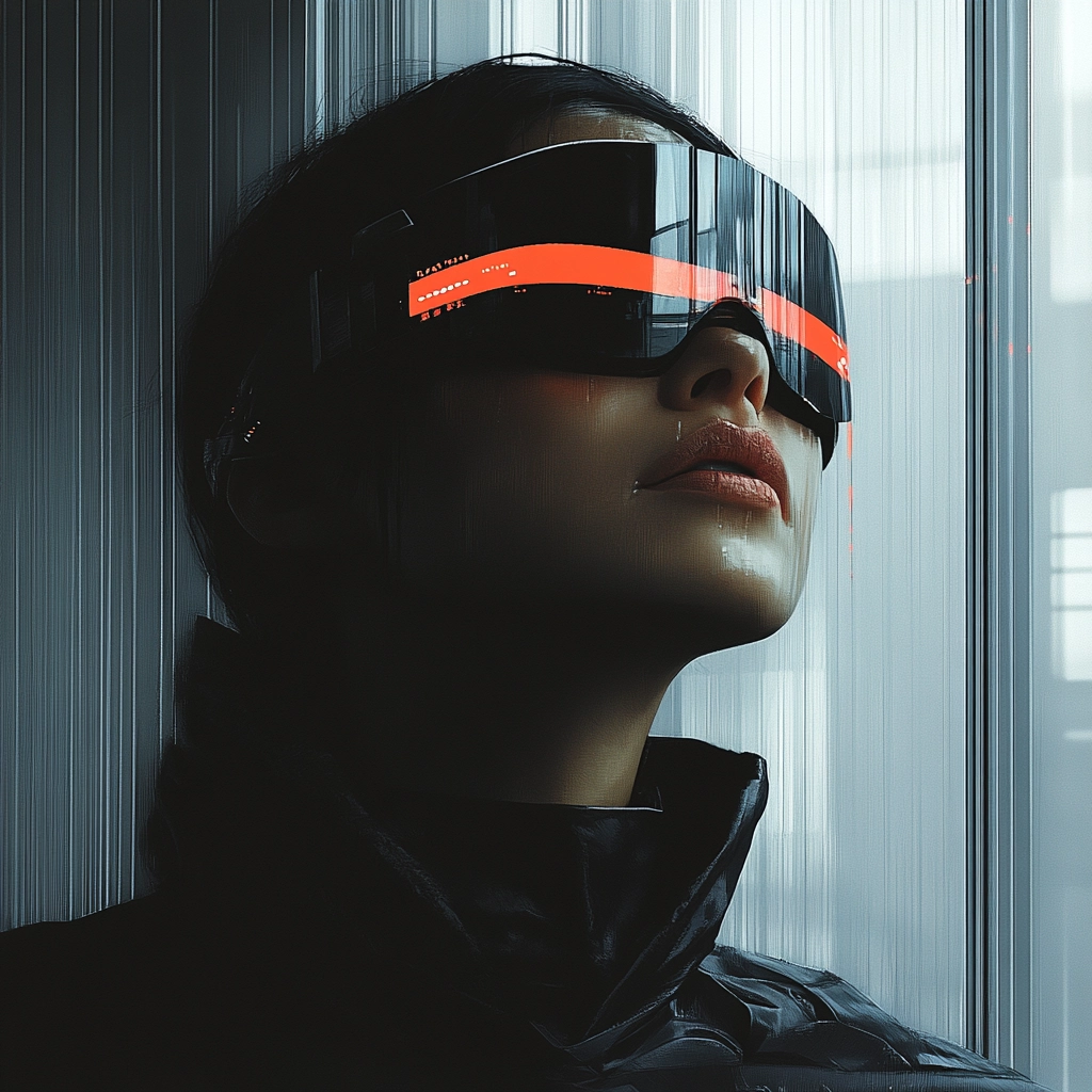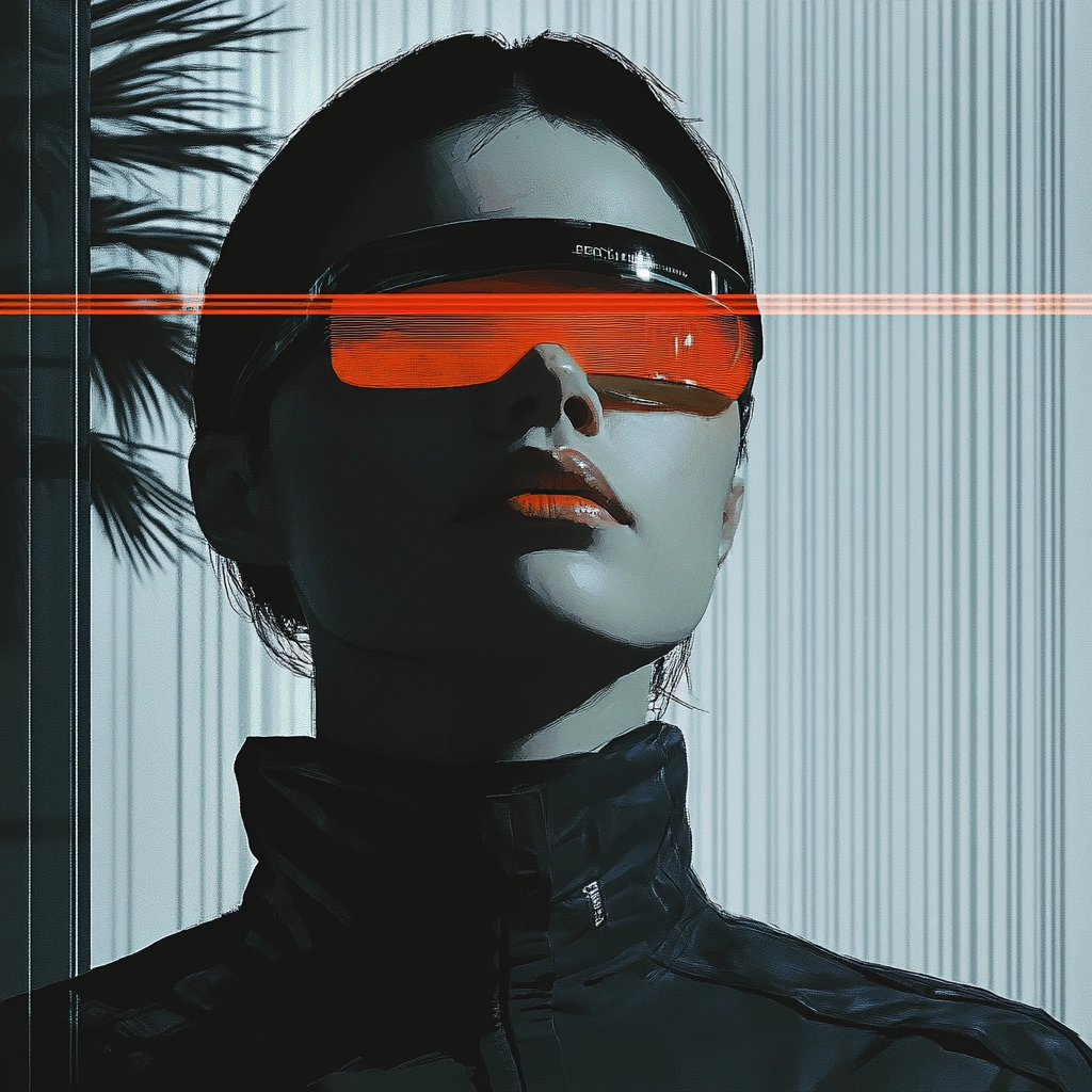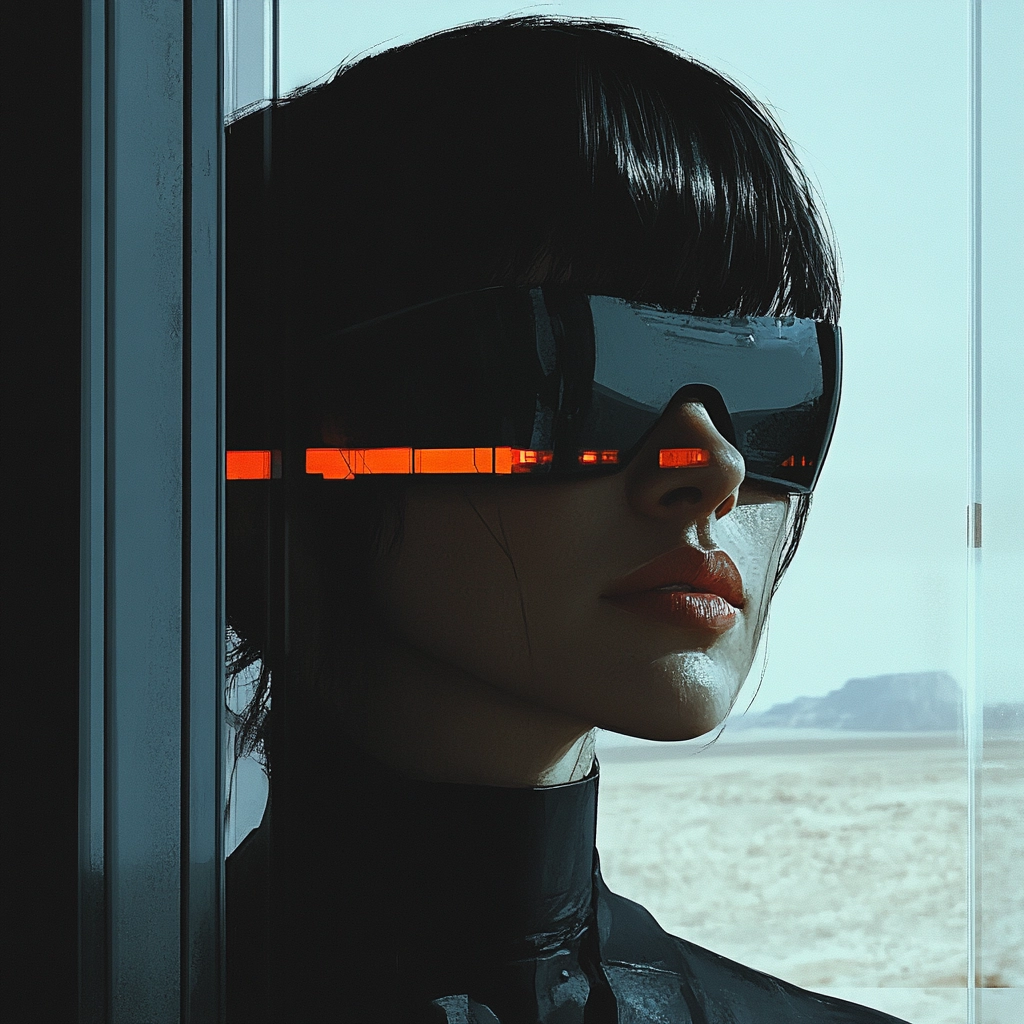 The use of horizontal and vertical lines creates a structured visual plane, while the cool color palette emphasizes depth and modernity. Lighting is subtly focused, enhancing reflective textures amid dark and muted backgrounds.