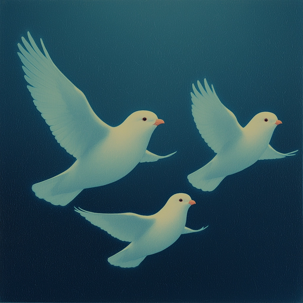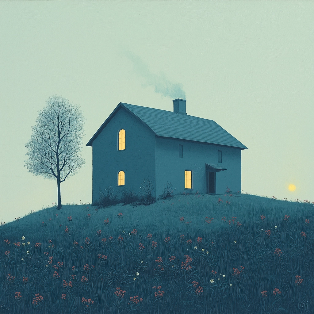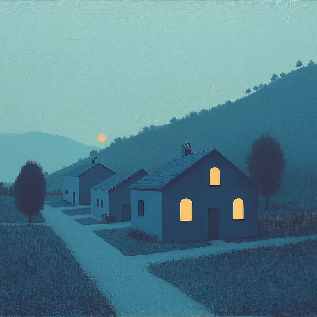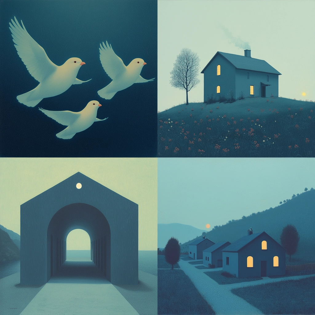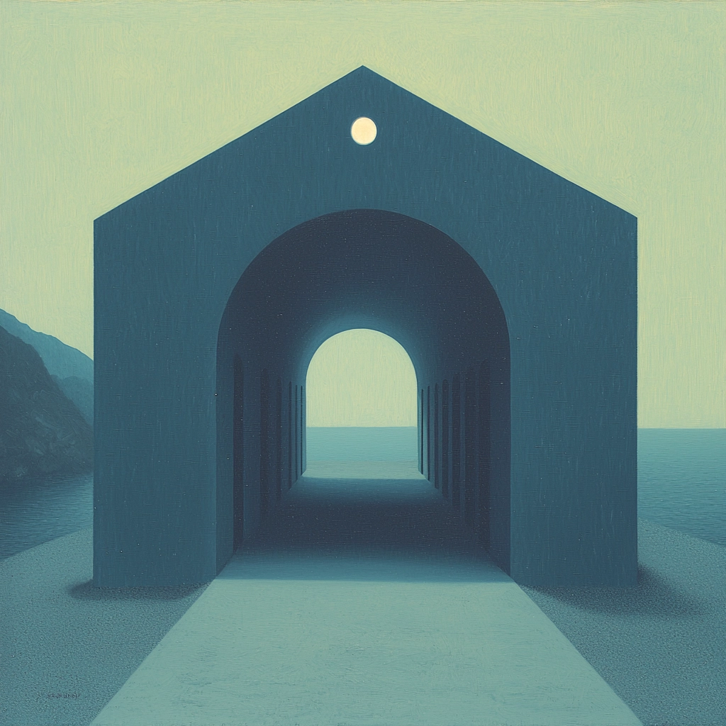 Lighting creates subtle interactions with dark silhouettes, enhancing dimensionality. Colors are muted, emphasizing cool tones and gentle gradients. Texture is smooth with a restrained use of details, contributing to a balanced spatial arrangement.