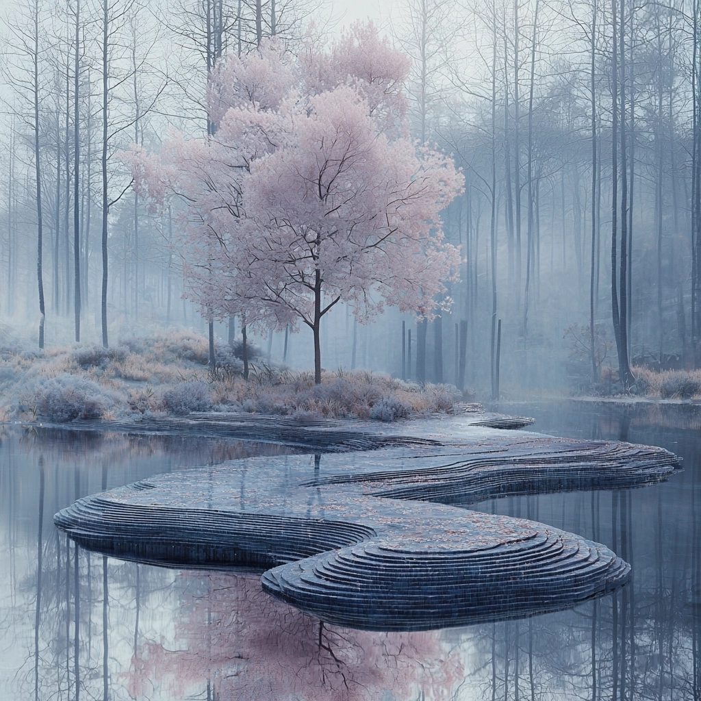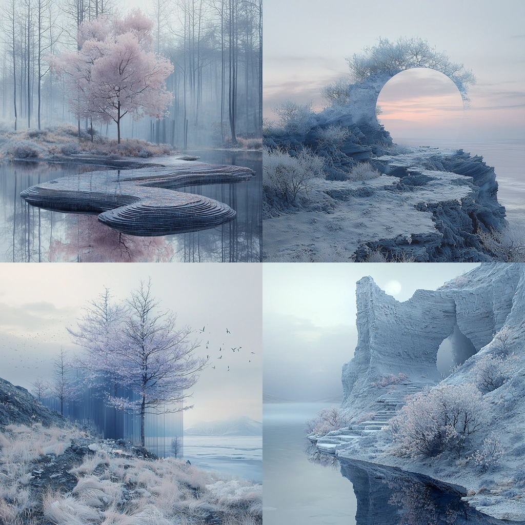 The scene is enveloped in a soft, diffused light that bathes the landscape in cool blues and grays, with hints of pink adding contrast. The texture is smooth and refined, presenting an expansive spatial depth through layers of mist and subtle shading.