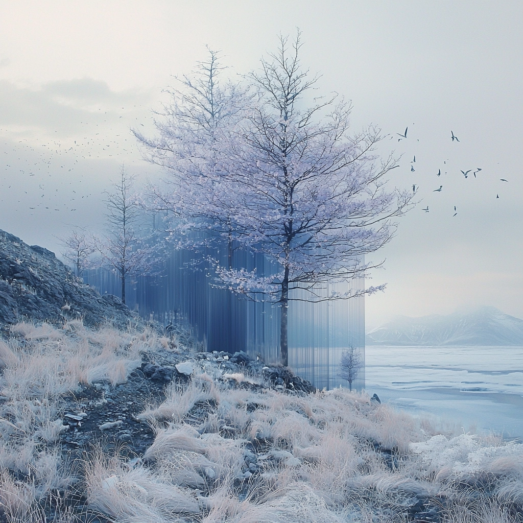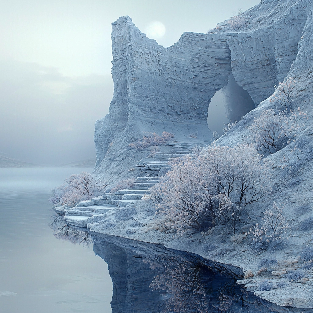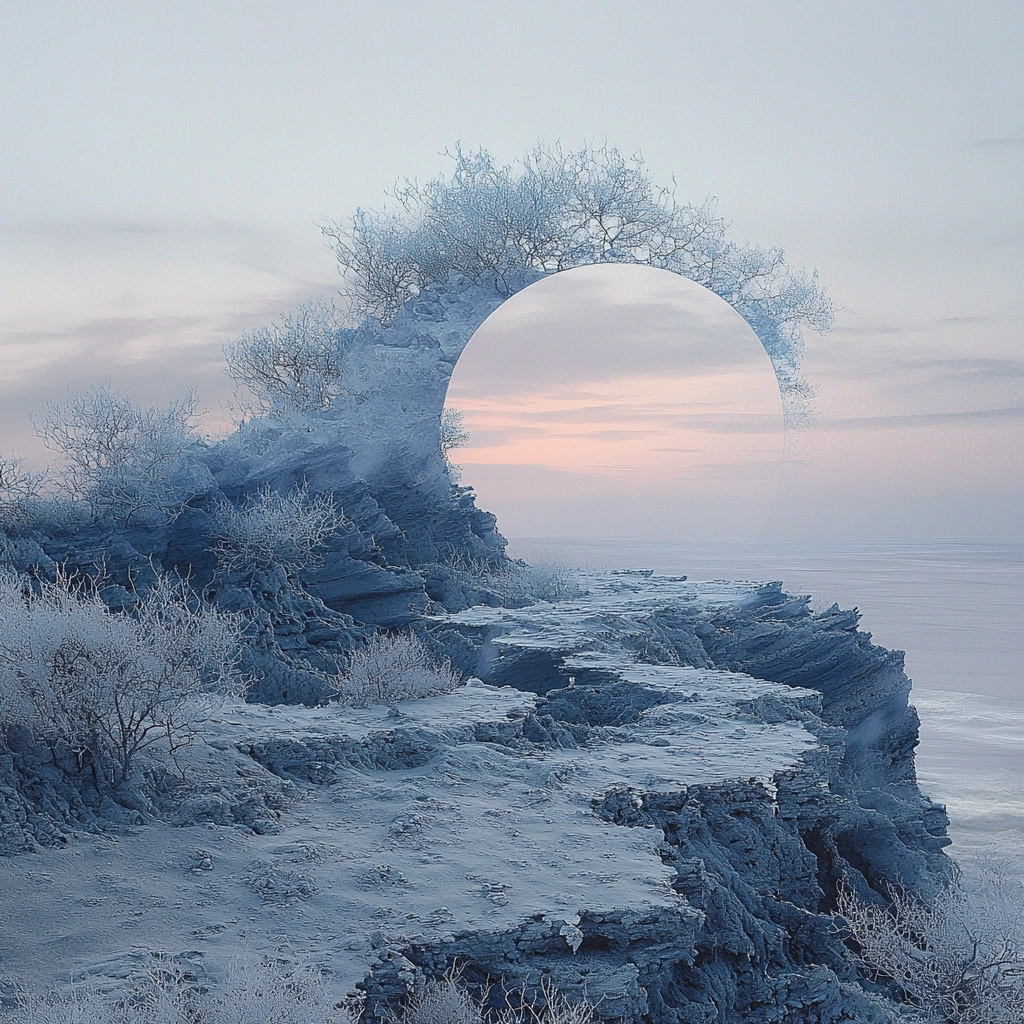 Soft color palette with smooth transitions and delicate gradients create a nuanced, otherworldly scene.