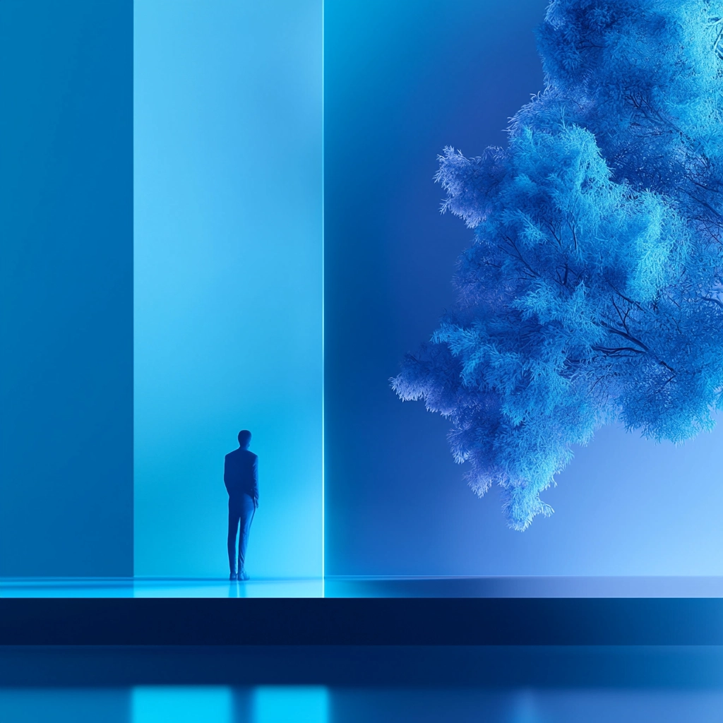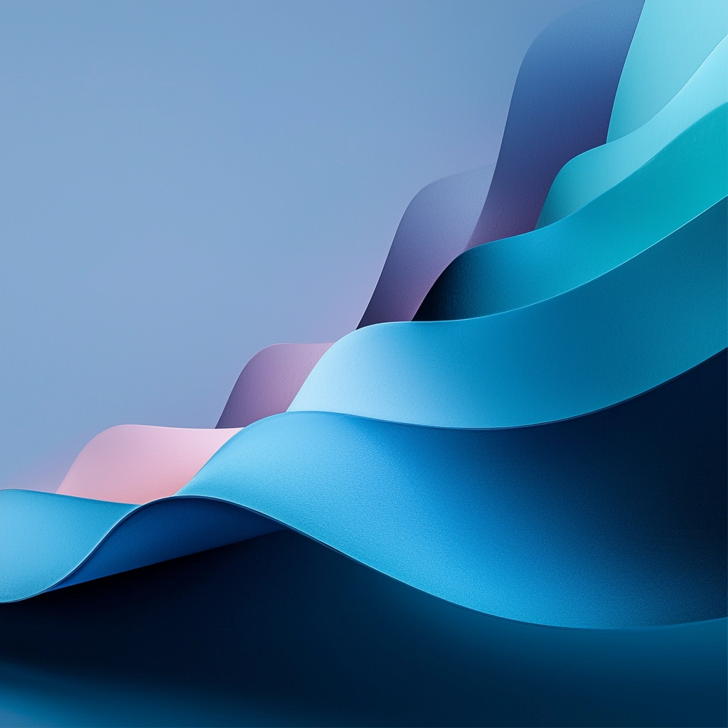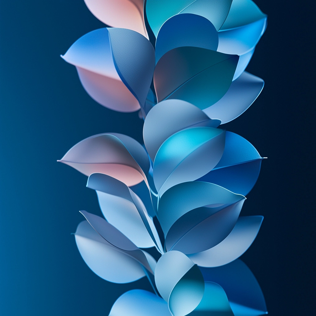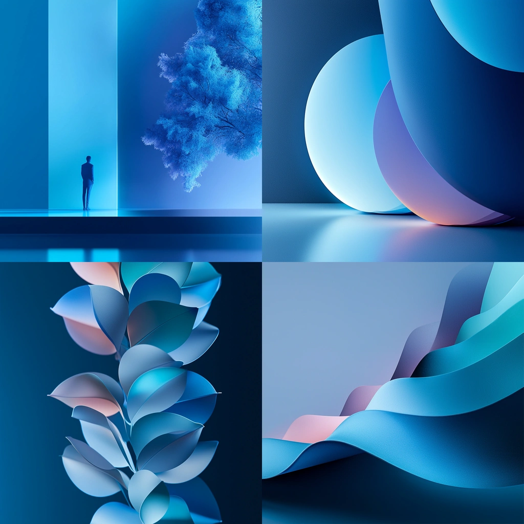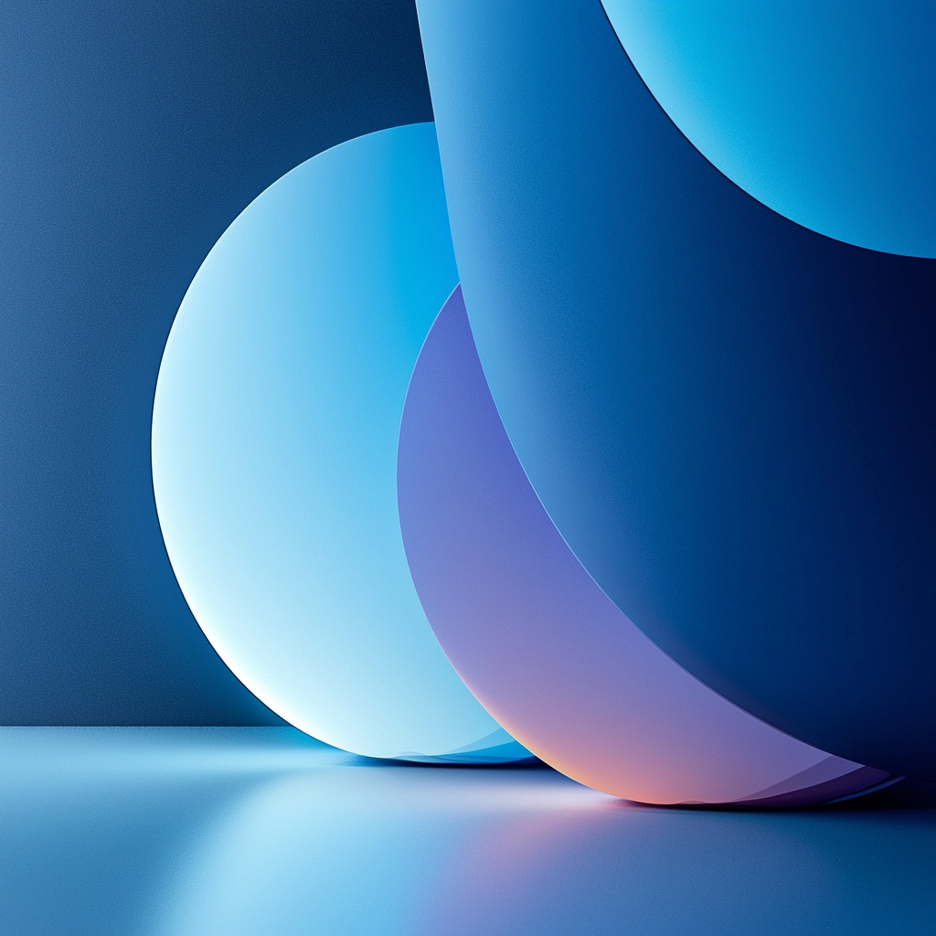 The lighting effects create a strong sense of depth and gradation. Colors are cool and blended seamlessly to provide a smooth texture. The space is defined through subtle lighting, enhancing the three-dimensional aspect of the forms.