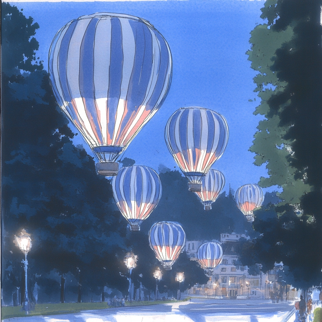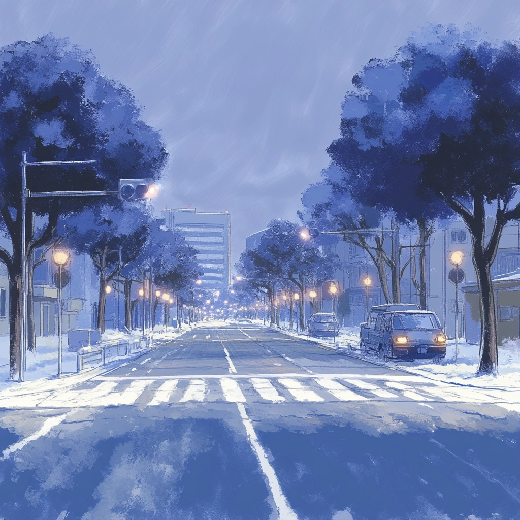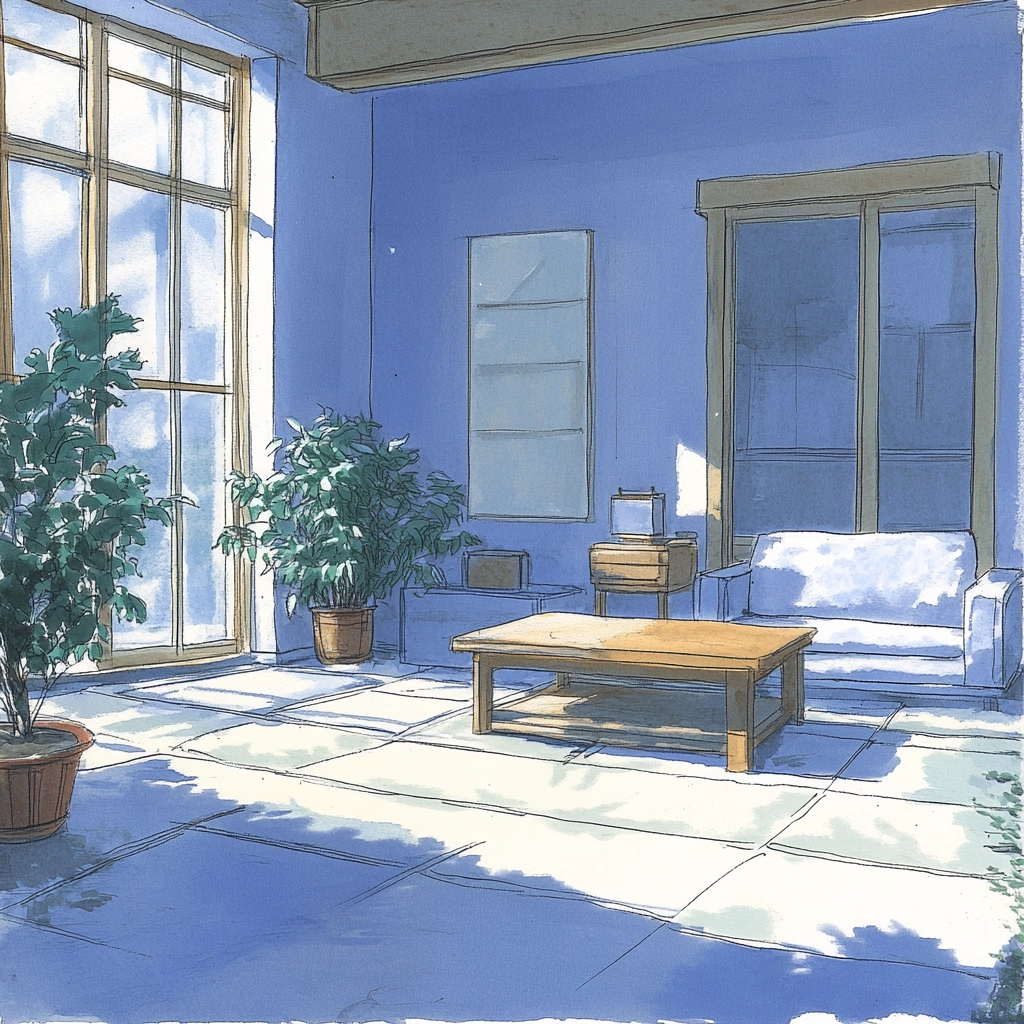 The composition features cool tones with an emphasis on blues and whites, creating a balanced layout of exterior and interior scenes.