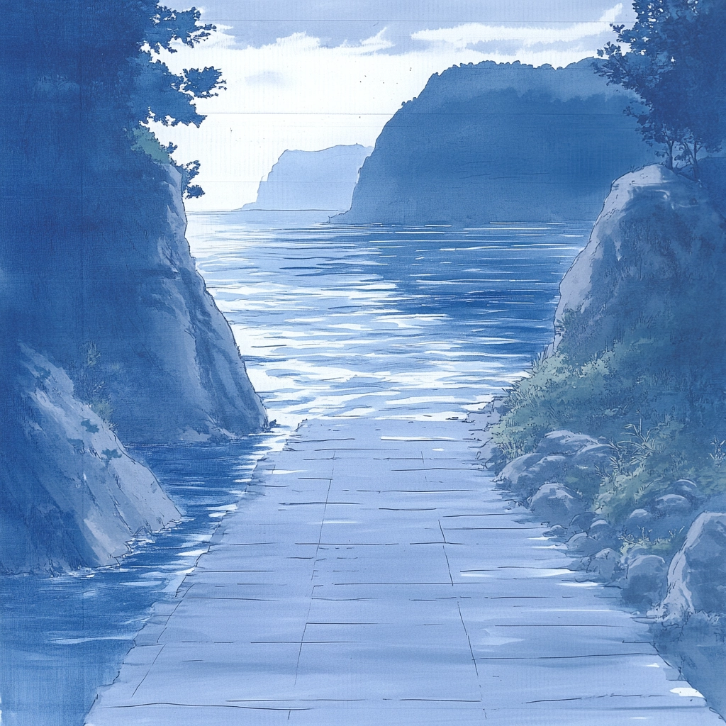 The lighting effects create sharp, defined shadows that enhance the spatial depth in each scene. Cool blue tones dominate, lending a crisp, clear feeling across the compositions. The textures are rendered with smooth transitions, giving surfaces a cohesive and detailed appearance.