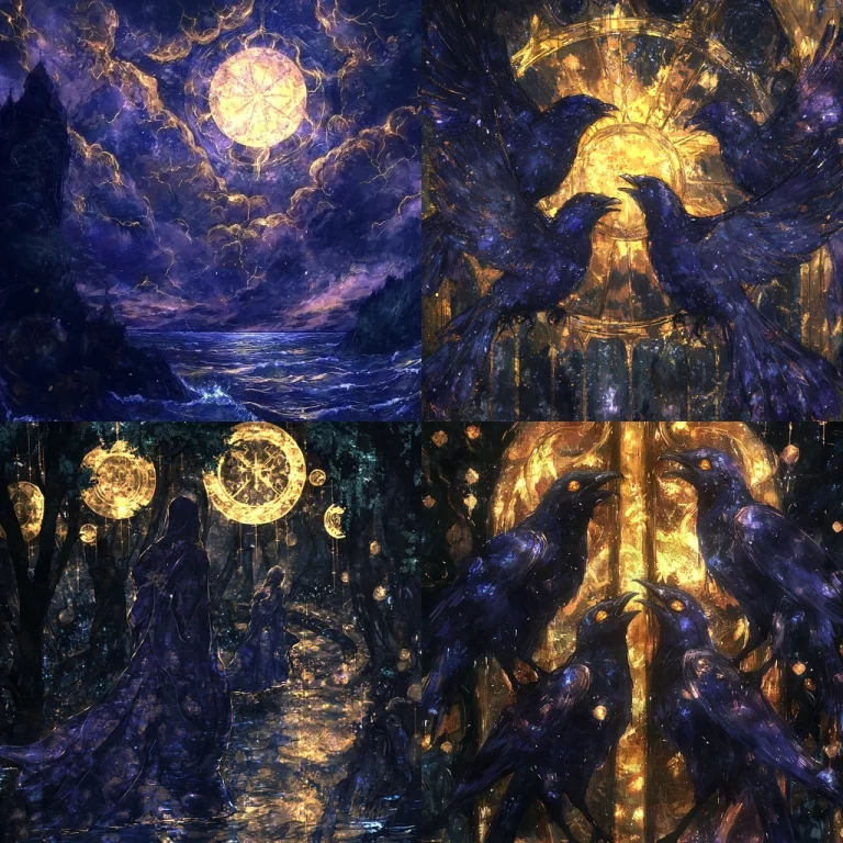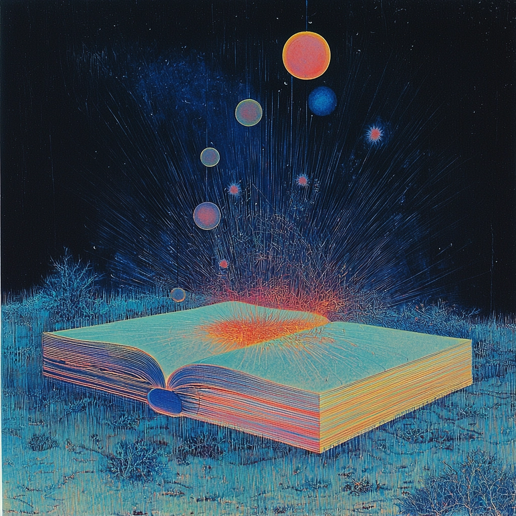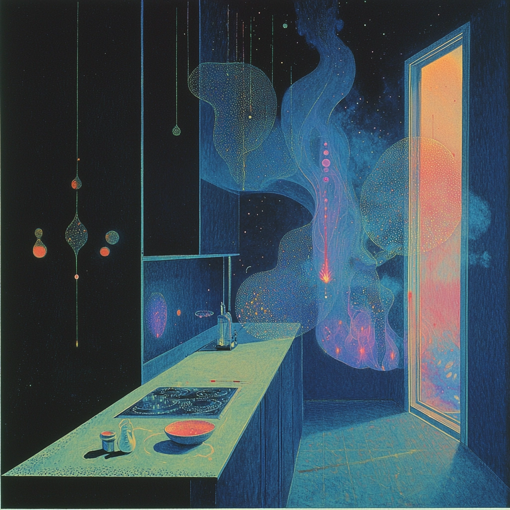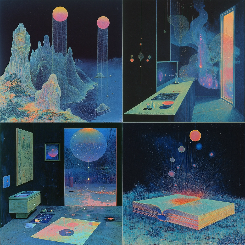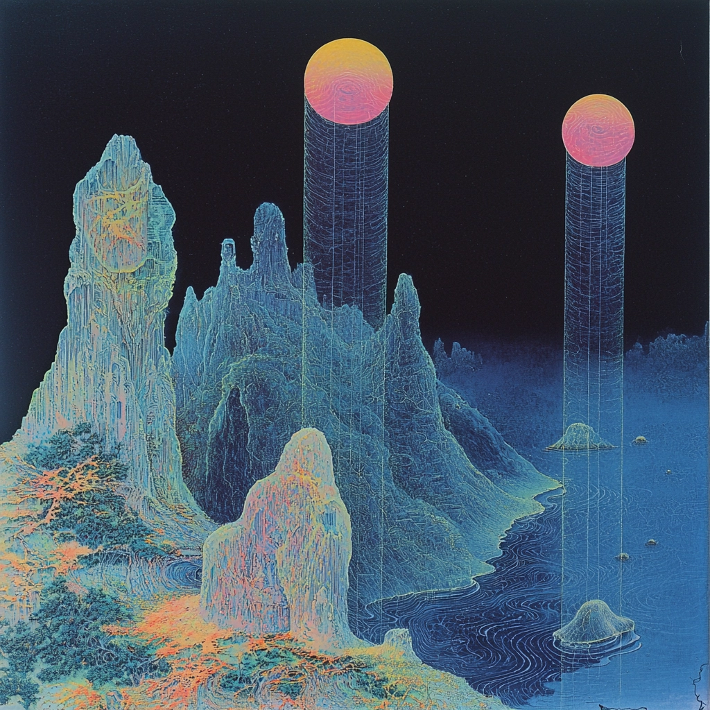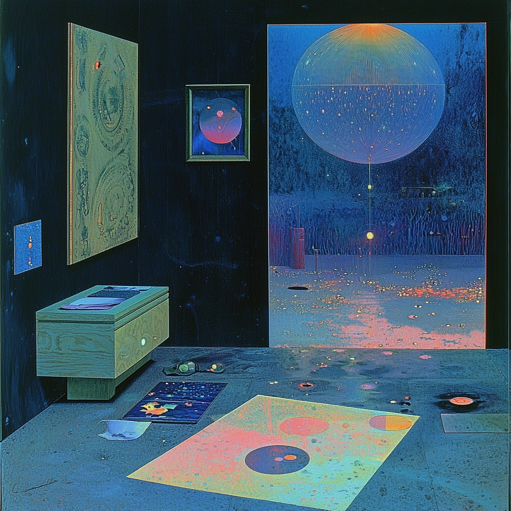 The lighting is stark with a contrast between bright neon elements and deep shades, creating a surreal atmosphere. The colors are vivid, dominated by dark blue and cyan tones. Spatial elements are flat but suggest depth through layered hues and textures.