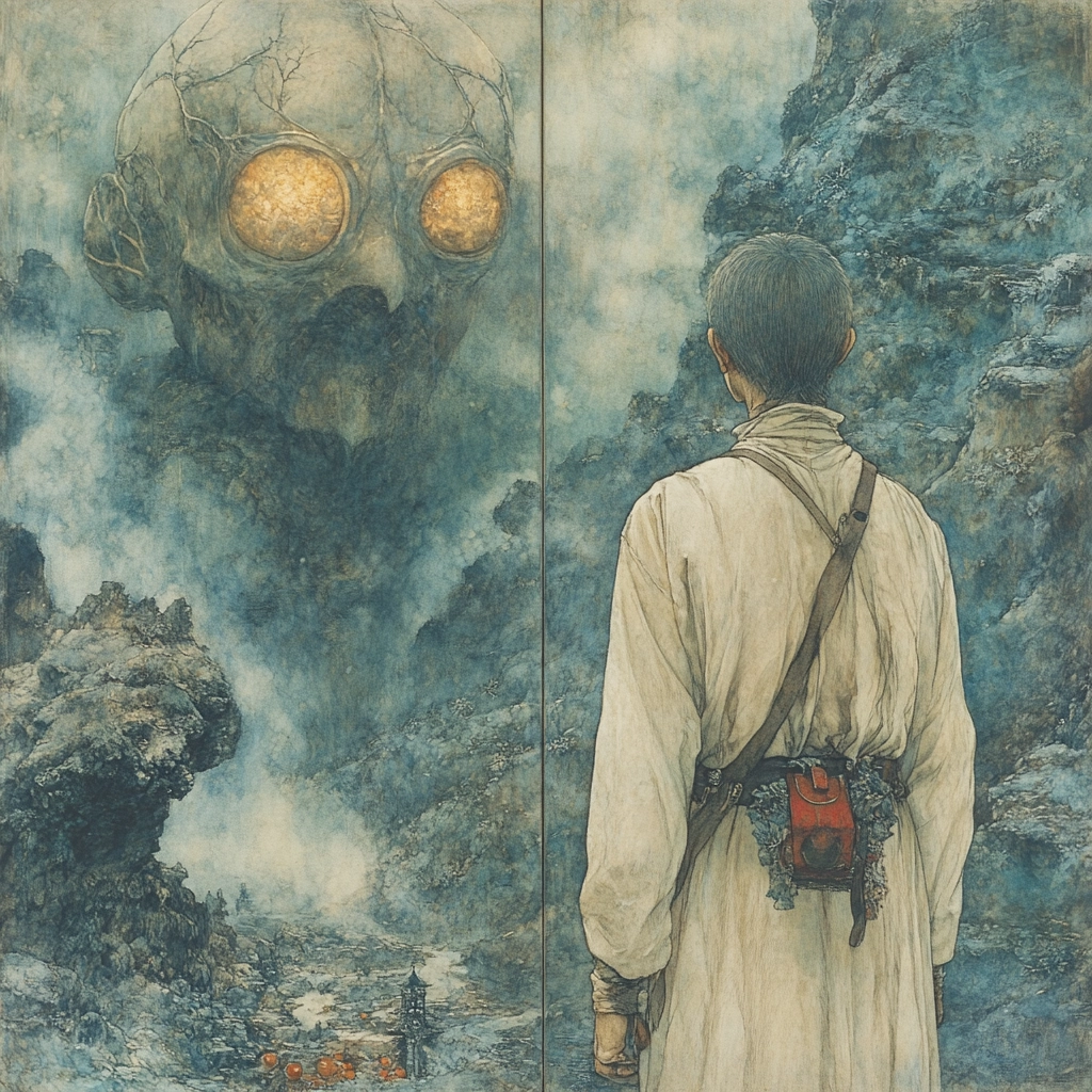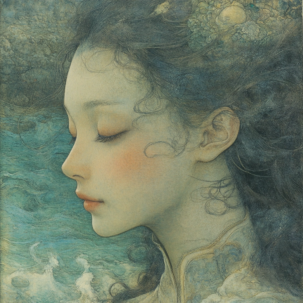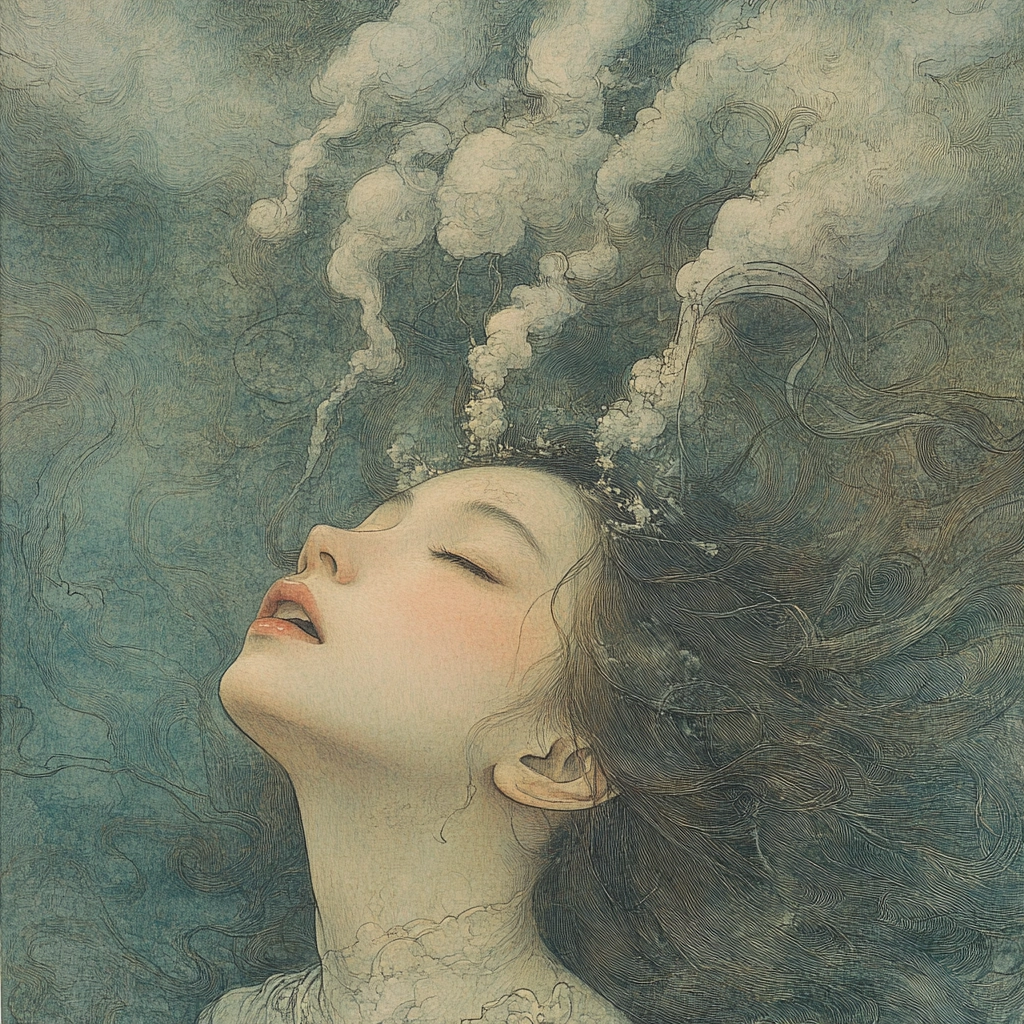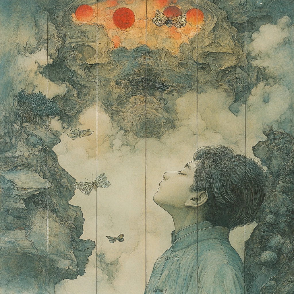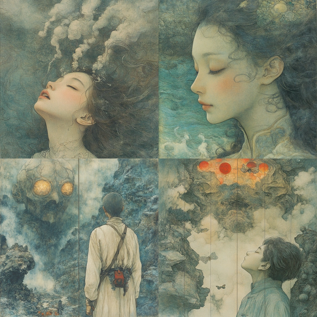 Soft, diffuse lighting complements a palette dominated by dark blues, grays, and beiges. Textures are layered and complex, creating a sense of depth and surreal spatial arrangement.