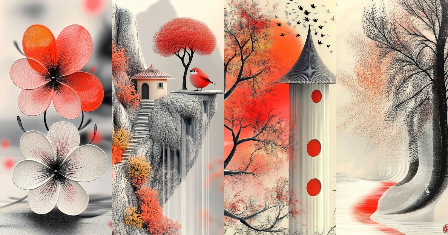 A sophisticated interplay of red and gray tones with delicate shading and precise outlines.