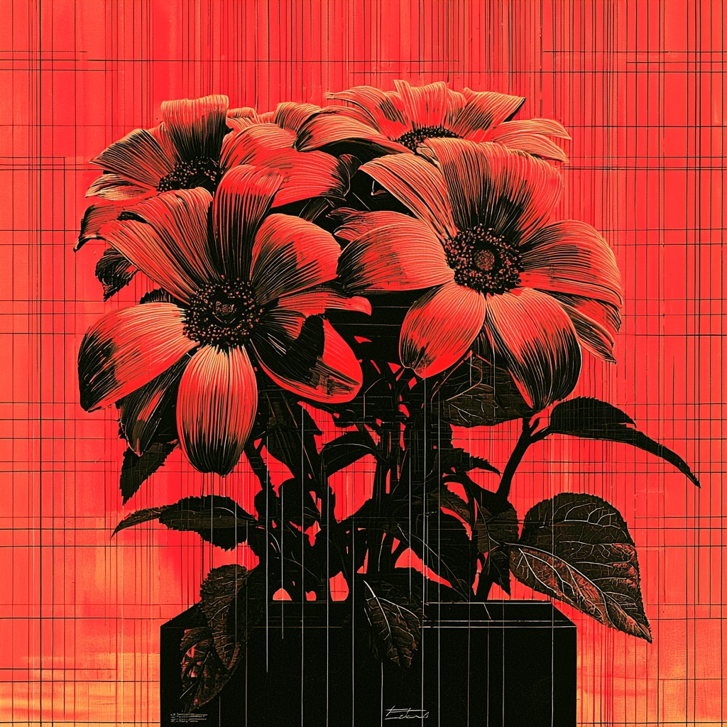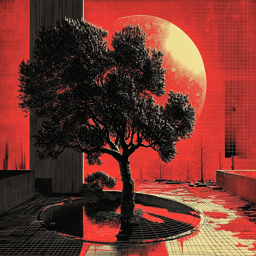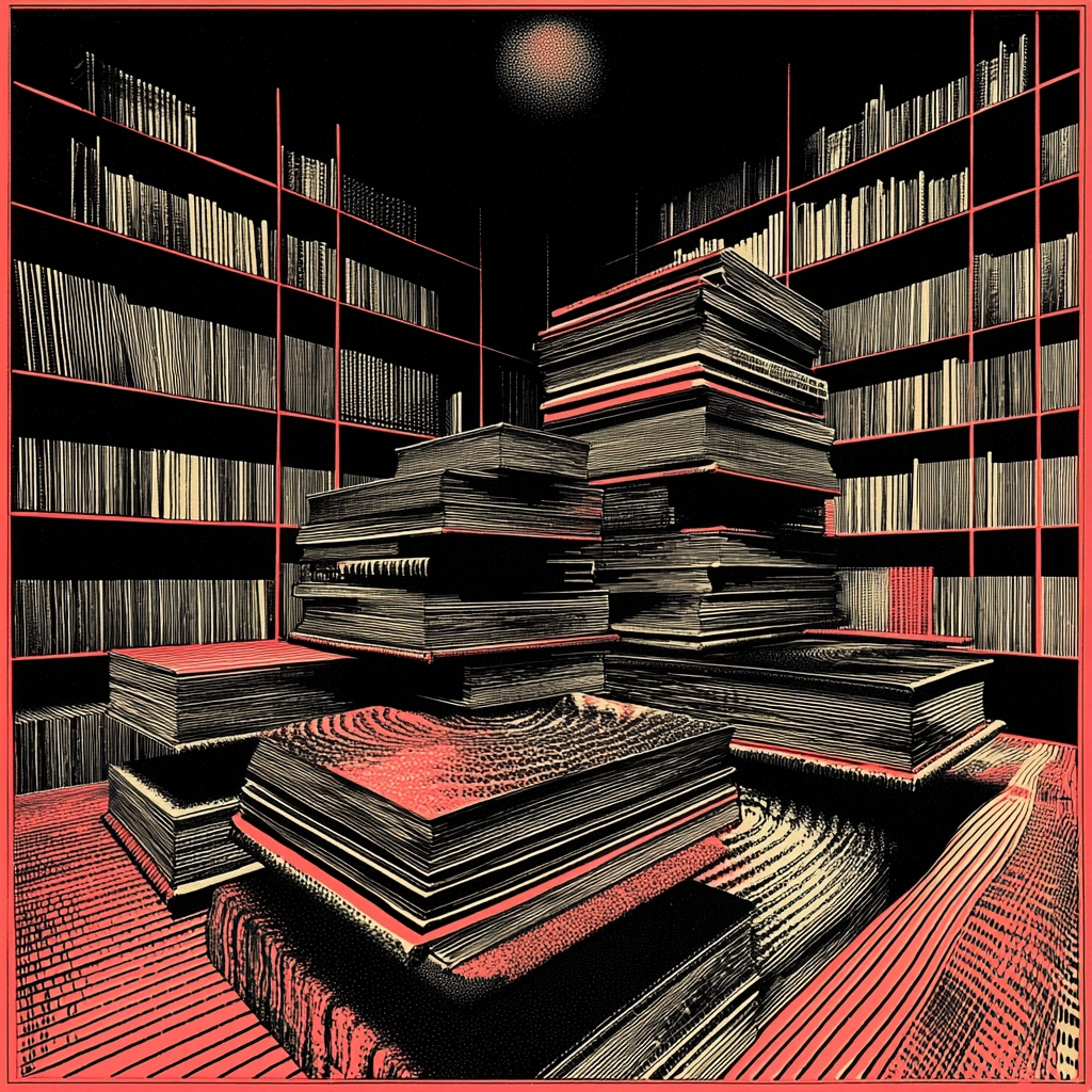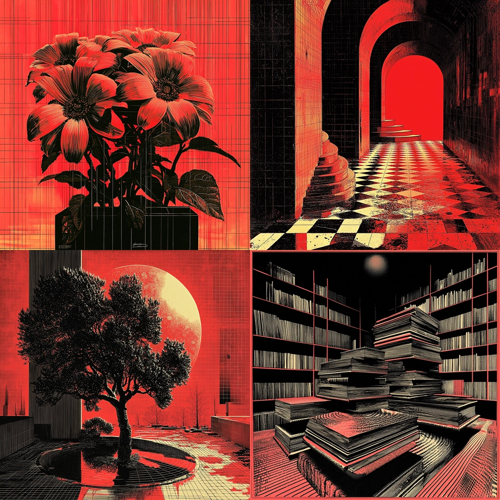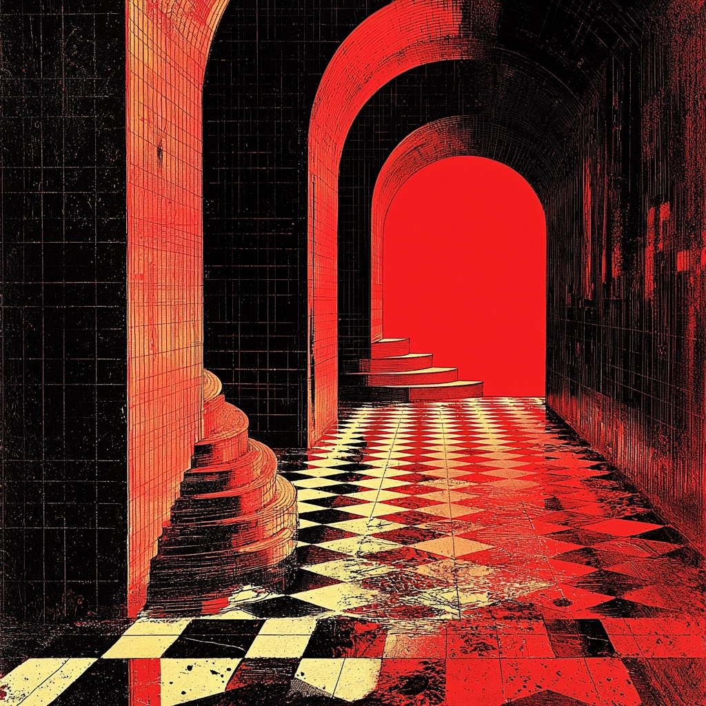 Dramatic lighting enhances sharp contrasts between red and black, creating a sense of depth and volume. The texture varies from smooth to rough, emphasizing the geometric complexity and accentuating spatial dimensions.