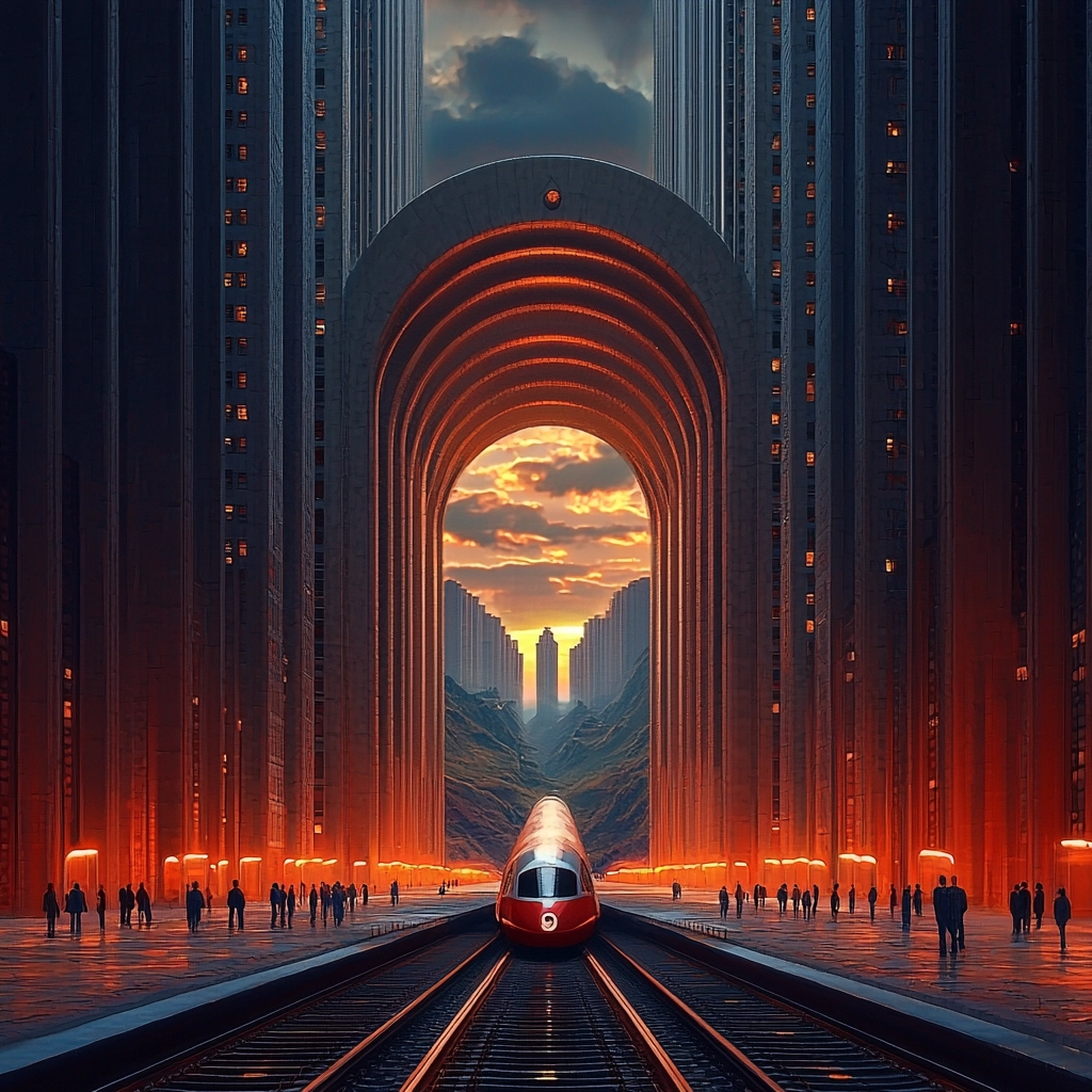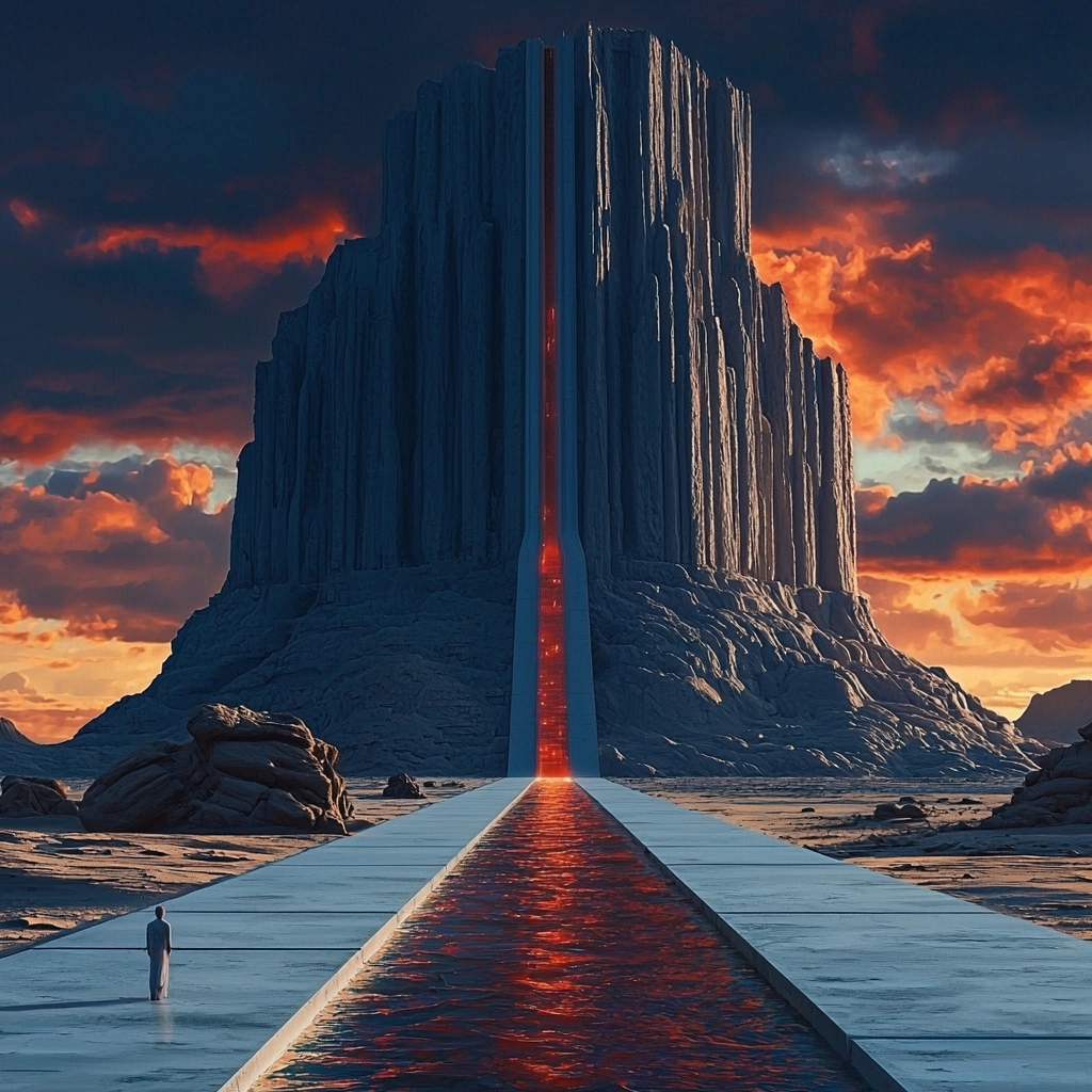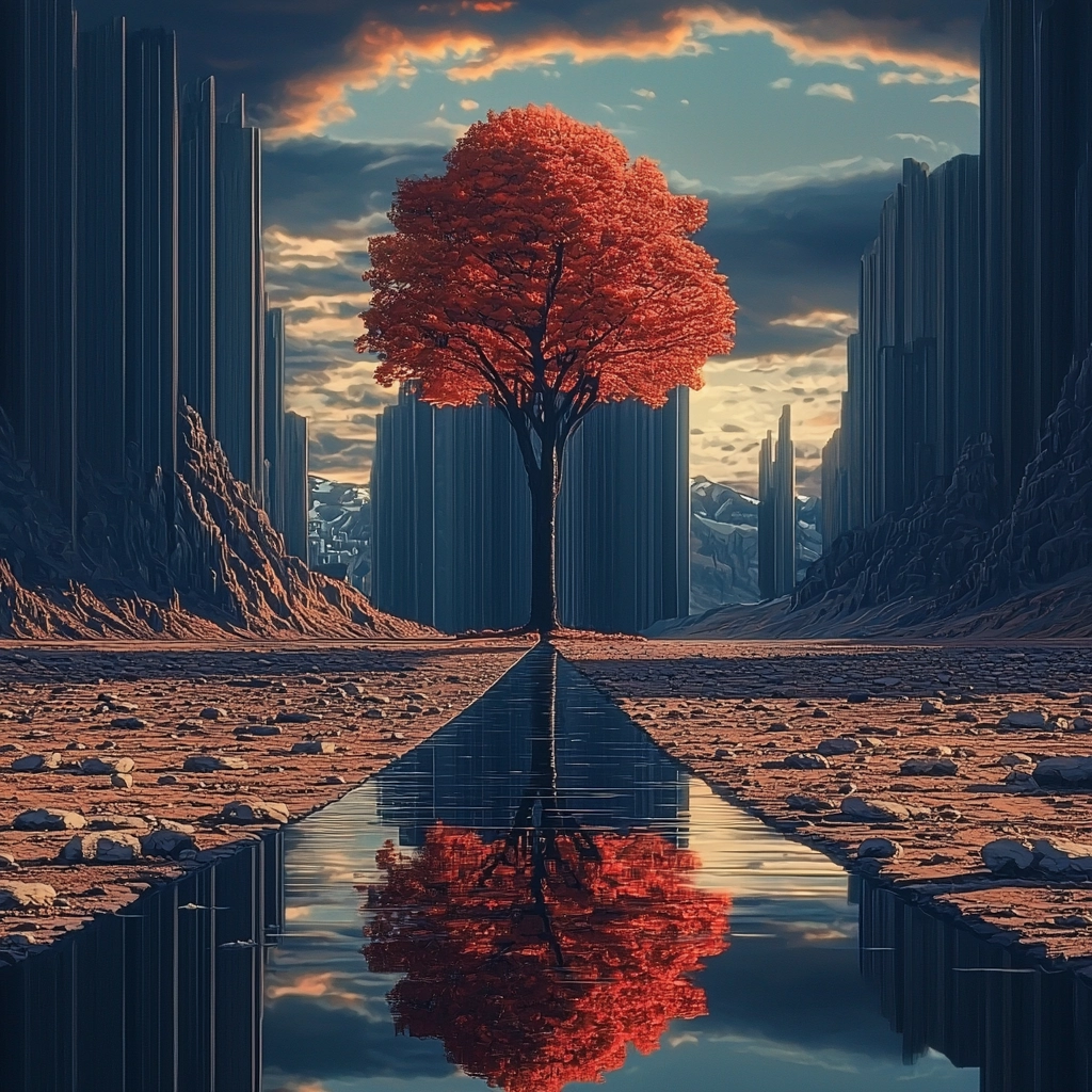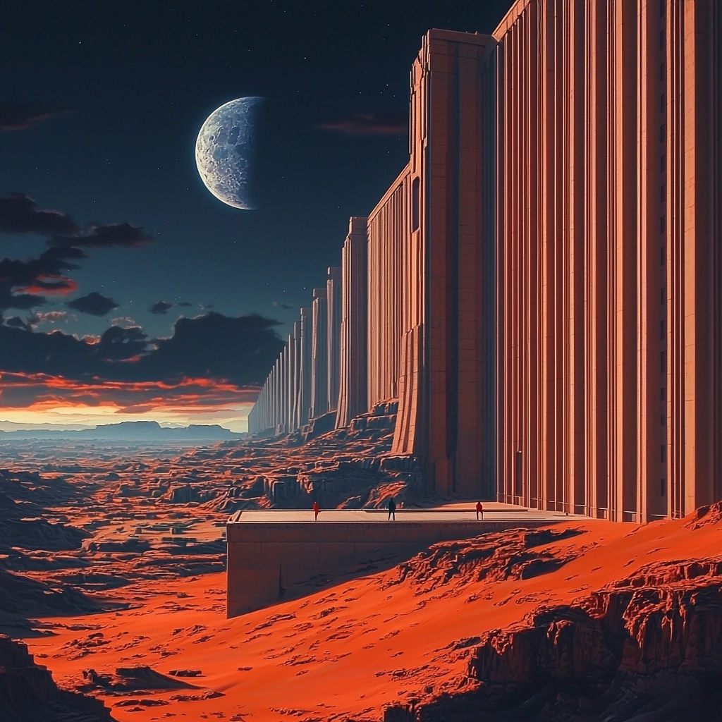 Dramatic lighting contrasts highlight structured geometries, with deep red tones accentuating the forms against a dark blue backdrop, creating a robust sense of depth and dimension.