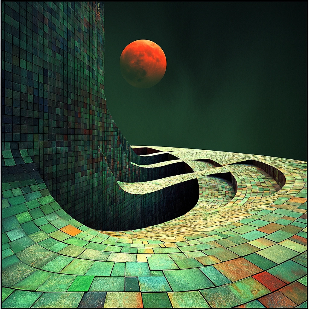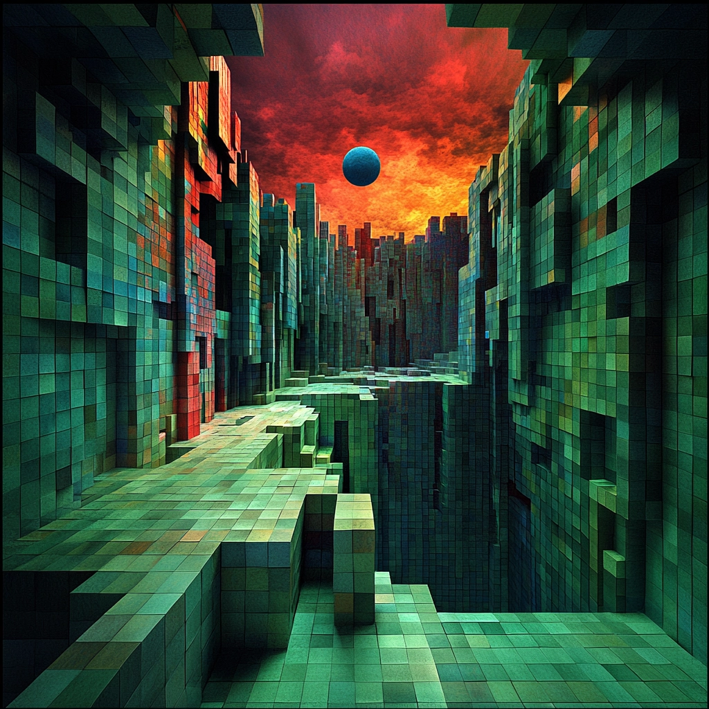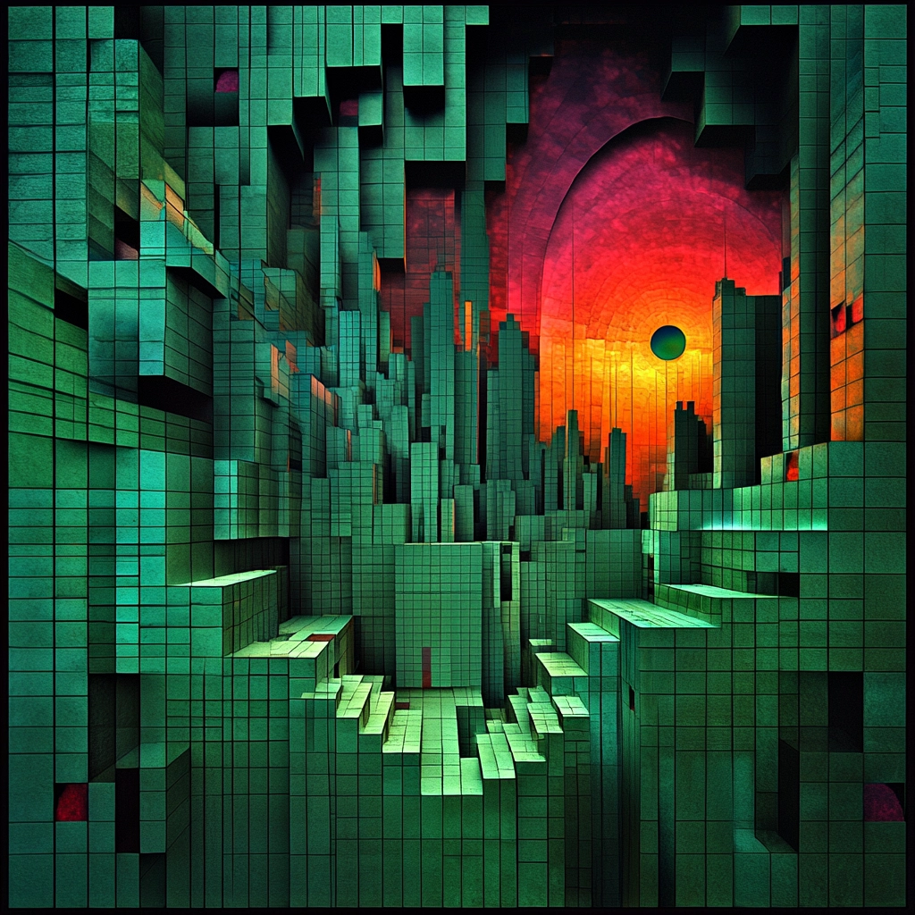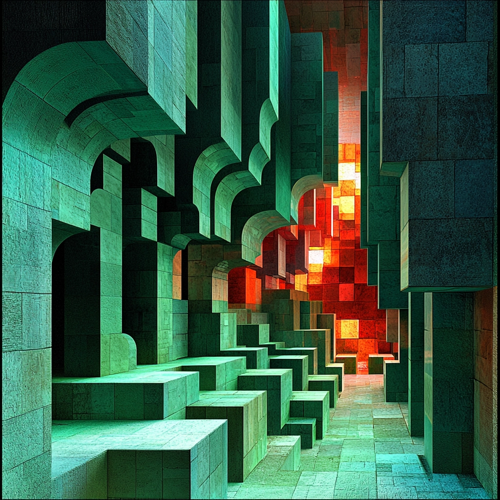 Complex structures illuminate with vibrant colors, featuring intricate geometric forms. Strong shadows and sharp highlights define a layered spatial depth enriched with grid textures.