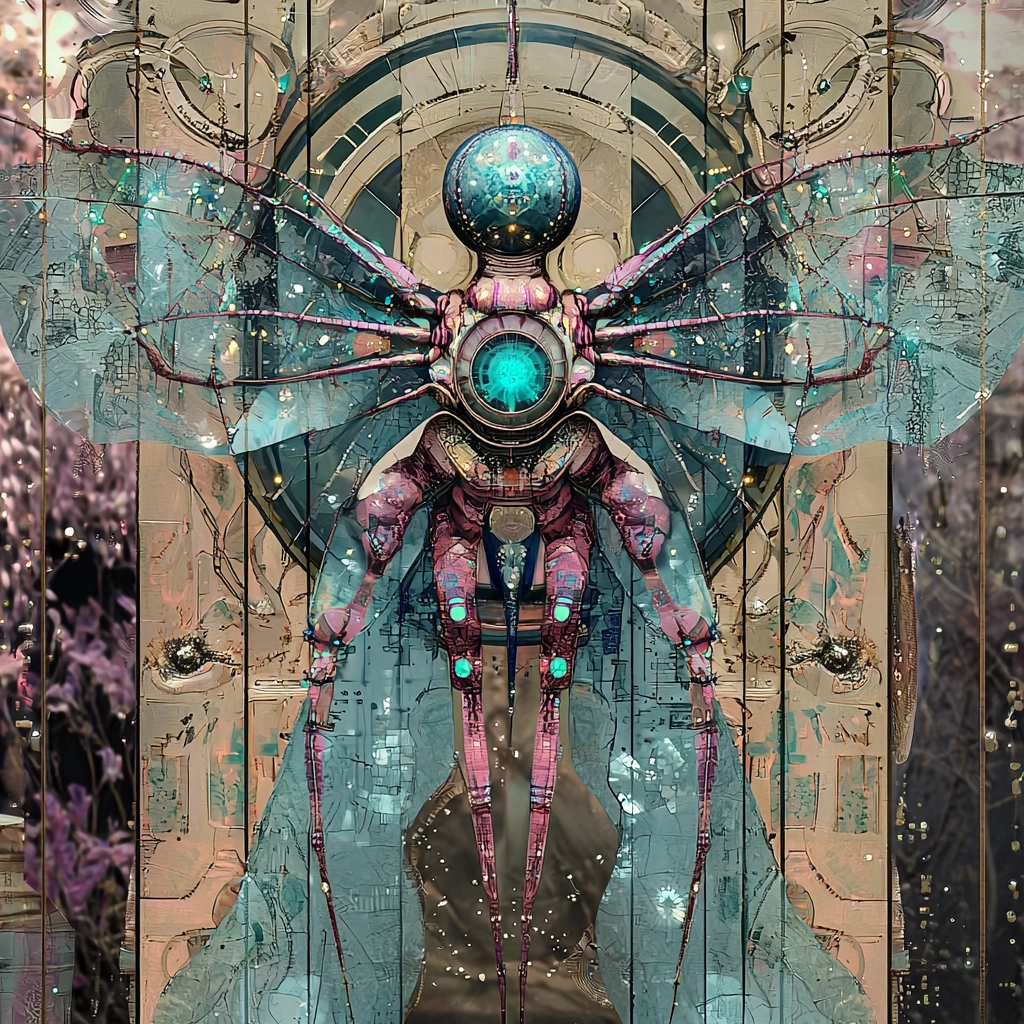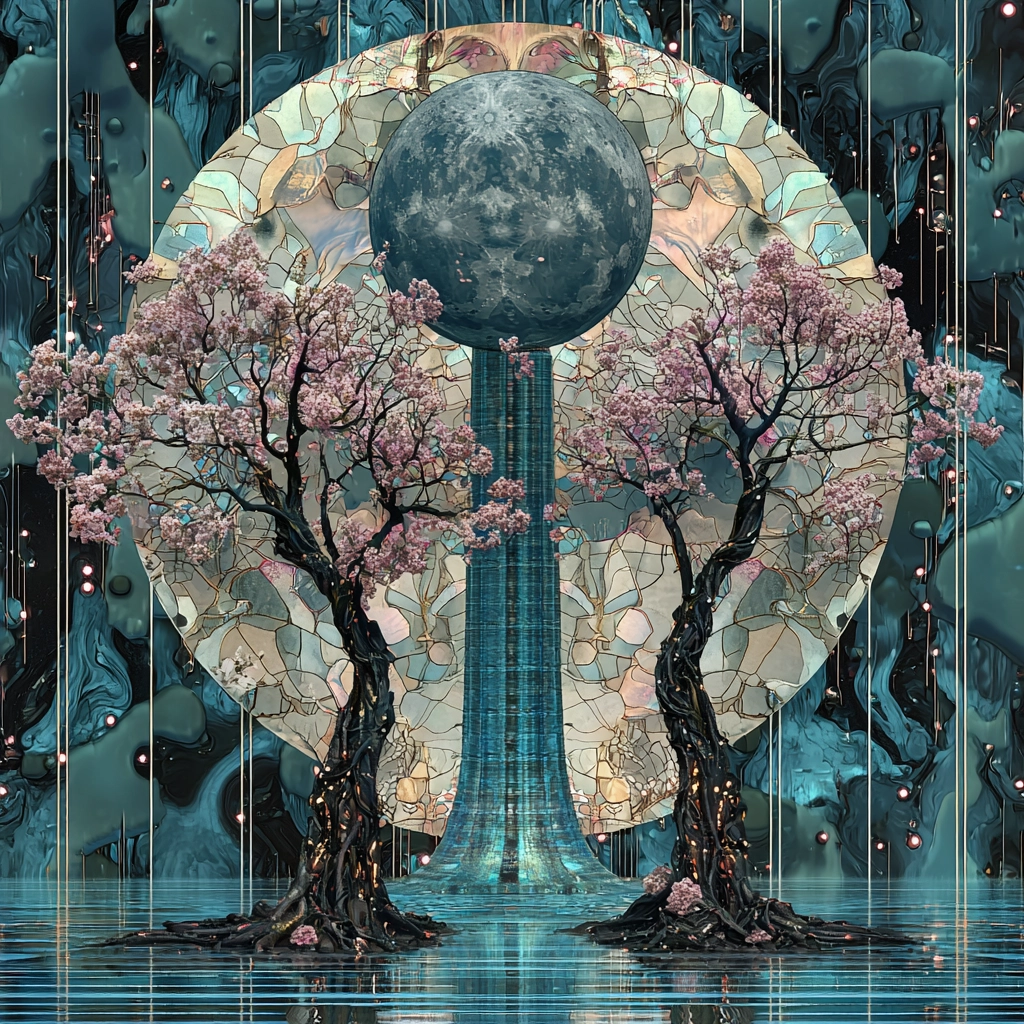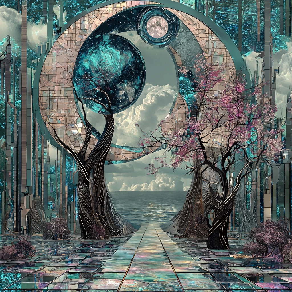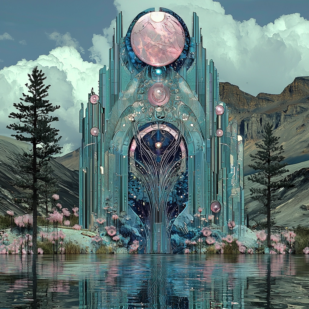 The use of cyan and pink creates a striking lighting effect that enhances reflective qualities. The textures are carefully detailed, offering a sense of depth. Geometric patterns contribute to spatial complexity, inviting the viewer into an imaginative world.