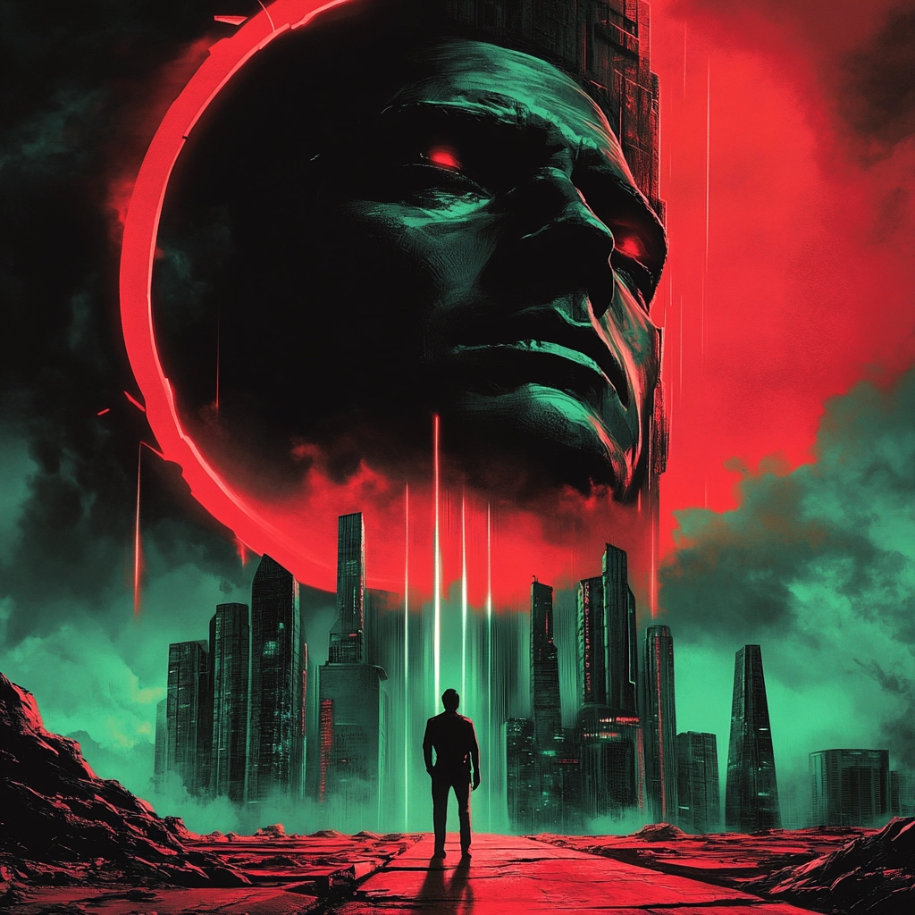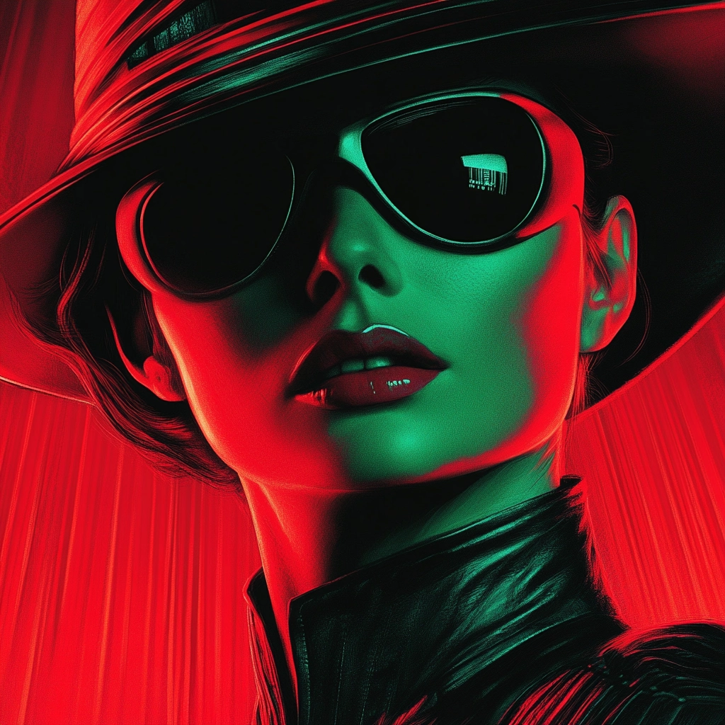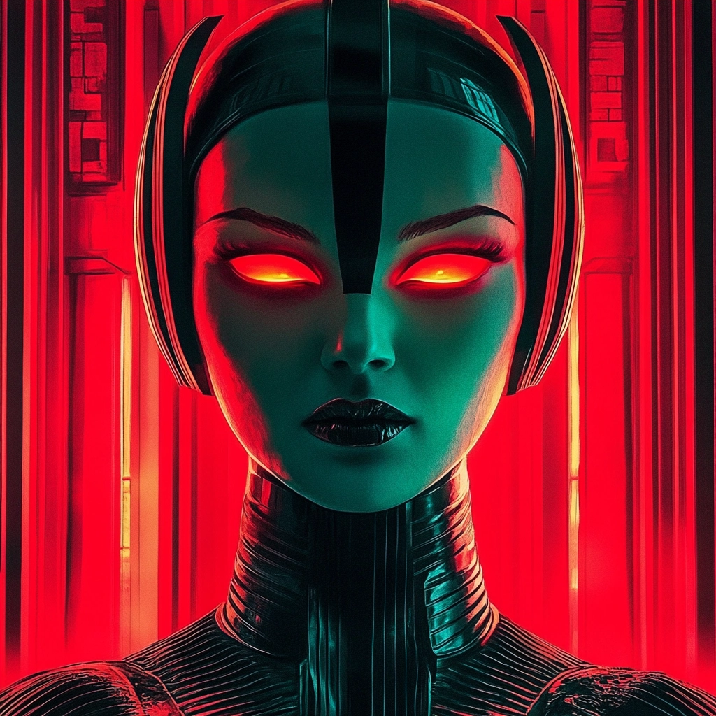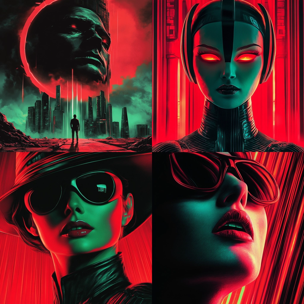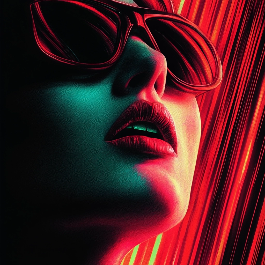 Sharp contrasts are created through dominant red tones underlined by bright cyan highlights.
