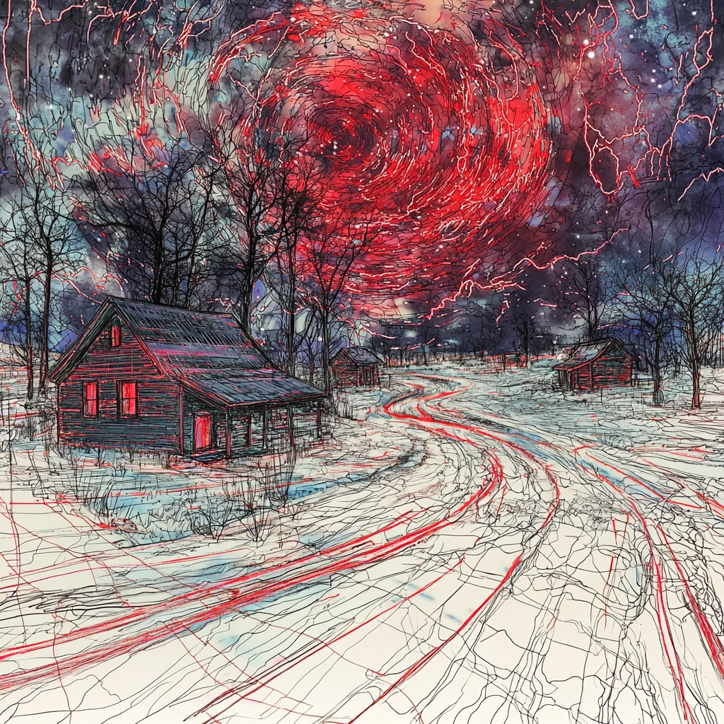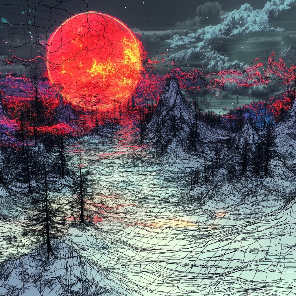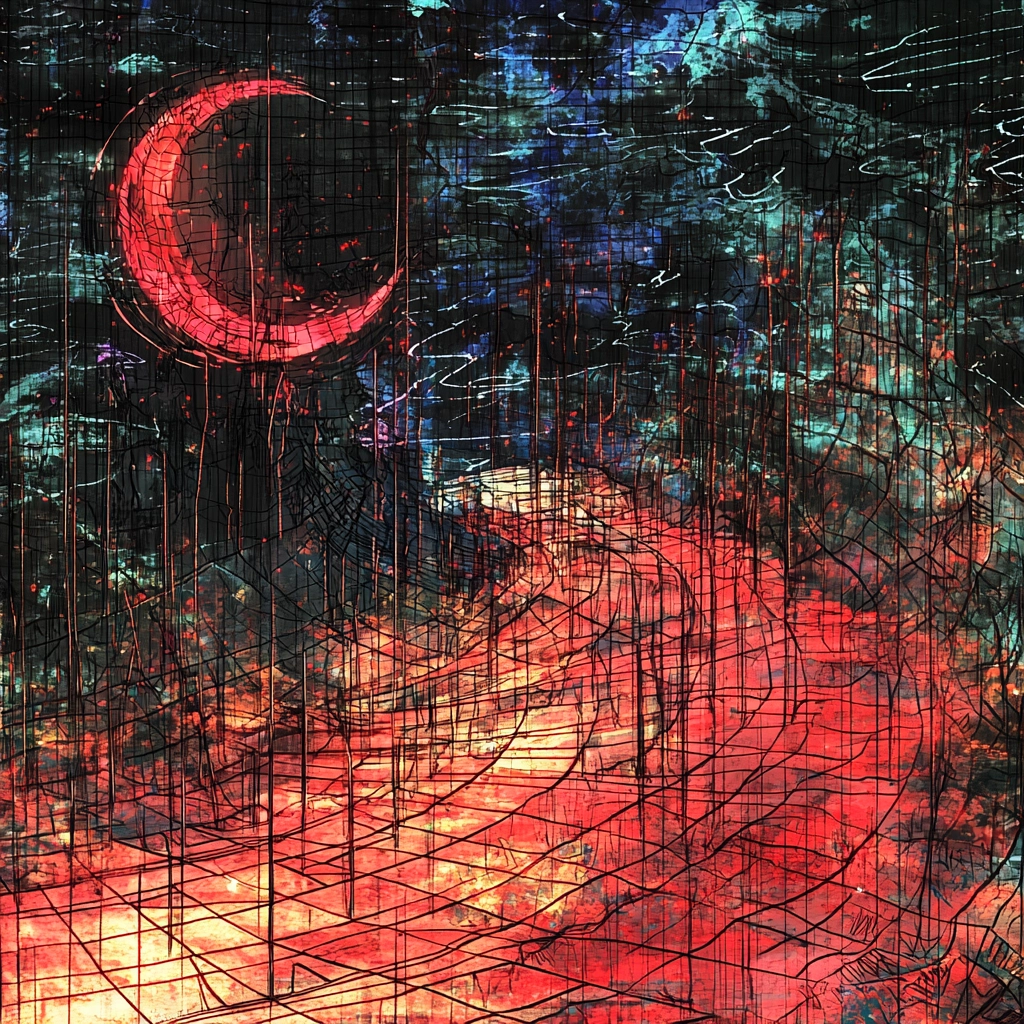 Intense lighting accents the textures, creating depth and movement within the complex, overlapping layers. Vibrant color contrasts form a dynamic sense of space, drawing the eye across the sweeping compositions.