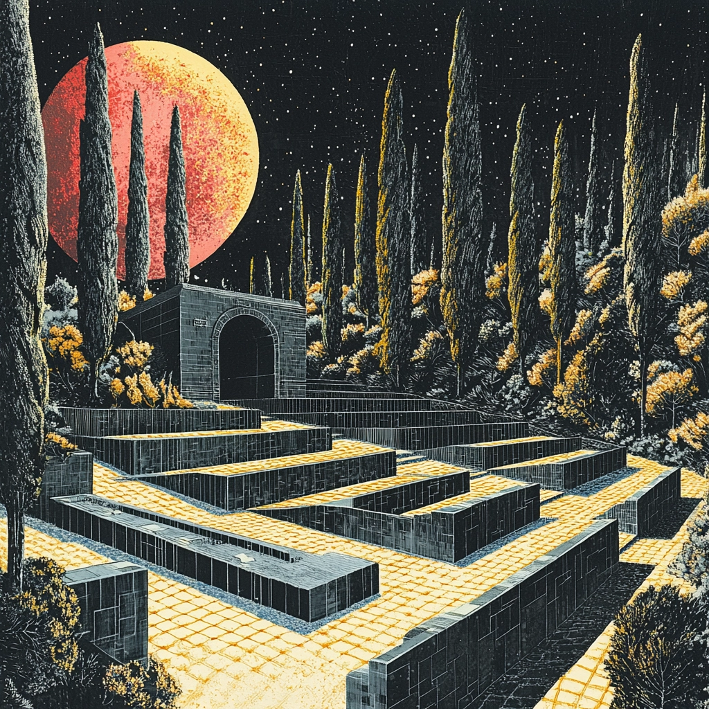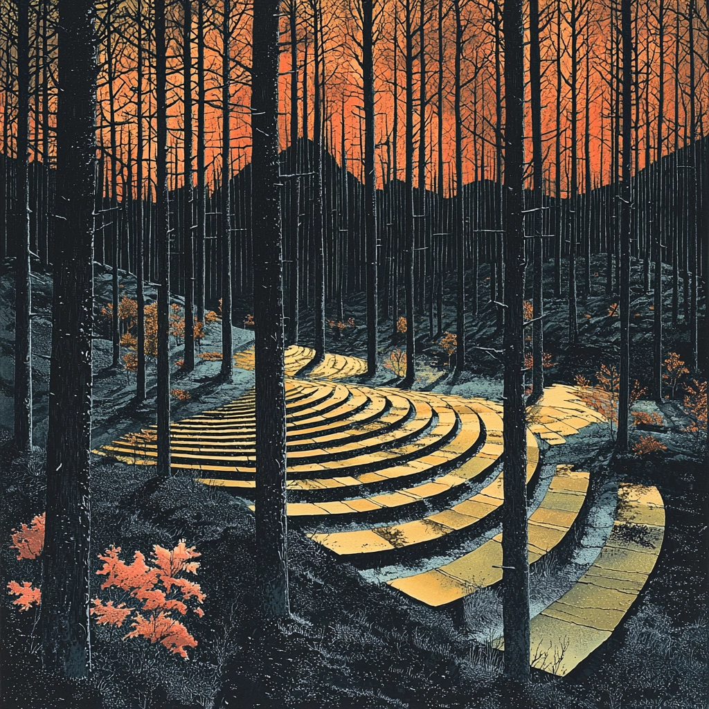 Intense lighting contrasts highlight the spatial complexity, with the interplay of dark blue and gold creating distinct shapes and textures. The use of orange accents punctuates the composition, enhancing depth and bringing out subtleties in the scenery, thus crafting an intricate visual narrative.