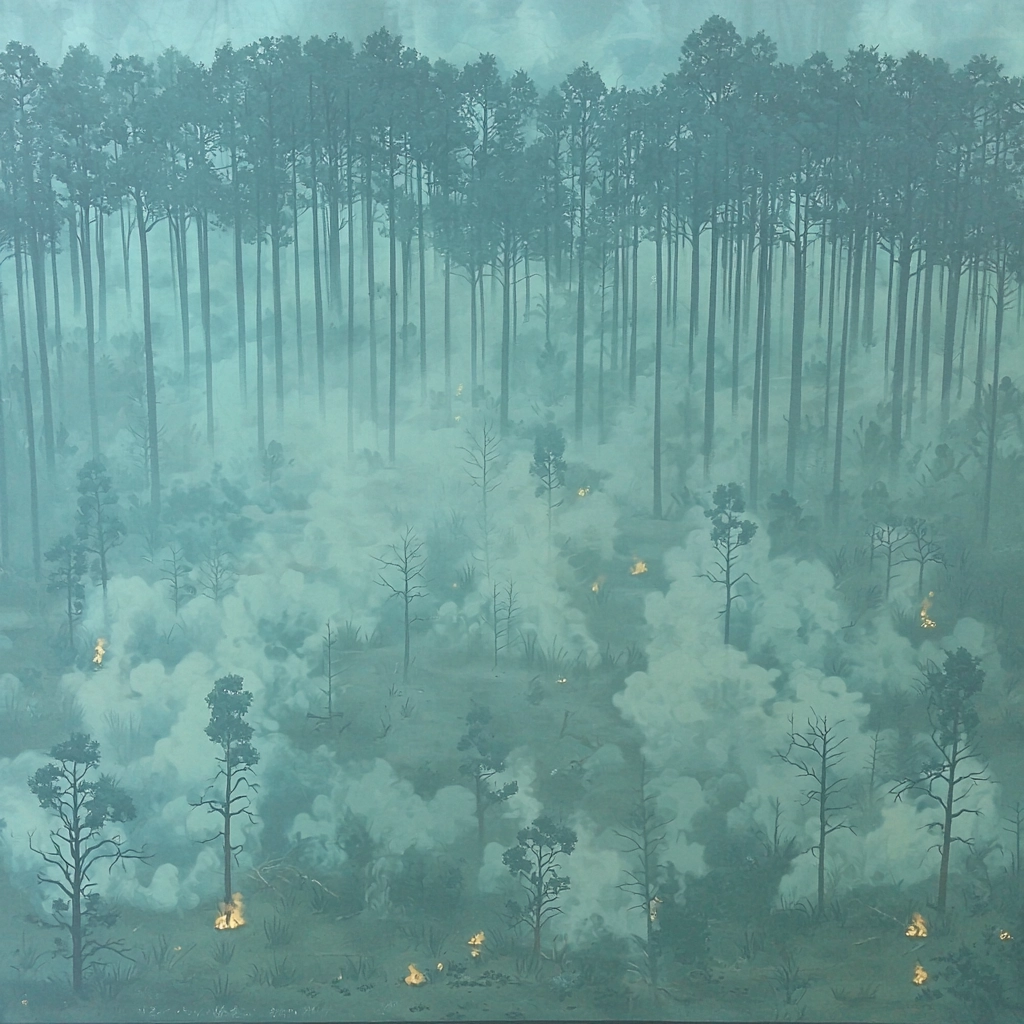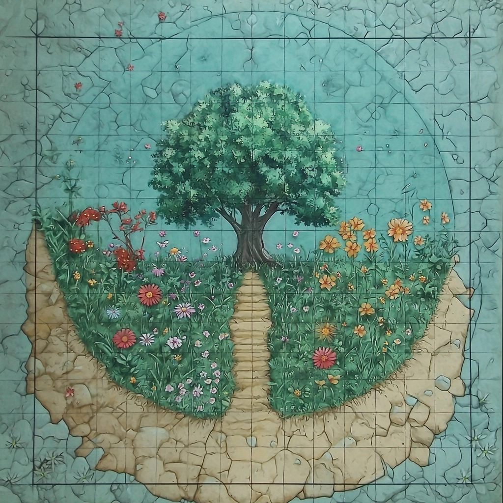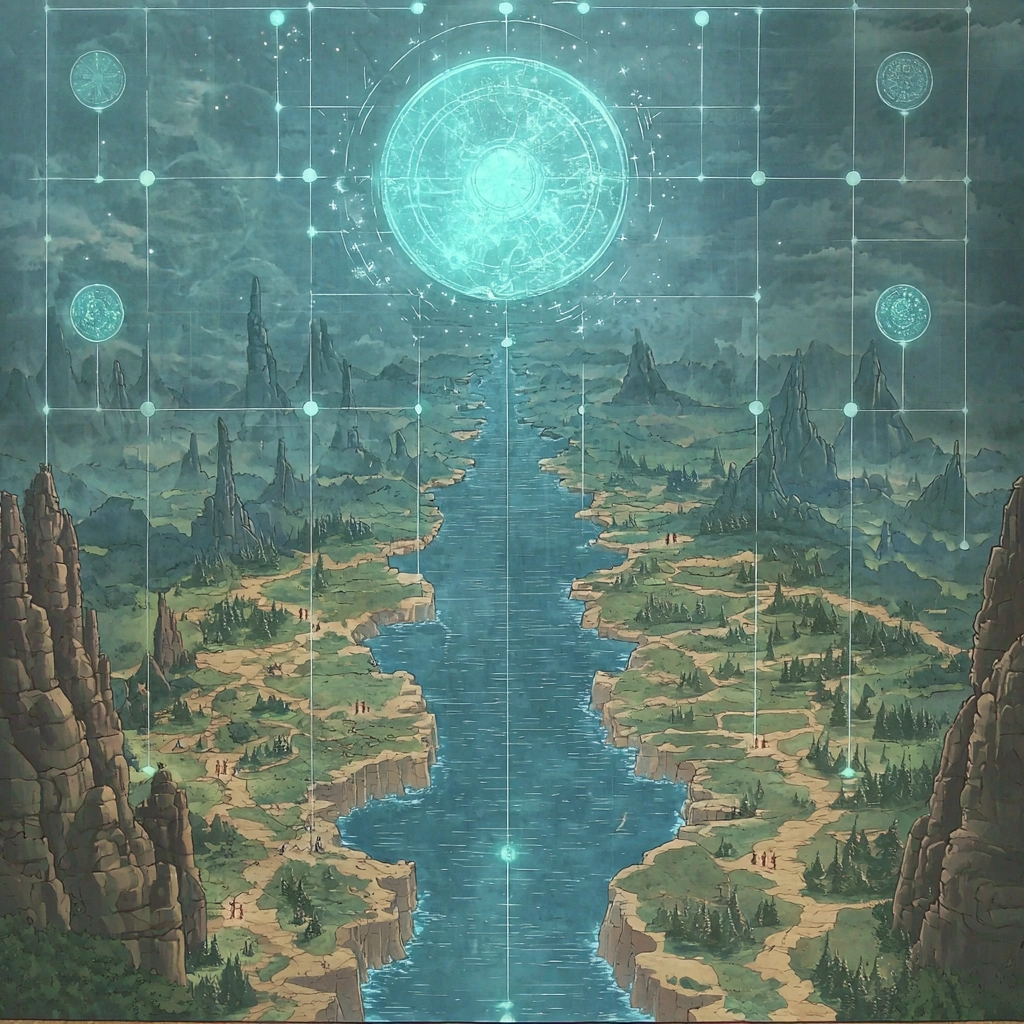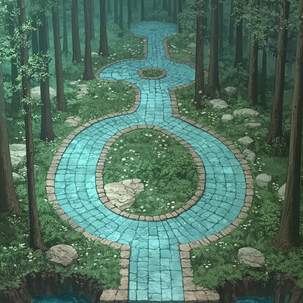 The artwork features a dominant cyan palette, with grid-like patterns creating a sense of structured depth. Lighting is soft, highlighting intricate details, while smooth textures offer visual tranquility.