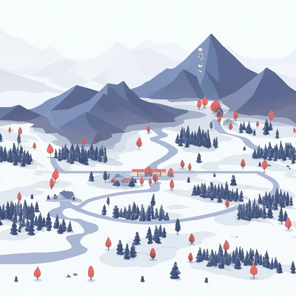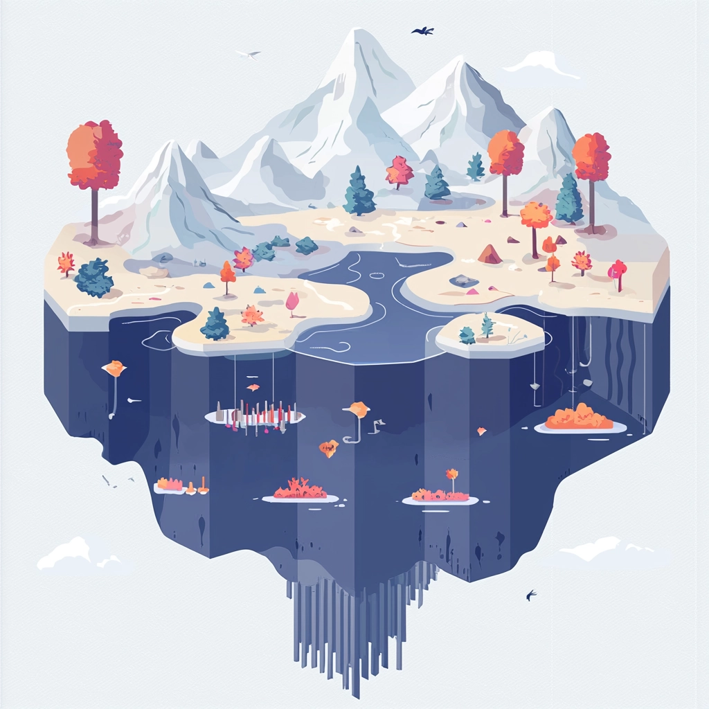 There is a prominent use of indirect lighting creating gentle gradients and a soft transition between elements. The colors are subtly harmonious, while the spatial arrangement gives depth through varied perspectives and scales. Texture remains minimal and smooth, contributing to a flat appearance.
