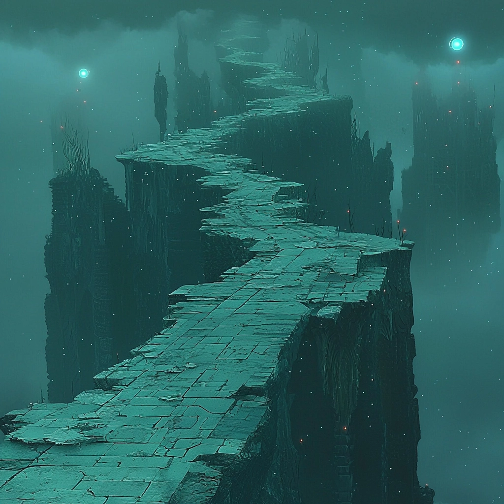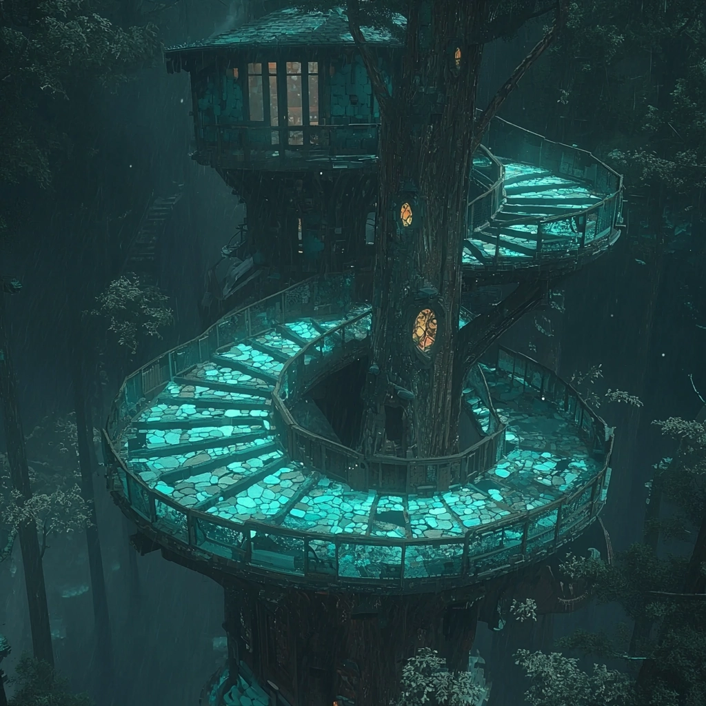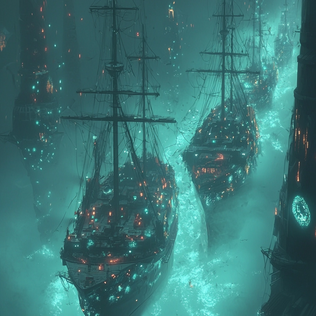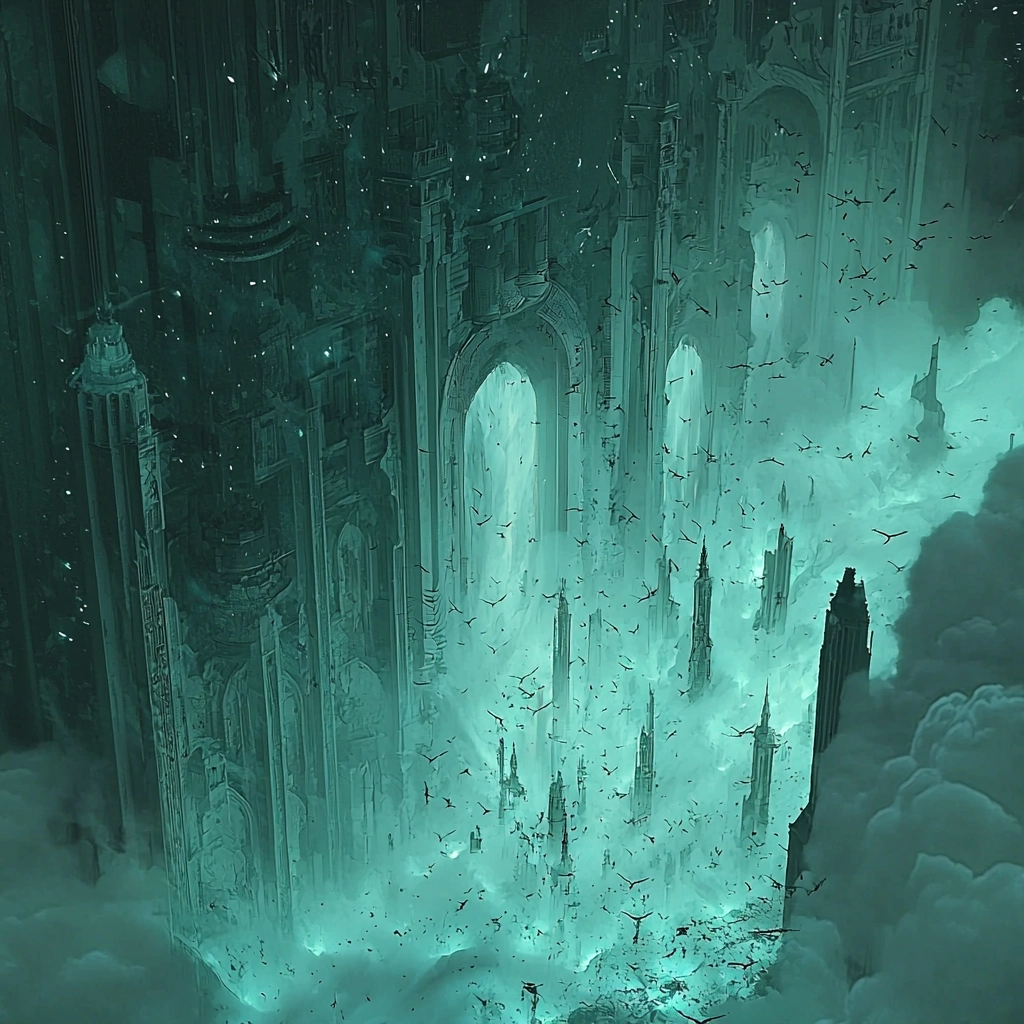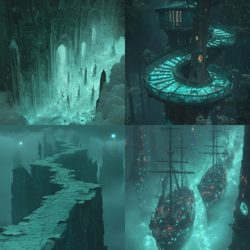 Illuminated glow effects are caused by cyan against a darkened backdrop, with shadows creating a sense of depth. Textures are smooth yet intricately detailed, conveying a semi-transparent, misty ambiance that enhances the spatial depth.
