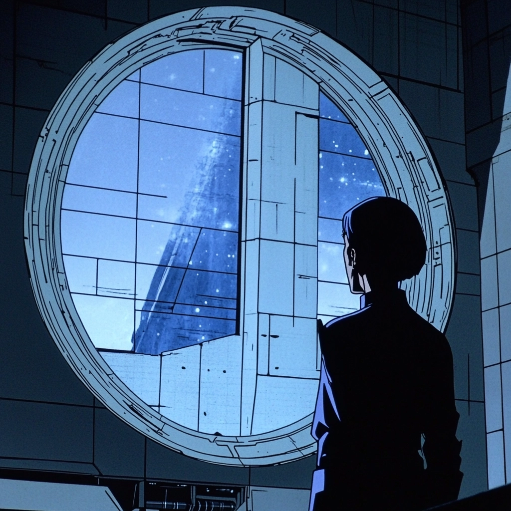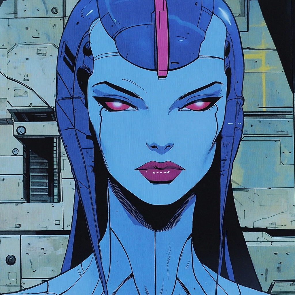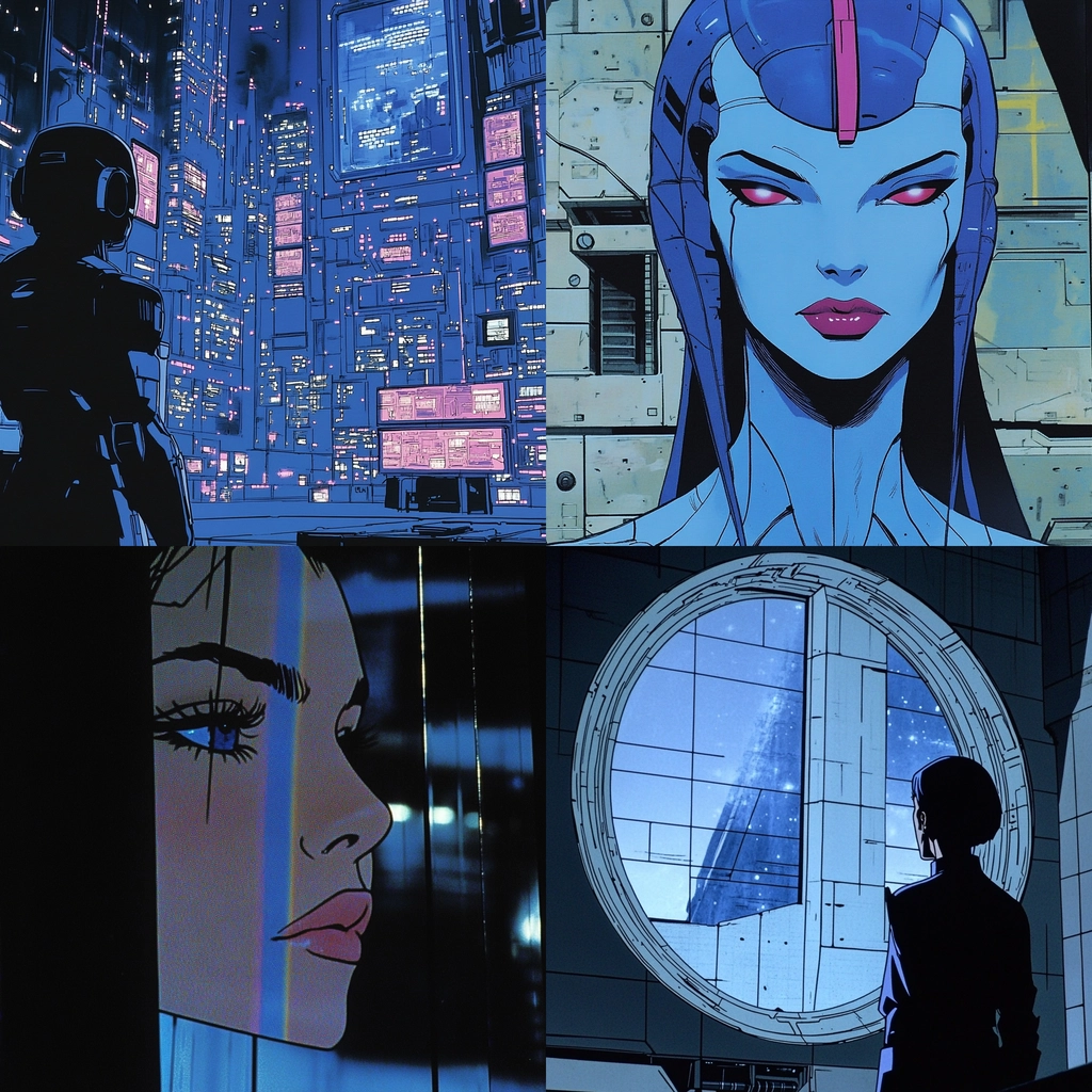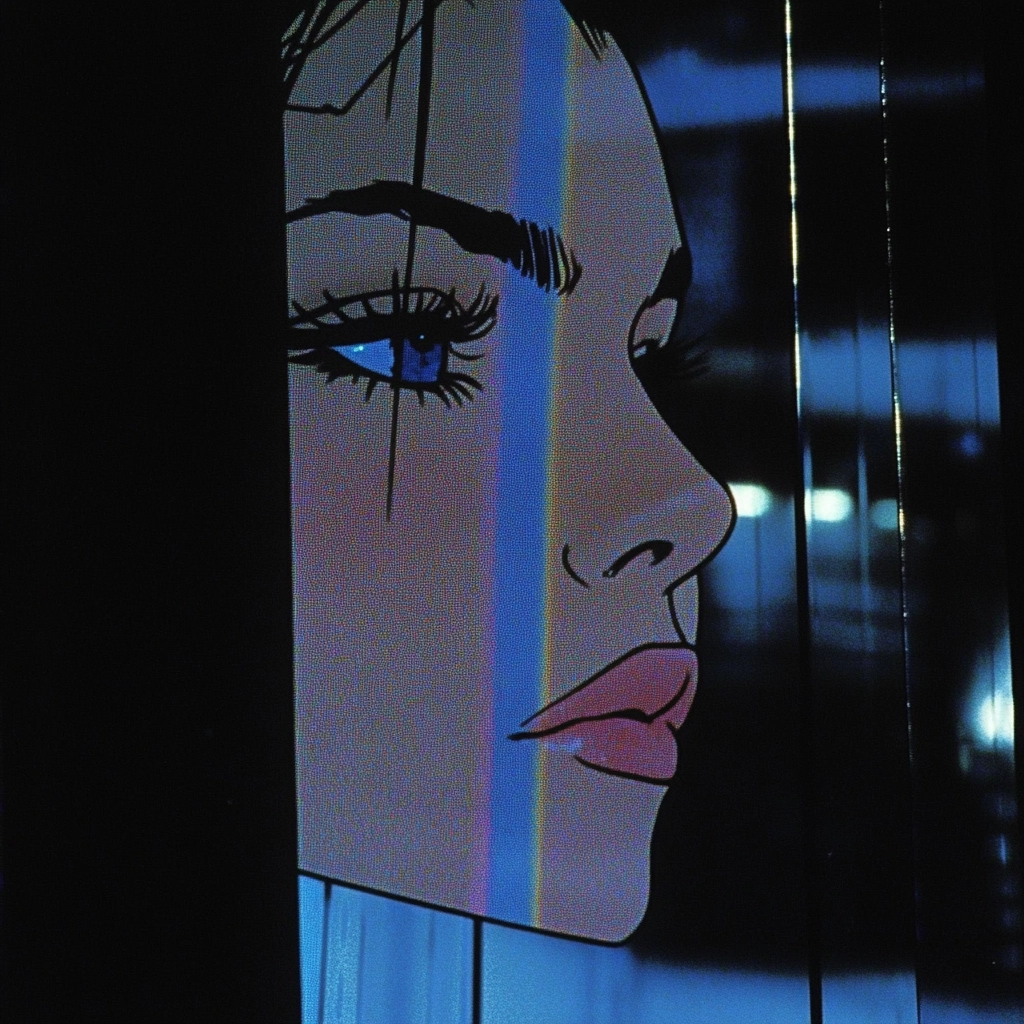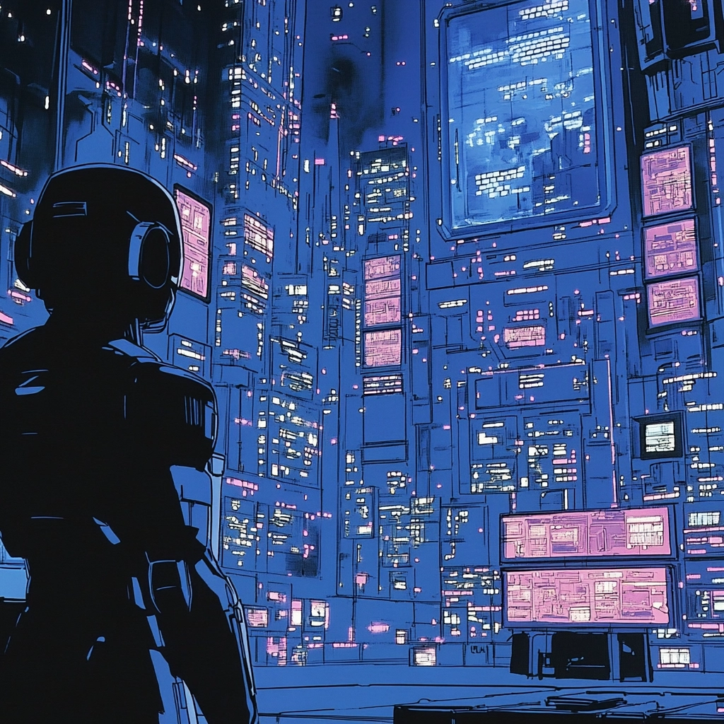 The artwork employs high-contrast lighting, accentuating sleek outlines and angular forms while incorporating digital textures. The spatial layout provides a multidimensional feel with vivid cyan hues and pink highlights.