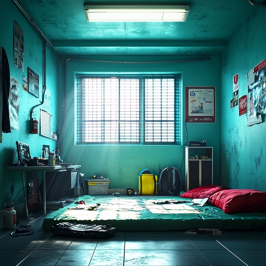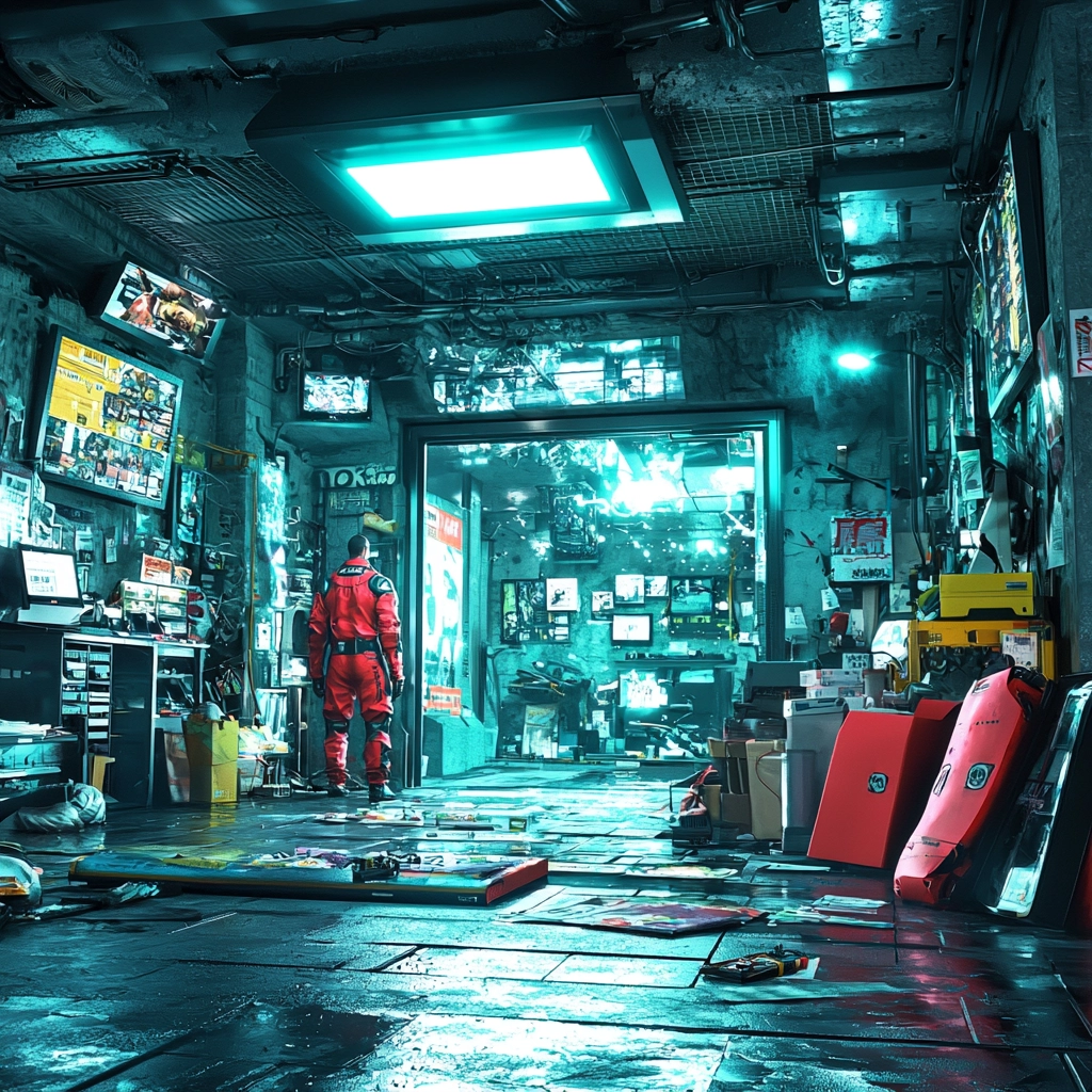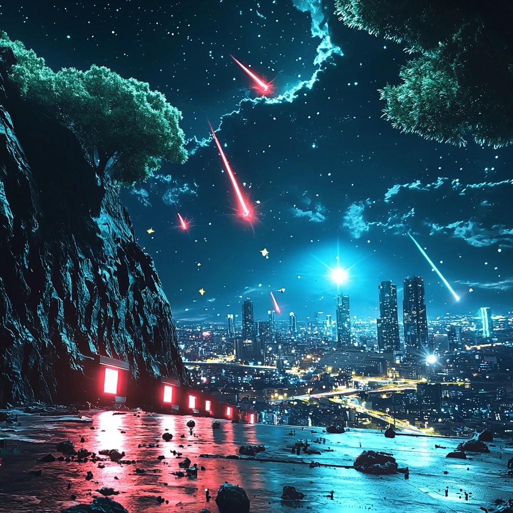 The use of neon lighting enhances spatial depth and highlights contrasting elements. Cyan dominates, creating a crisp, high-contrast texture. Urban details are sharply defined within an expansive scene.