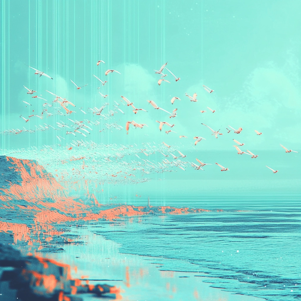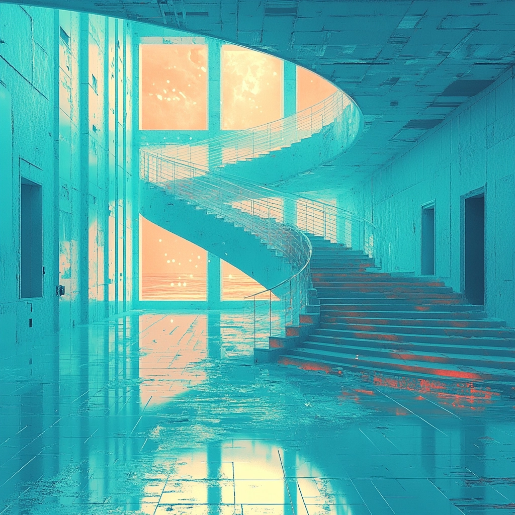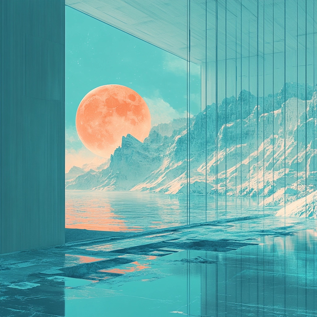 The lighting creates vivid reflections and amplifies contrast between cyan and orange. Clarity and smooth texture define the crisp edges of shapes, enhancing spatial depth and symmetry.