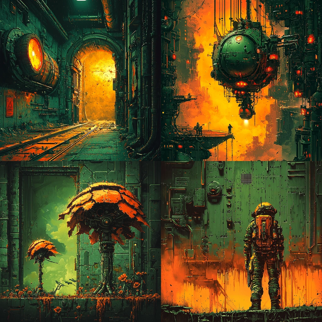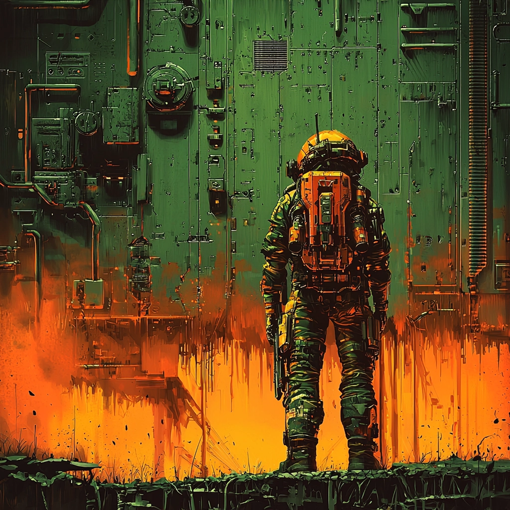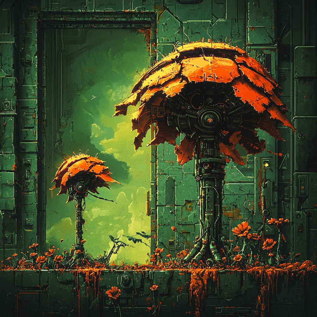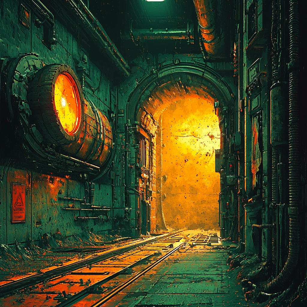 Bold cyan and intense orange create a vivid contrast. The lighting enhances the depth, casting shadows that emphasize structural gradients. Textures are gritty and surfaces appear worn, adding complexity to the visual plane.