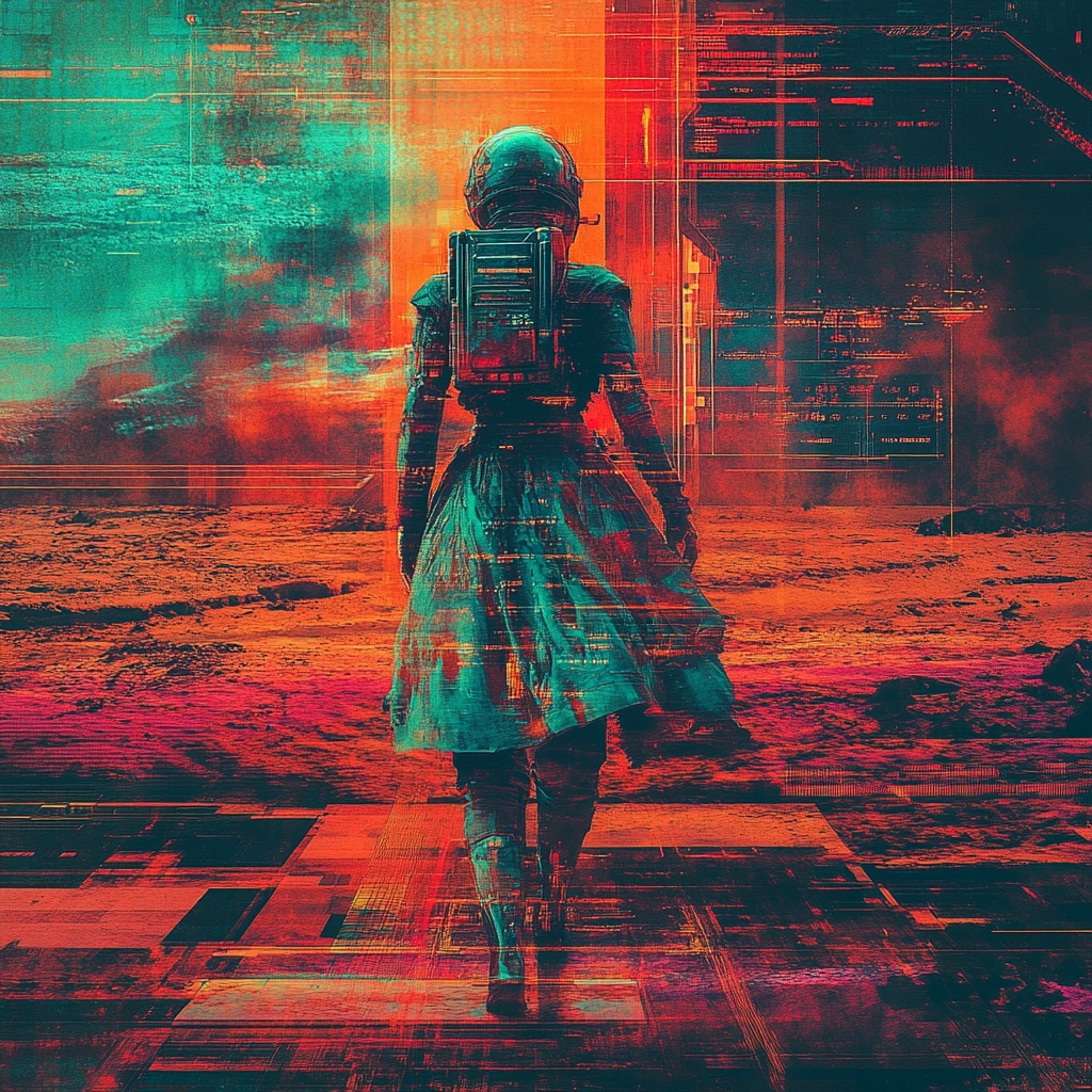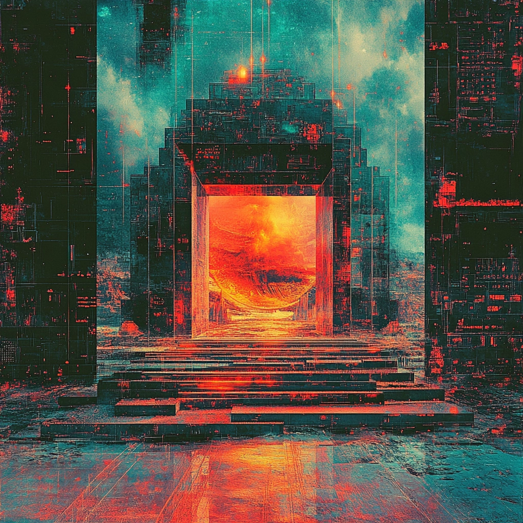 Vibrant hues clash with structured forms, evoking futuristic intensity.