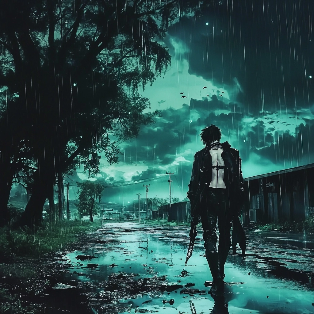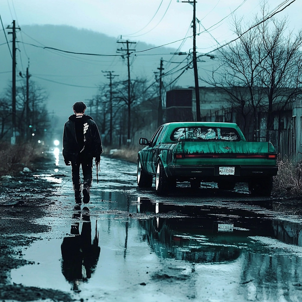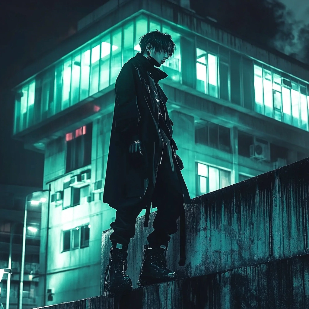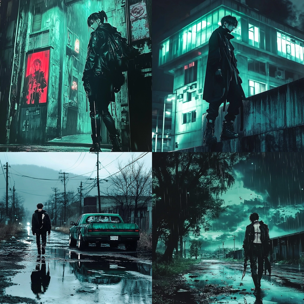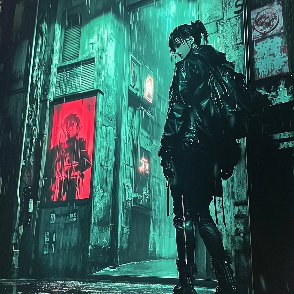 Lighting offers a vibrant neon effect that highlights all elements within dark shadowed settings. Green and blue hues provide a cool tone while reflections in wet surfaces enhance depth with a glossy texture, creating a dystopian ambience.
