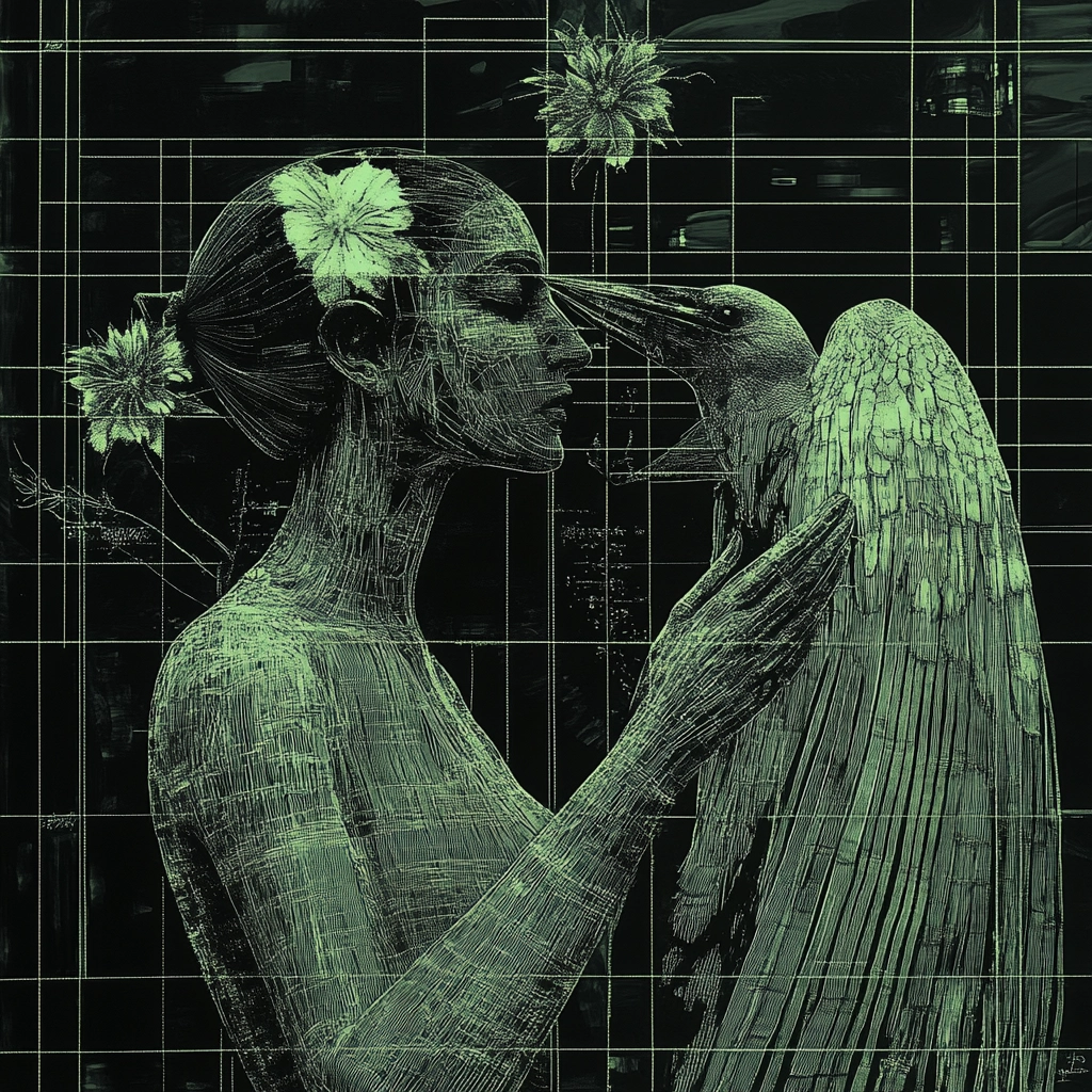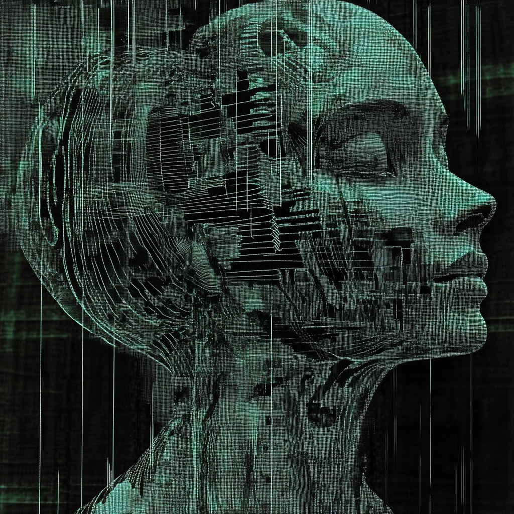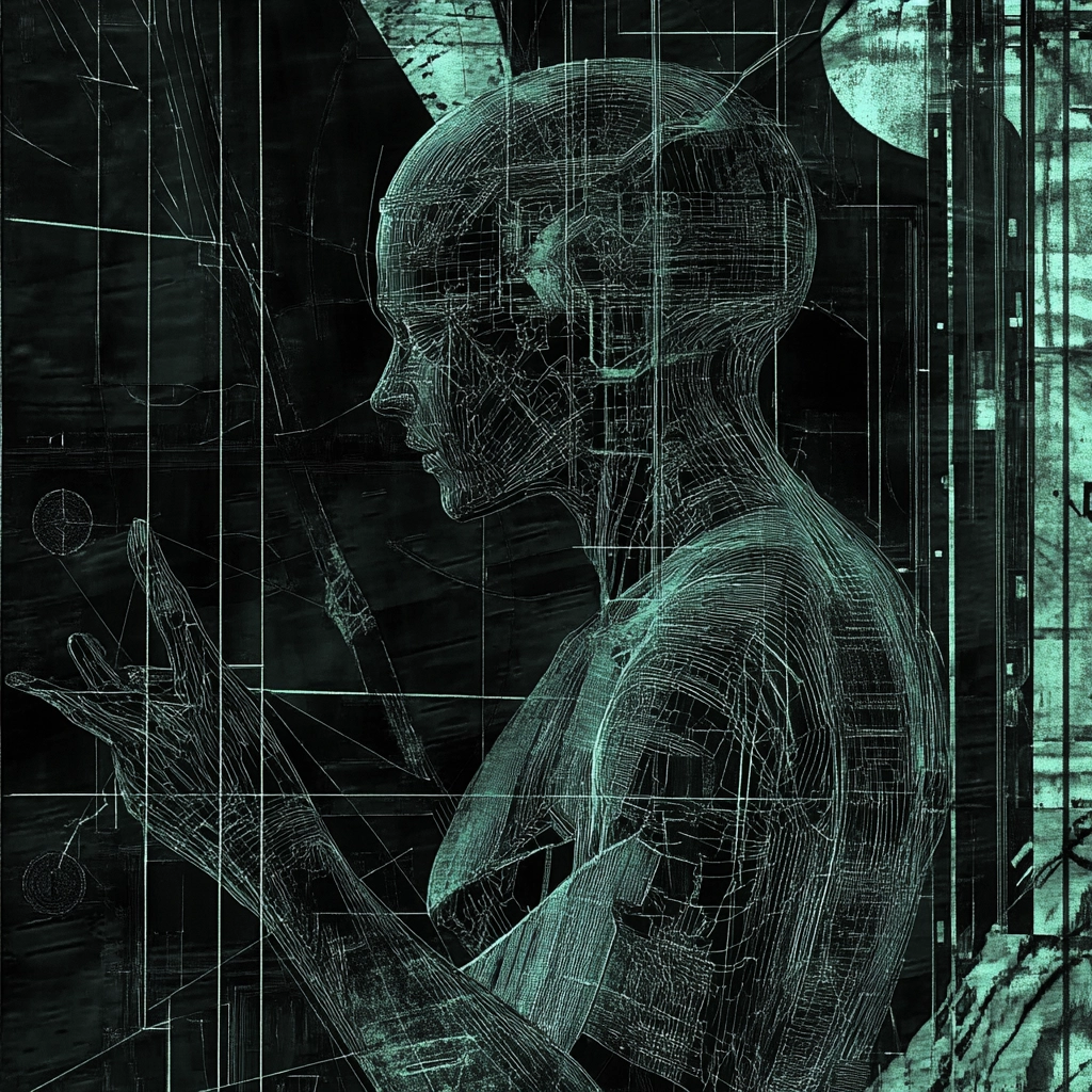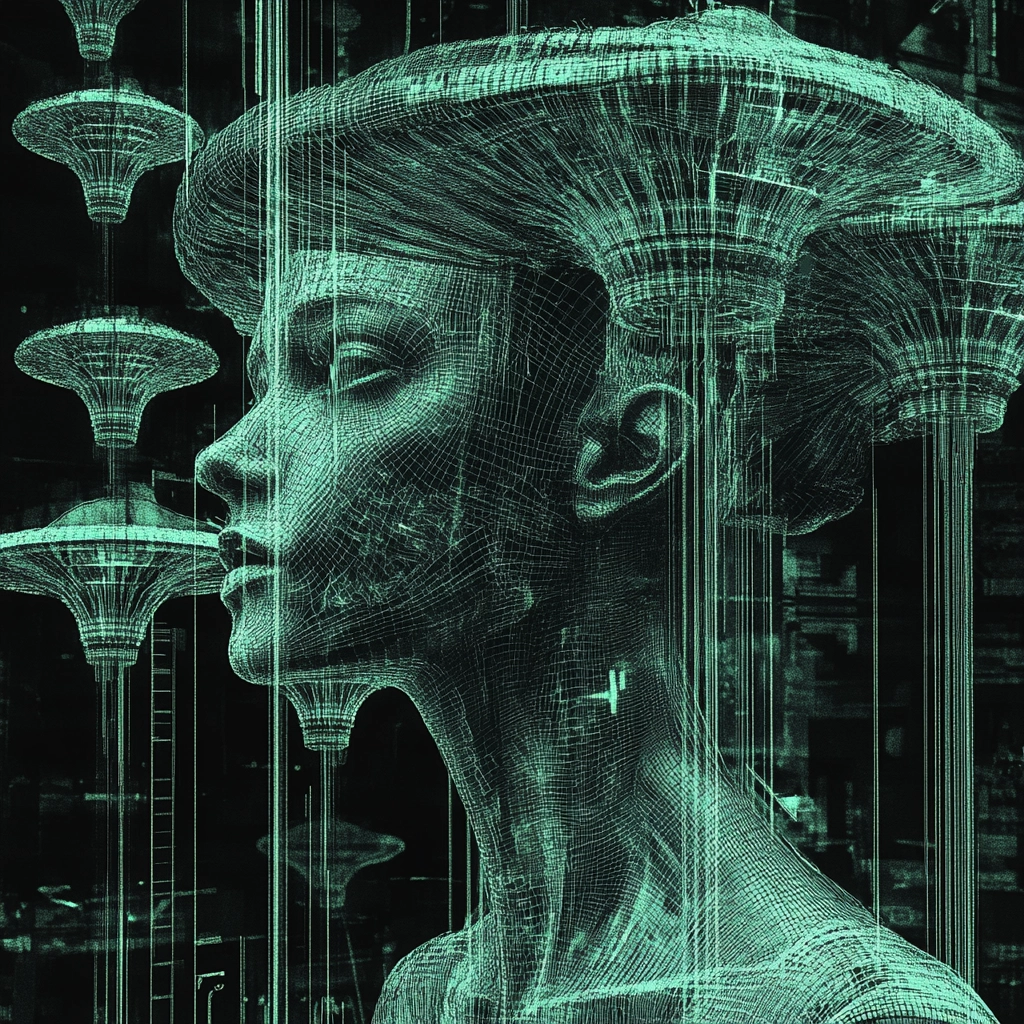 The image exhibits intricate, grid-like textures with dominant dark blue and green hues, creating a sense of depth and cybernetic complexity.