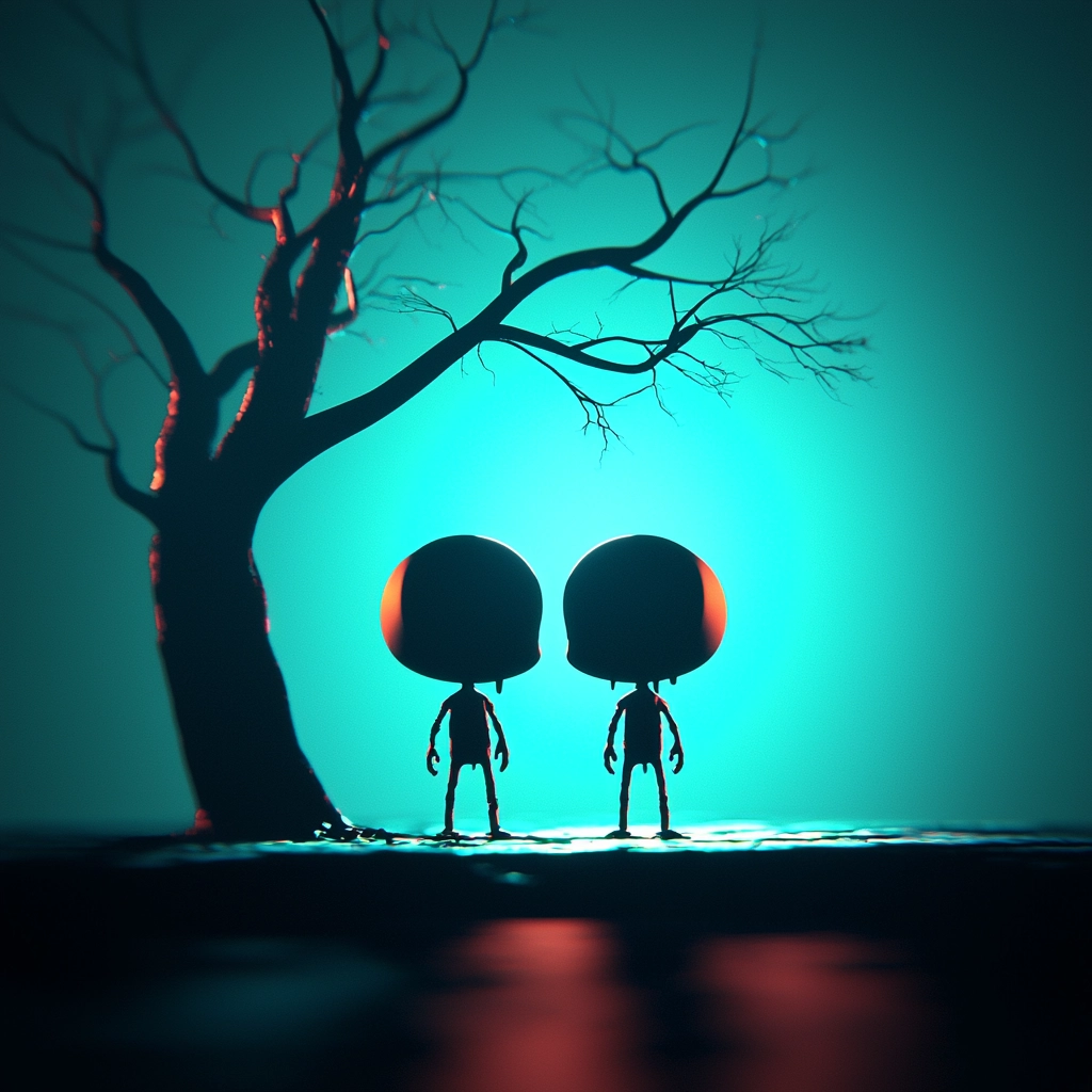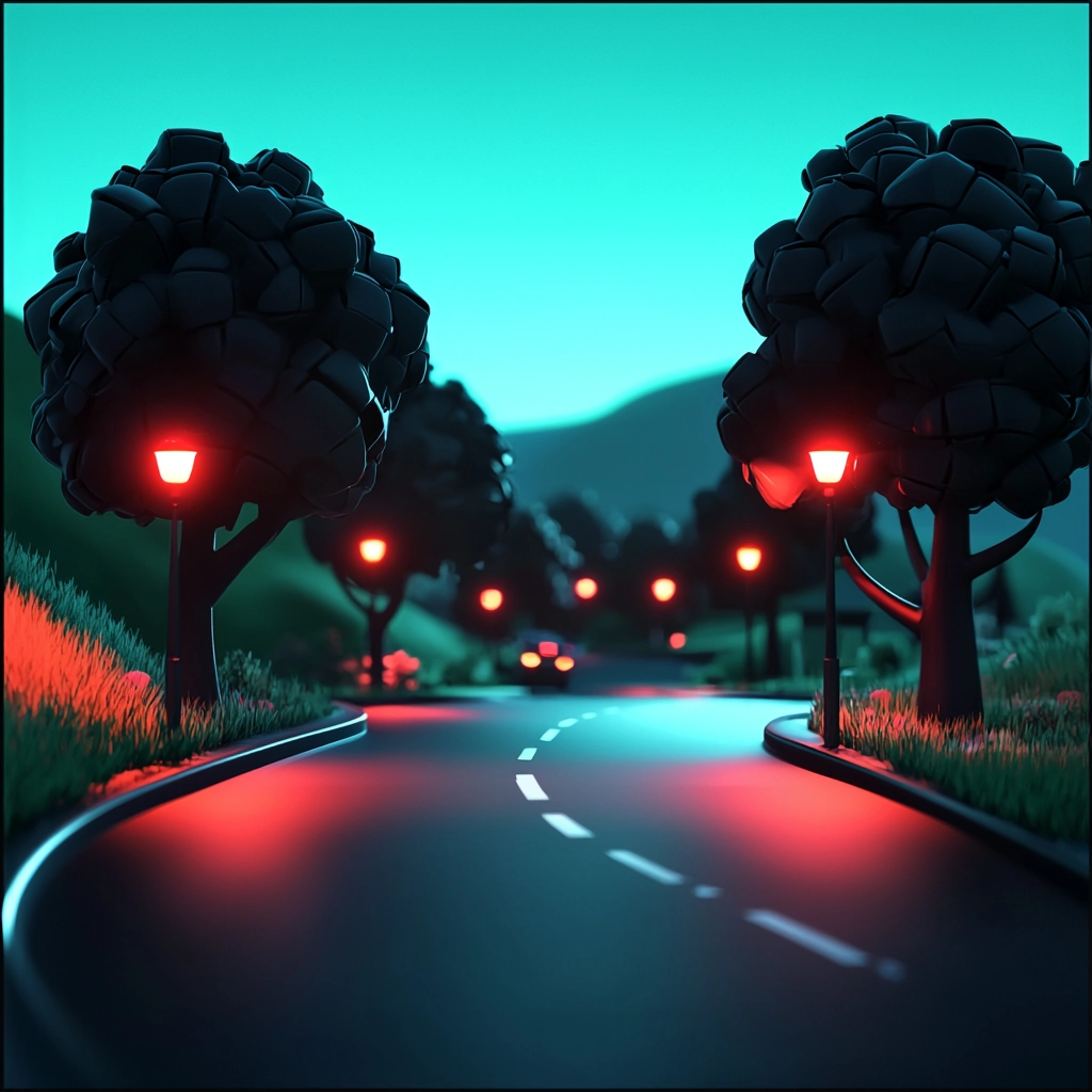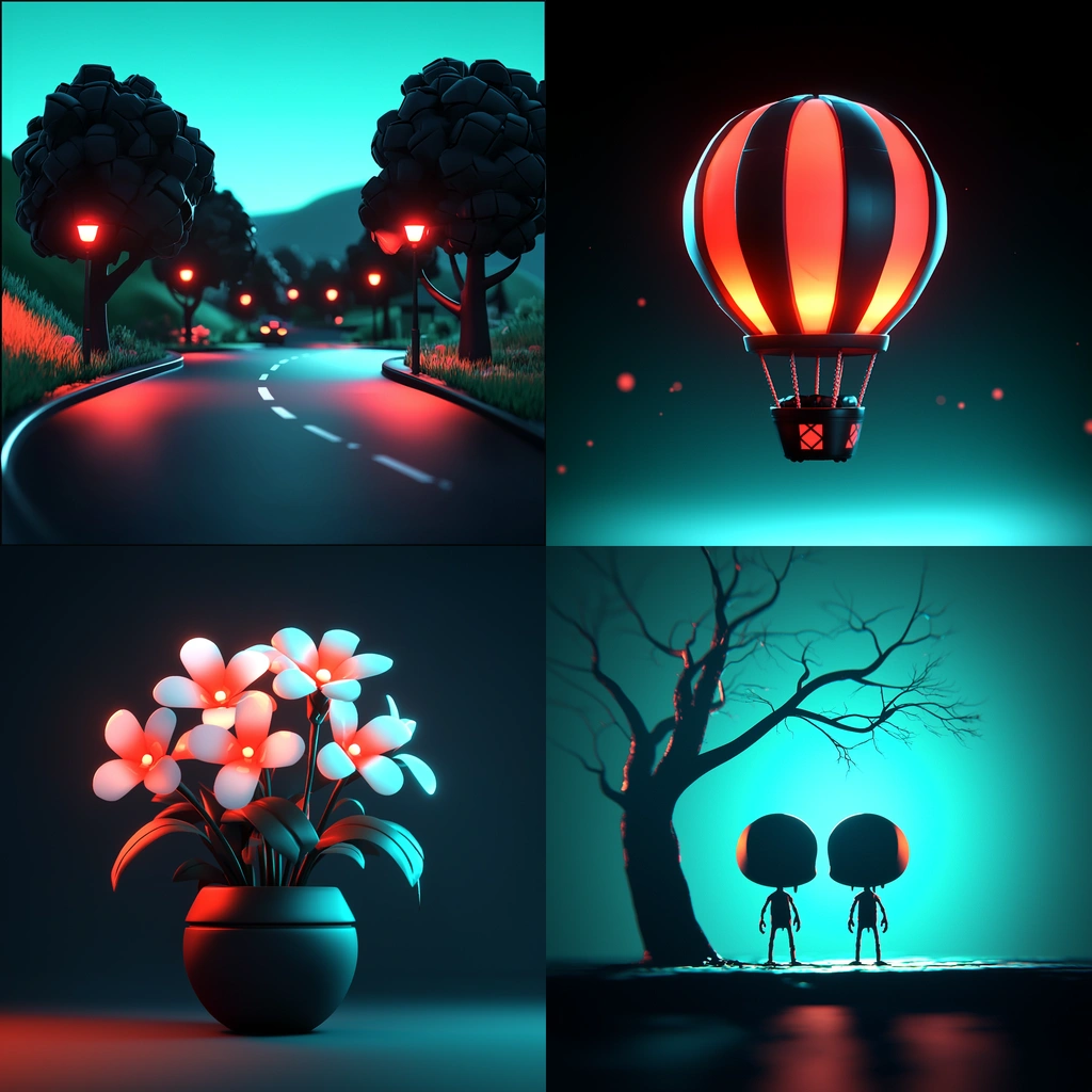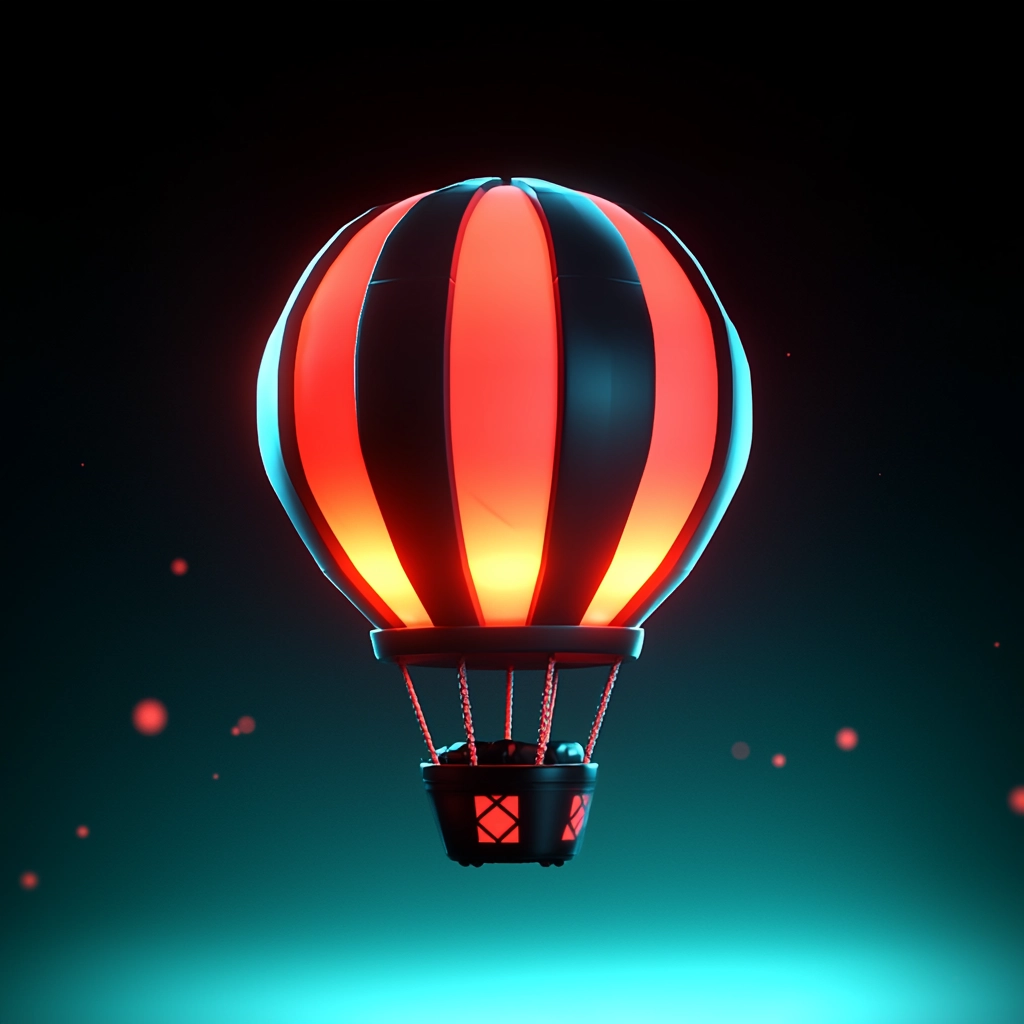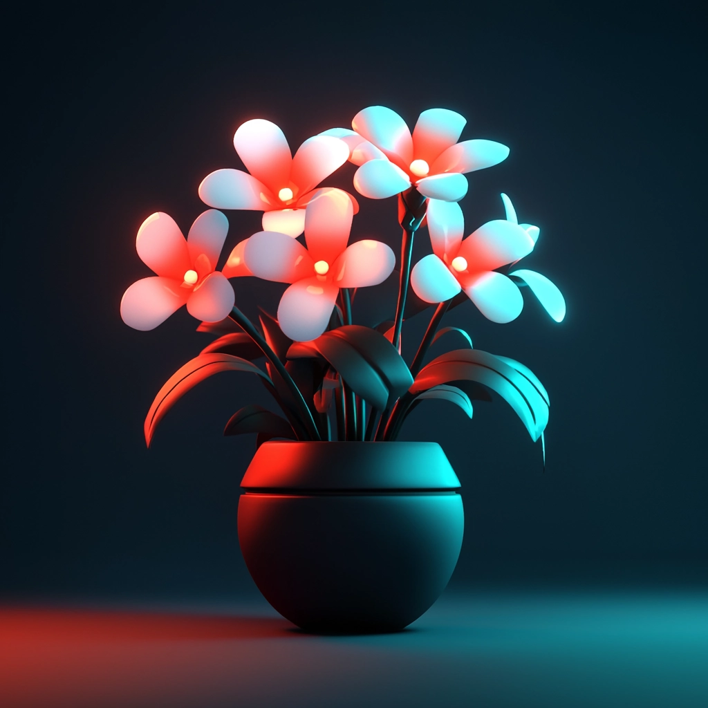 Distinct use of contrasting cyan and red enhances depth and dimensionality, while glowing edges provide a luminous effect. Shadows and highlights emphasize spatial dynamics, creating a futuristic ambiance.
