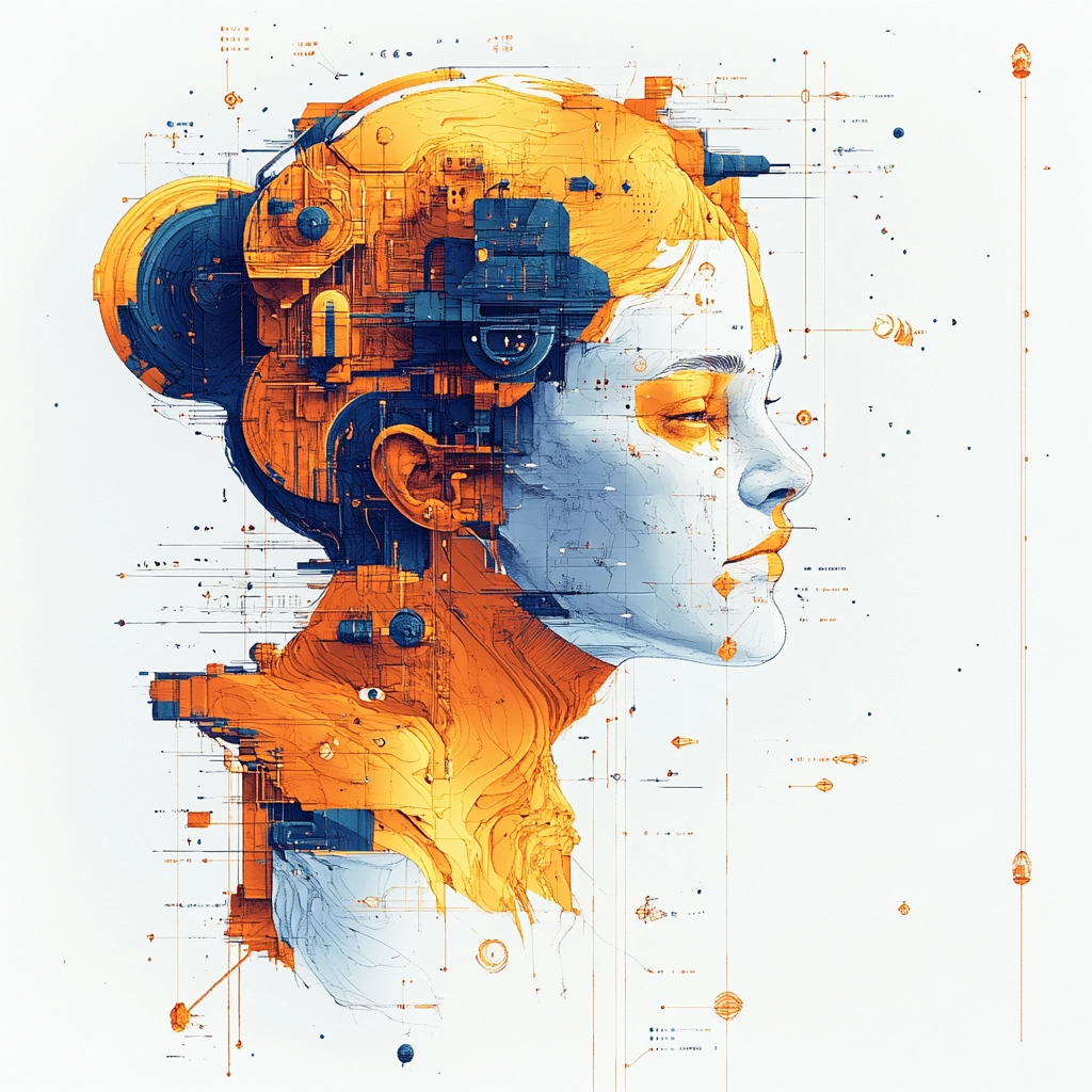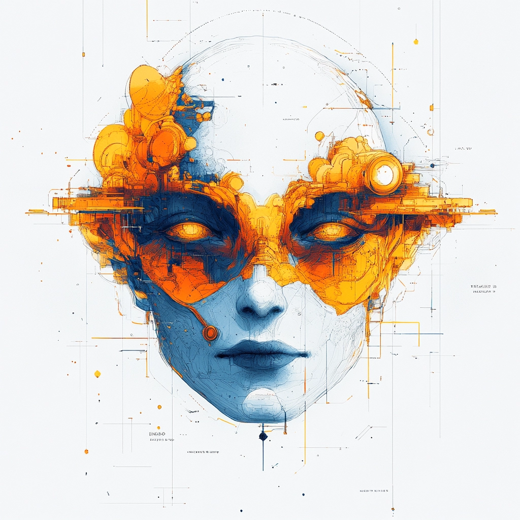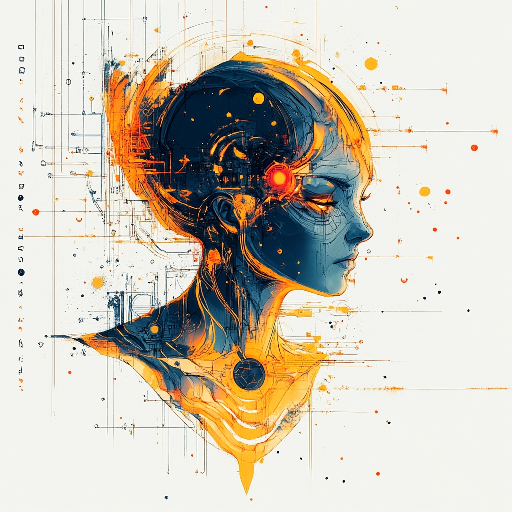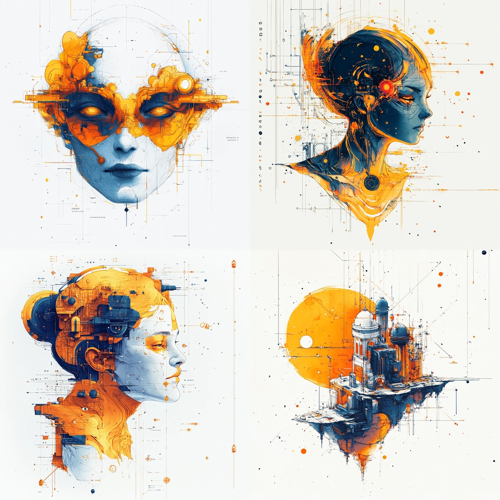 Prominent use of vibrant orange against contrasting black and white elements creates a striking visual impact.