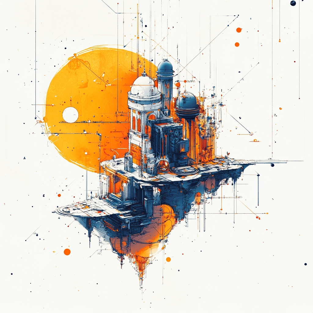 Dynamic lines and geometric shapes intersect with vibrant fluorescent hues, highlighting spatial depth and complexity. The textures vary, with fluidity meeting rigid forms while lighting emphasizes focal points strongly.