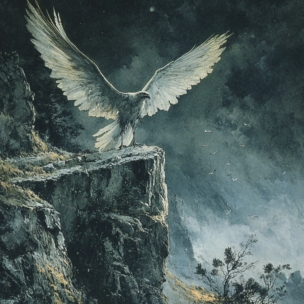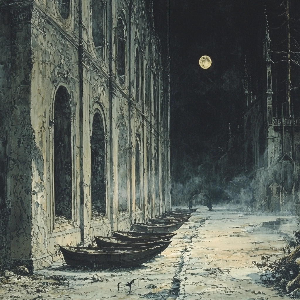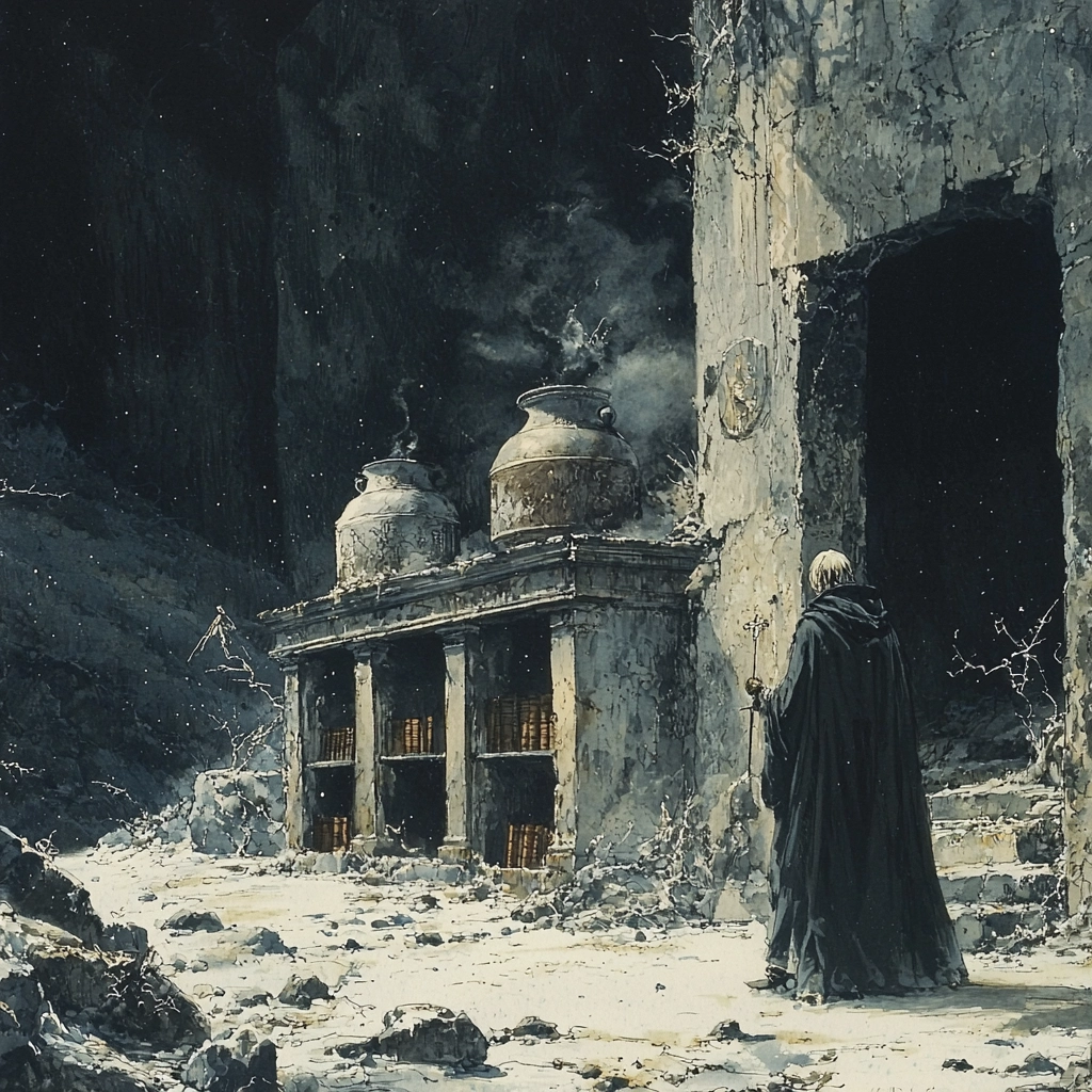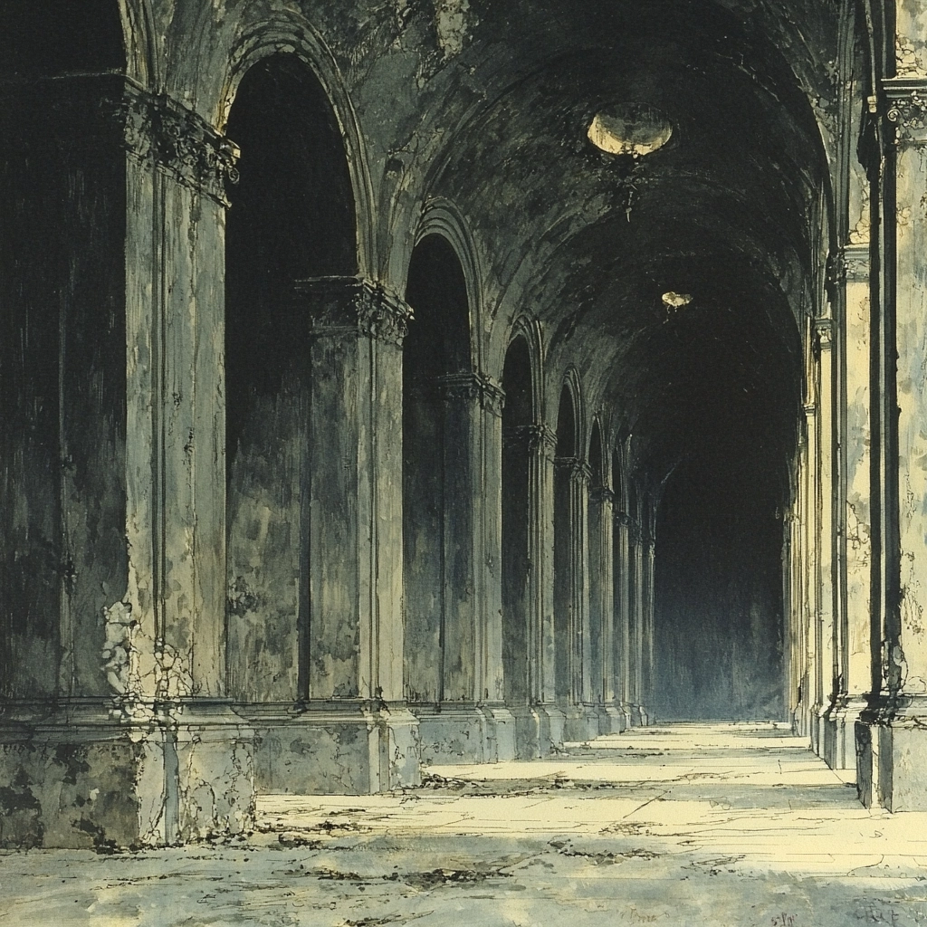 The lighting delineates stark contrasts, with shadows accentuating the architectural elements. The use of dark blue and gray establishes a sense of spatial depth, while the texture of weathered stone adds a tactile element to the surfaces.