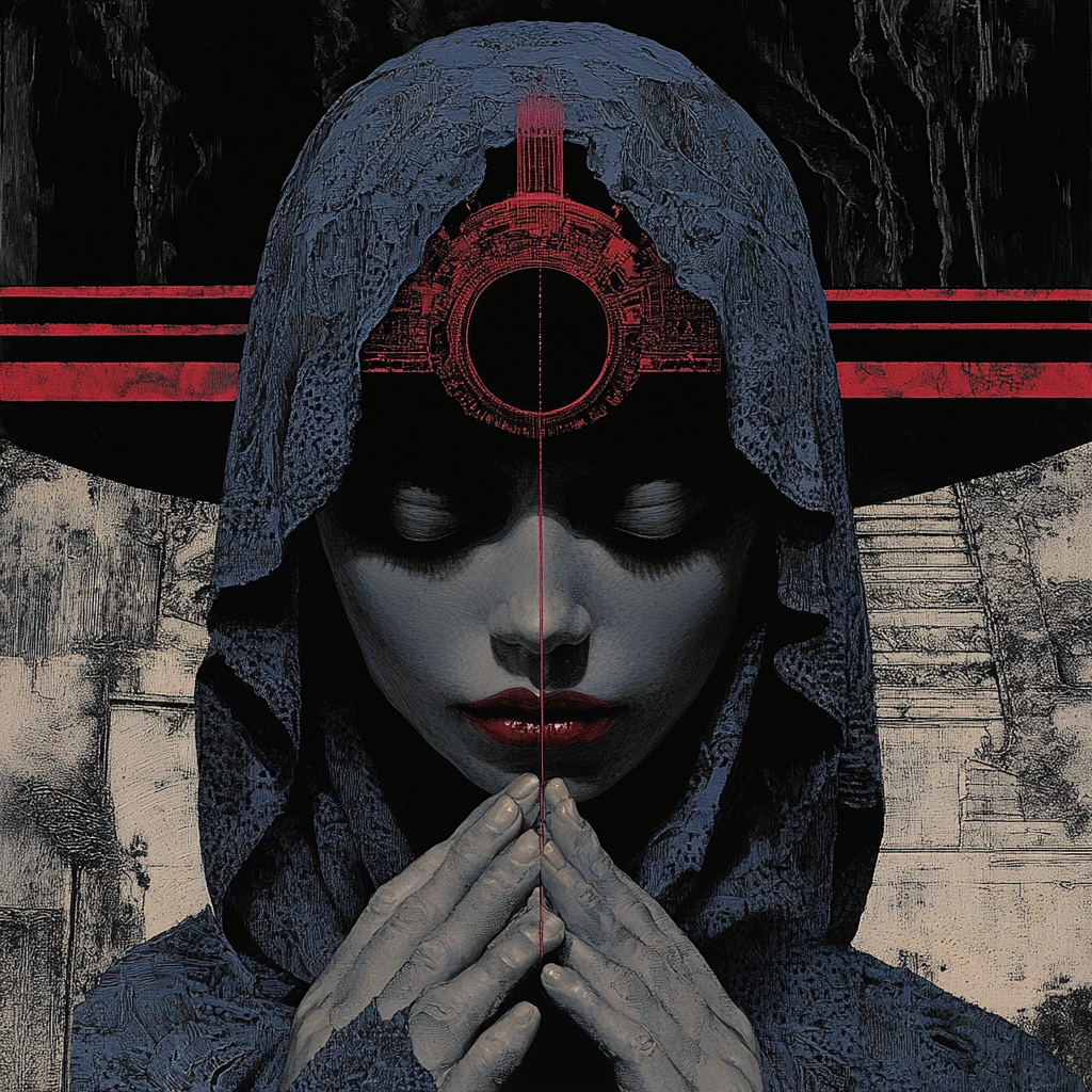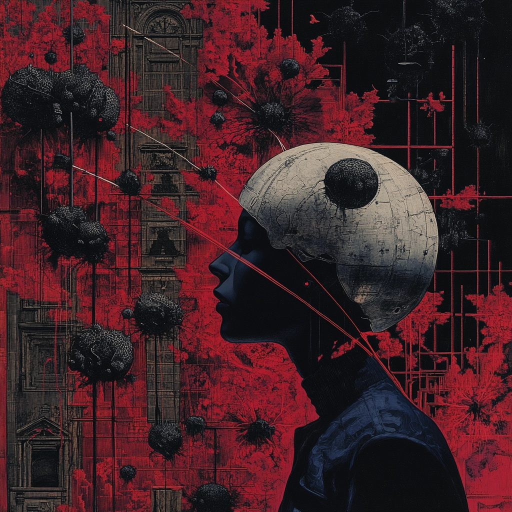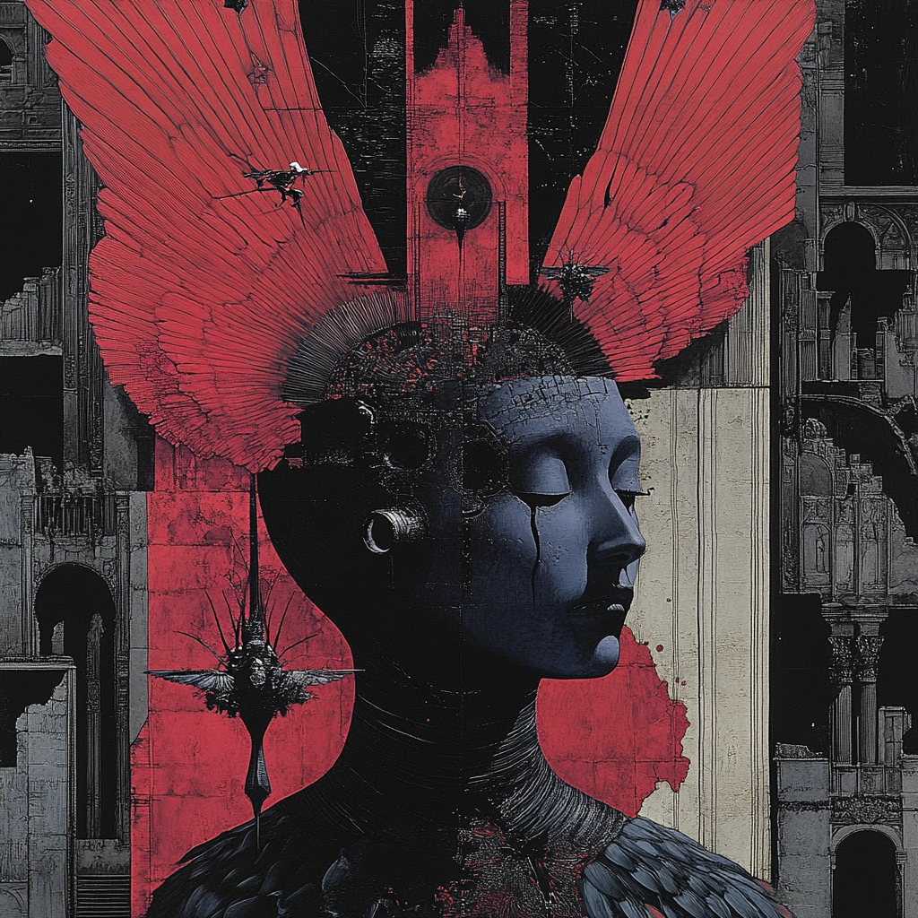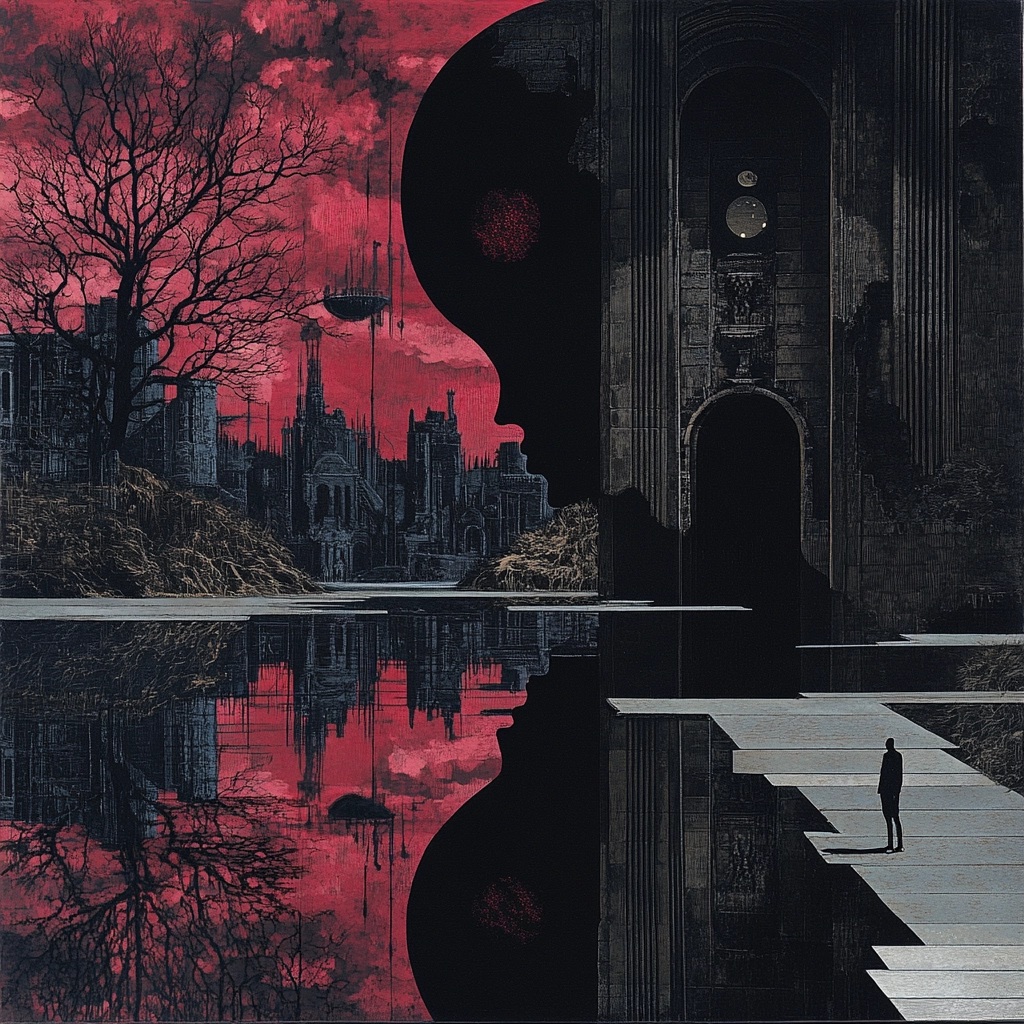A striking interplay of dark tones, vivid reds, and subtle blues rendered with a focus on architectural elements and high contrast.