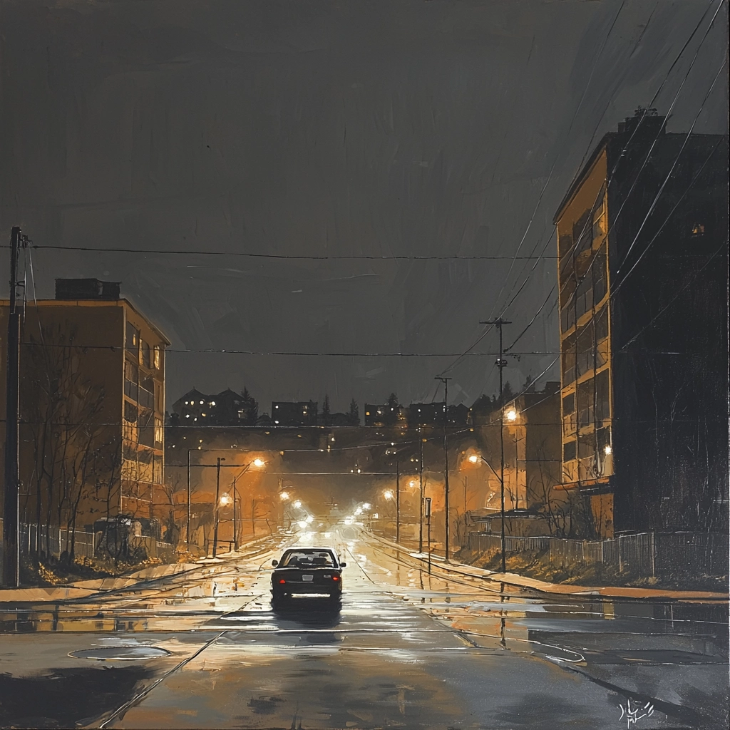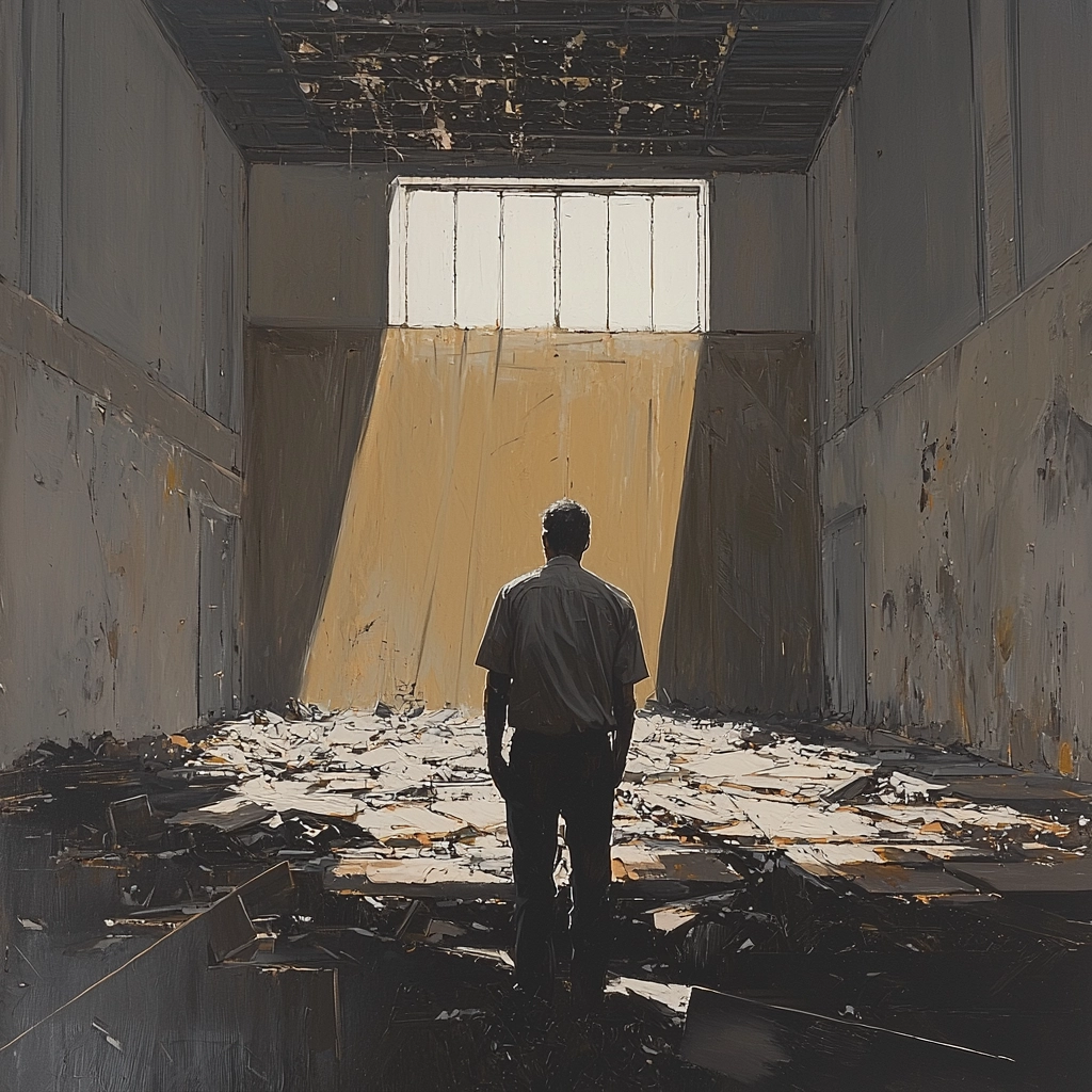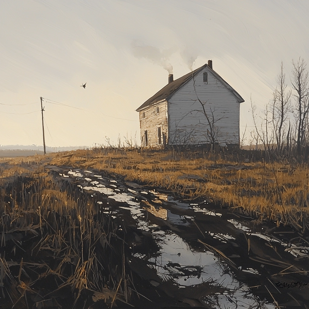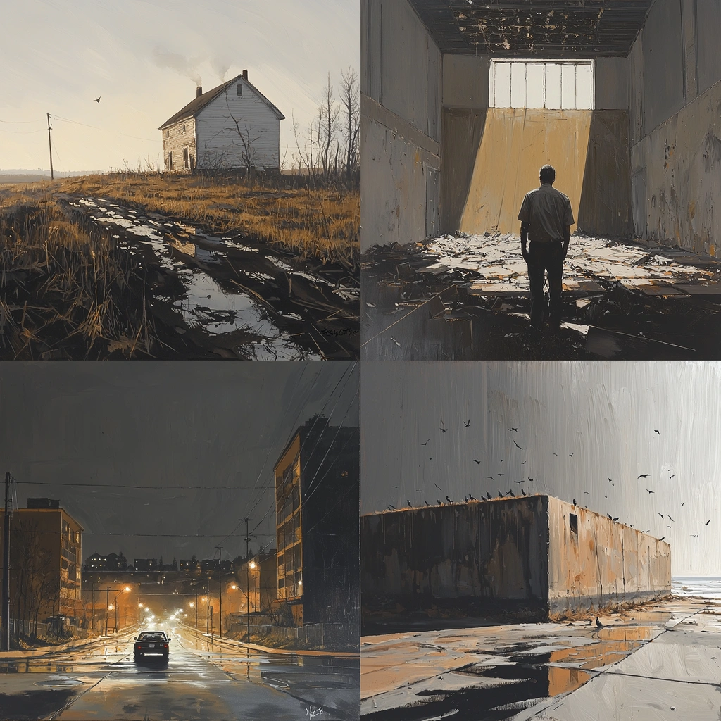 Subdued hues and somber tones establish a melancholic atmosphere.