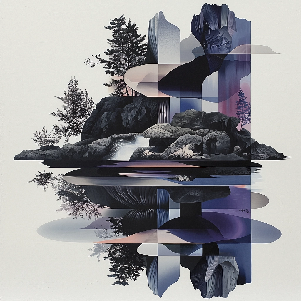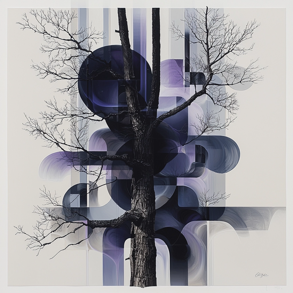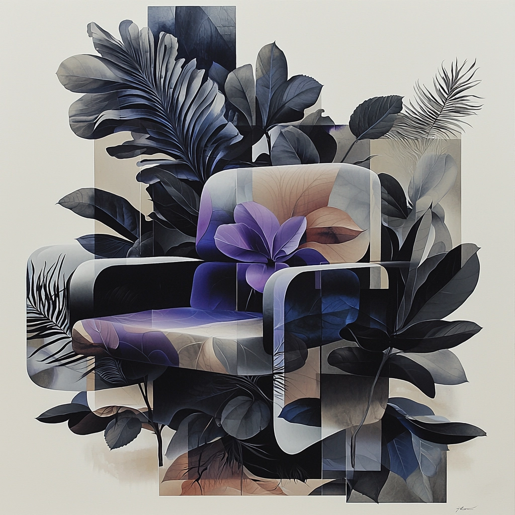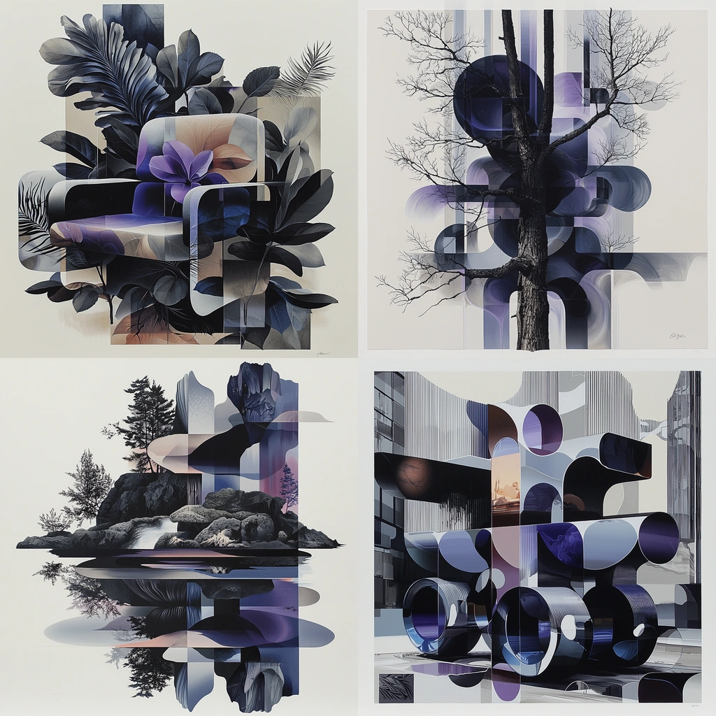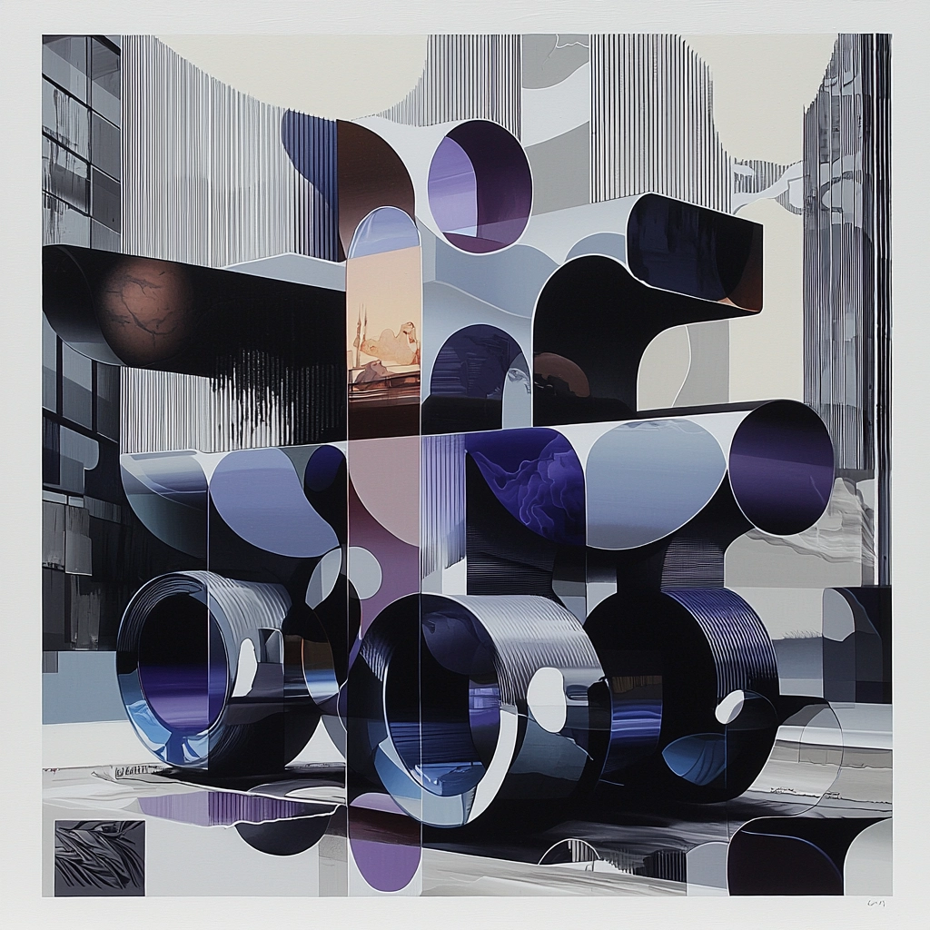 The use of dark blue and purple creates a layered effect with smooth transitions between translucent and opaque areas, generating depth. Shapes intersect with a refined interplay of shadows and gradients.