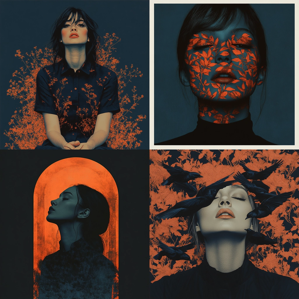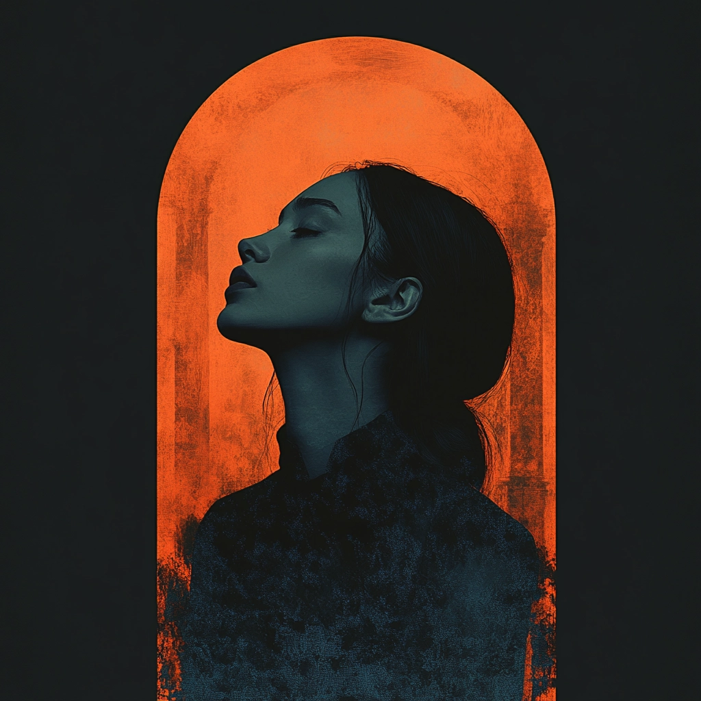 The lighting casts dramatic shadows, enhancing the high contrast between the deep blue backgrounds and vivid orange elements. Texture is expressed through the intricate details and silhouettes, which evoke strong visual intrigue, creating a layered spatial depth.