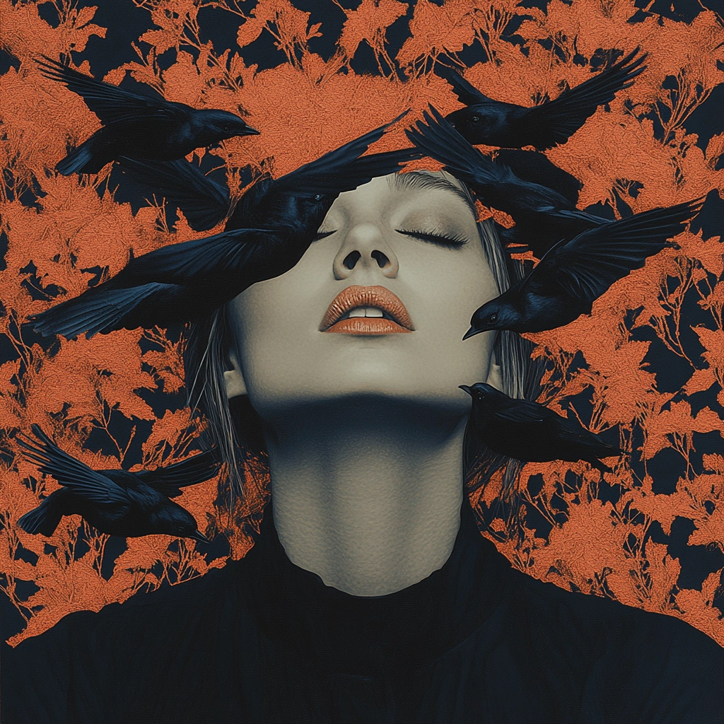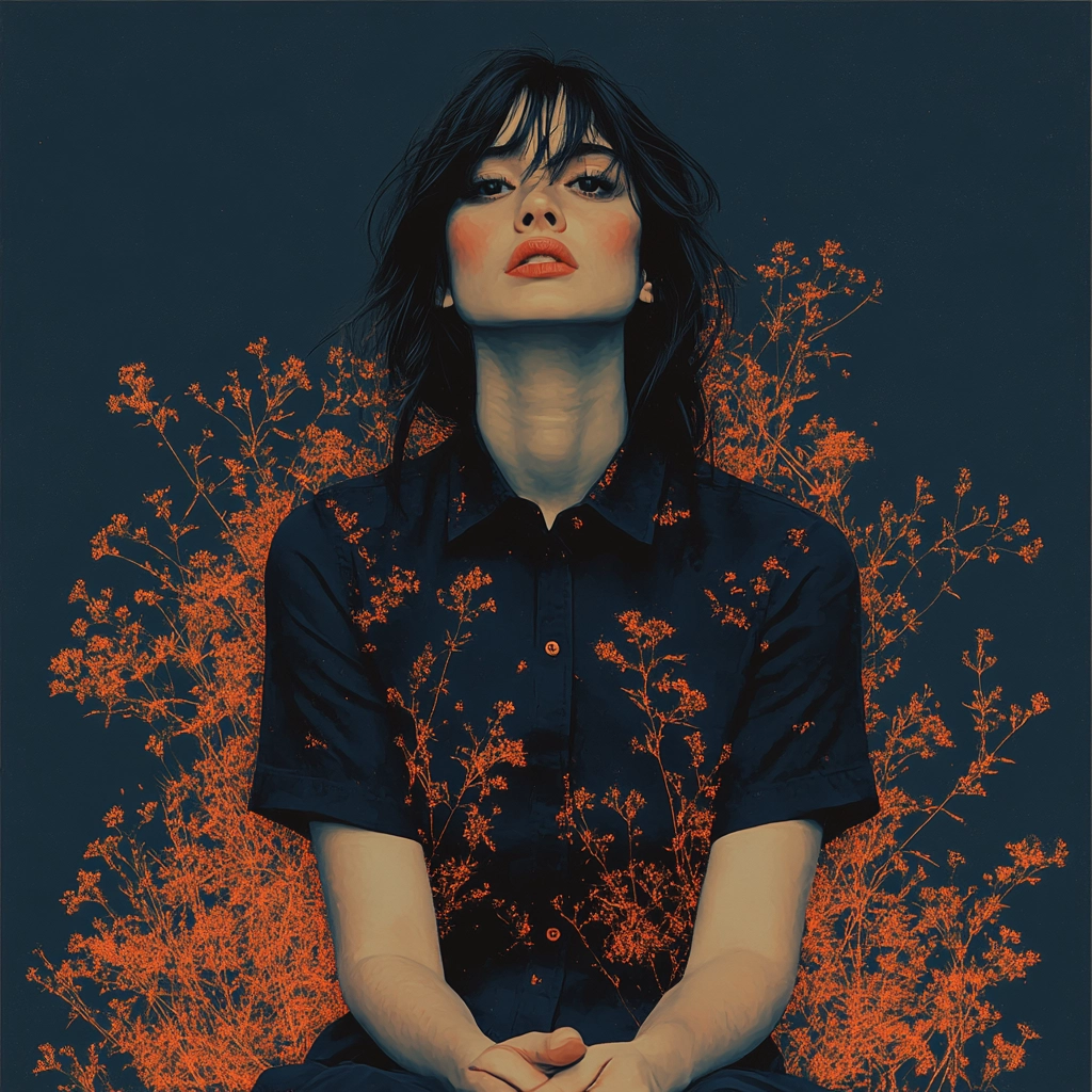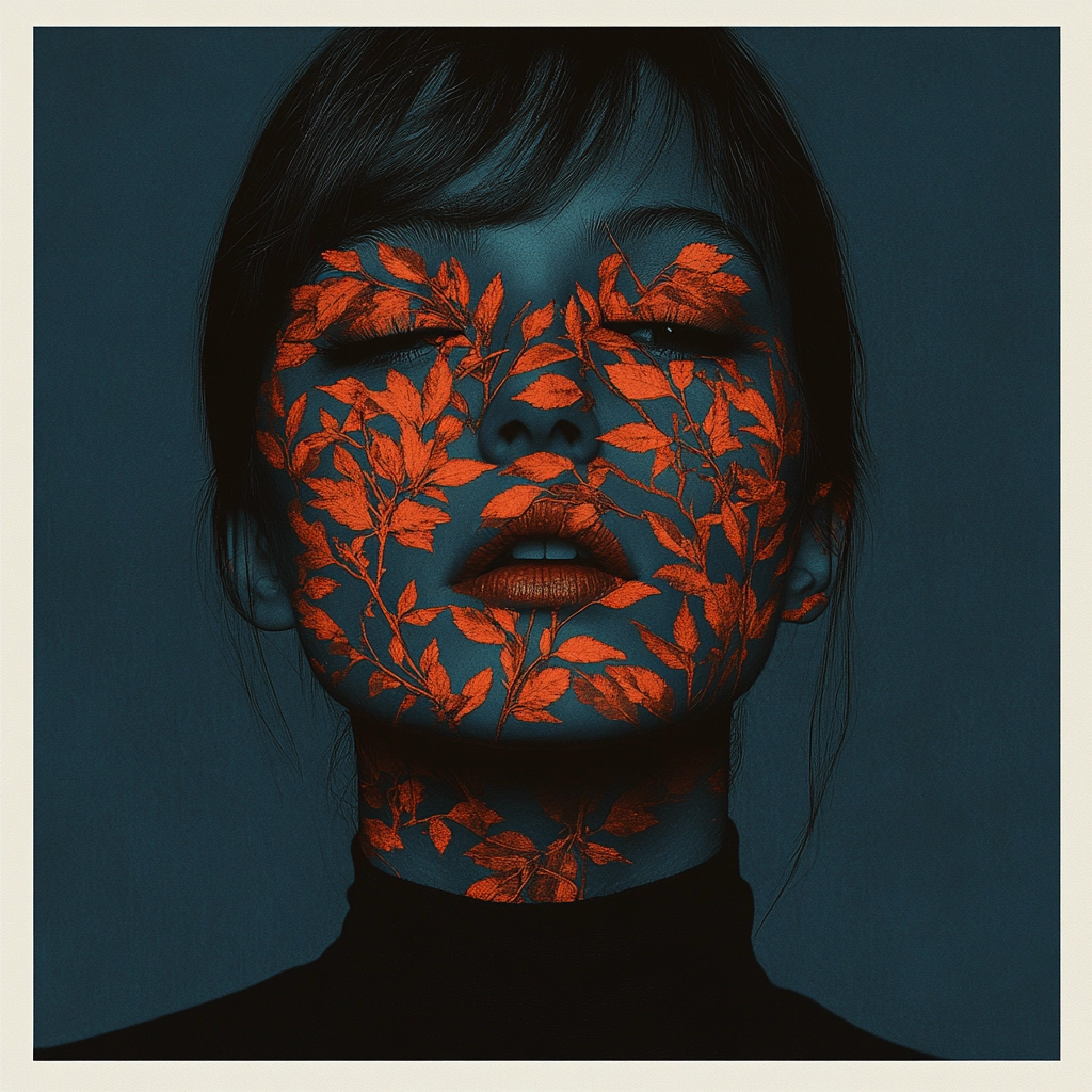Bold contrasts define the composition, melding vibrant orange with deep blue tones, creating a visually dynamic experience.