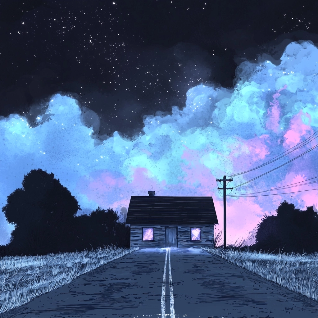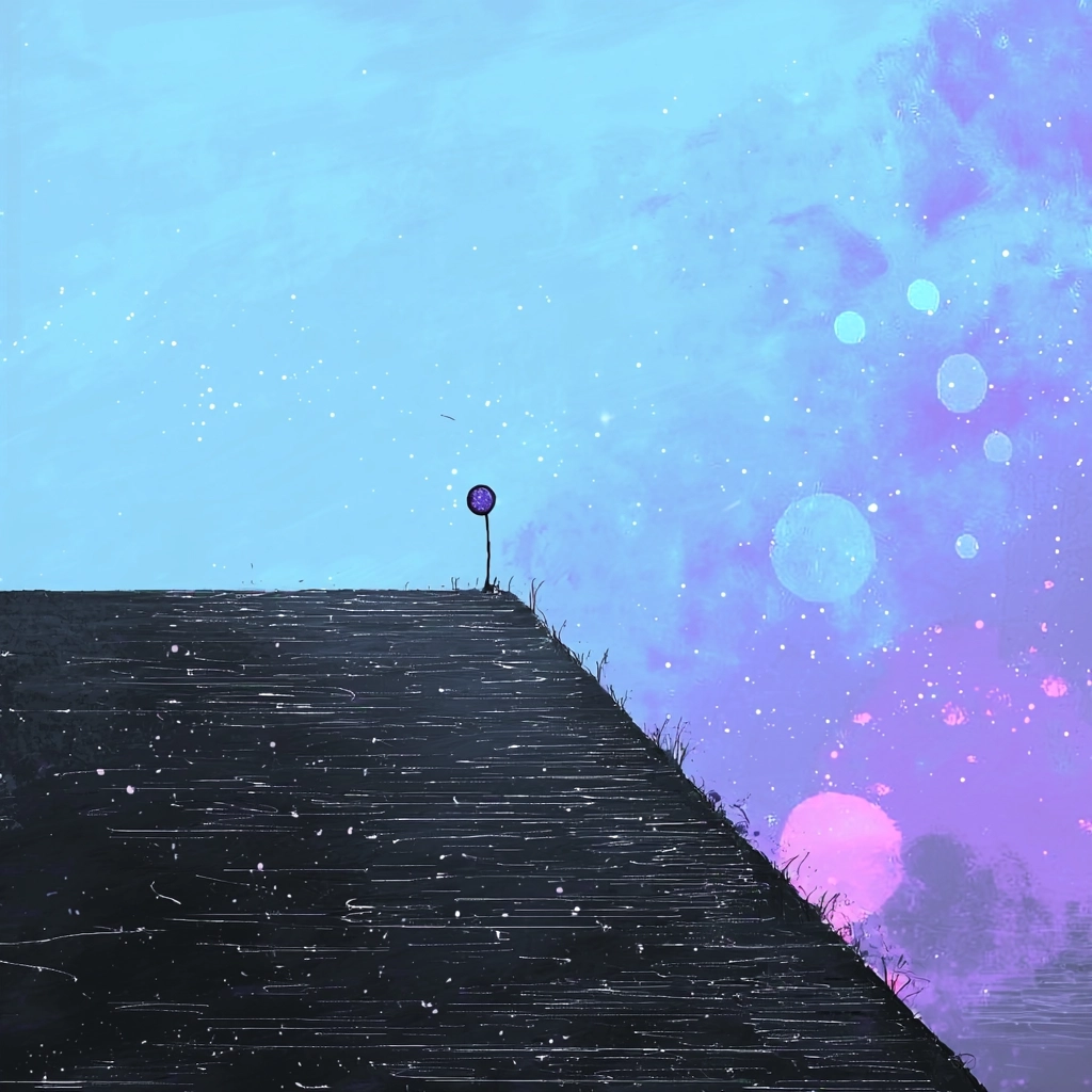 The lighting emphasizes the contrast between violet and dark blue, casting shadows and highlights that convey dimension. Colors blend seamlessly in gradients, coupled with distinctive textures. The spatial composition gives a sense of open yet defined environments.