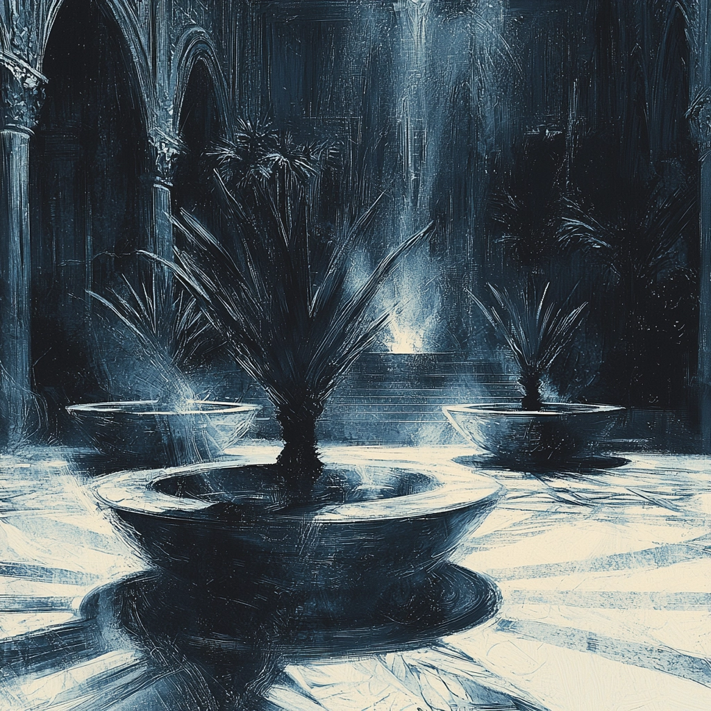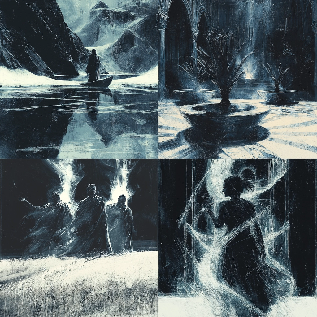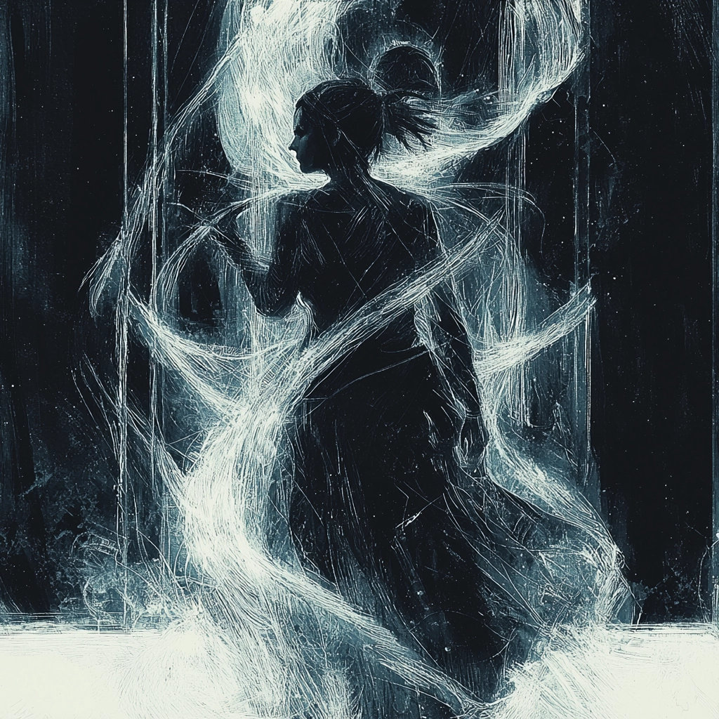 Lighting effects emphasize stark contrasts between light and dark, enhancing the depth and drama. The color palette is limited to dark blue and white, creating a striking visual impact. Detailed line work and texture expression add intensity and movement, with spatial depth conveyed through meticulous shading.