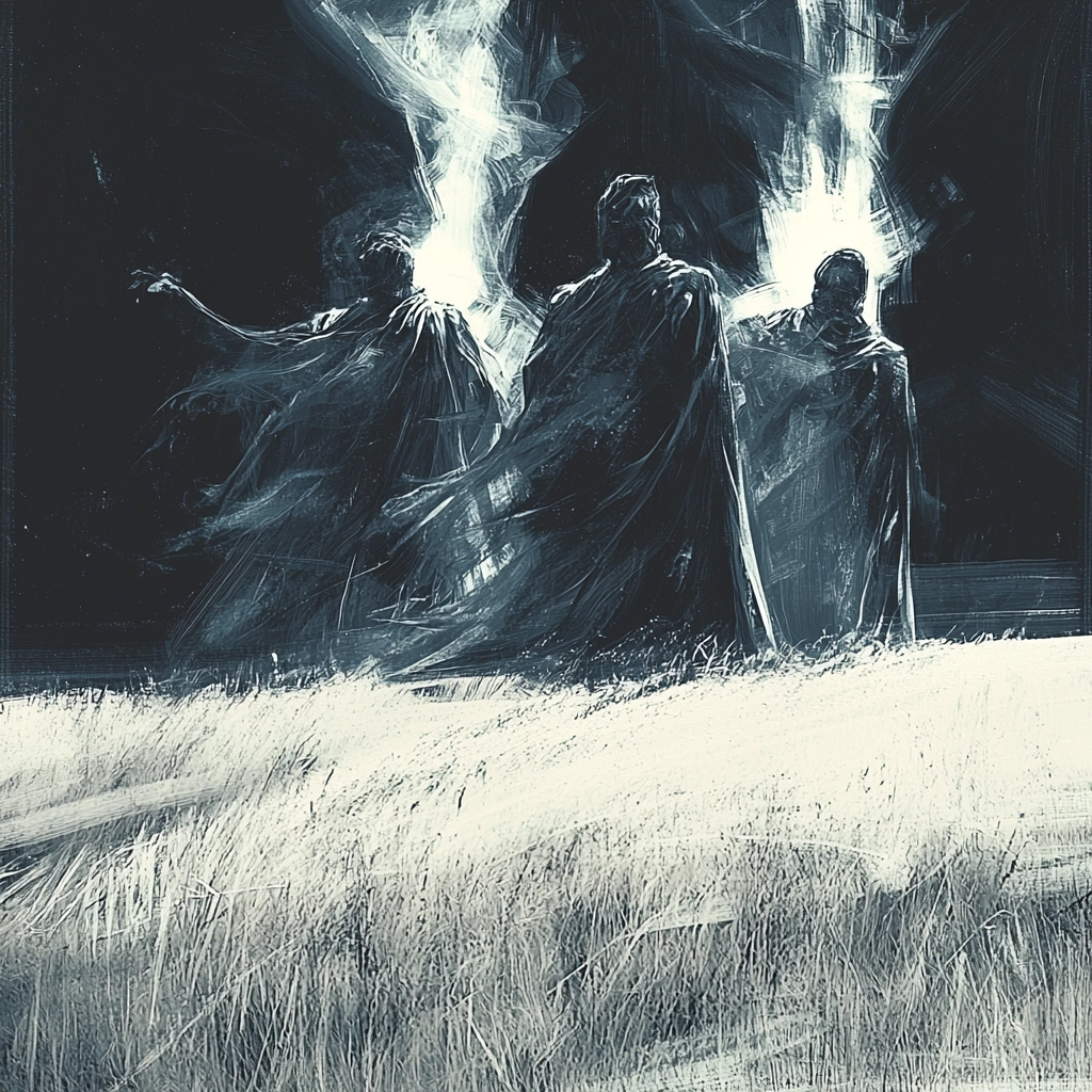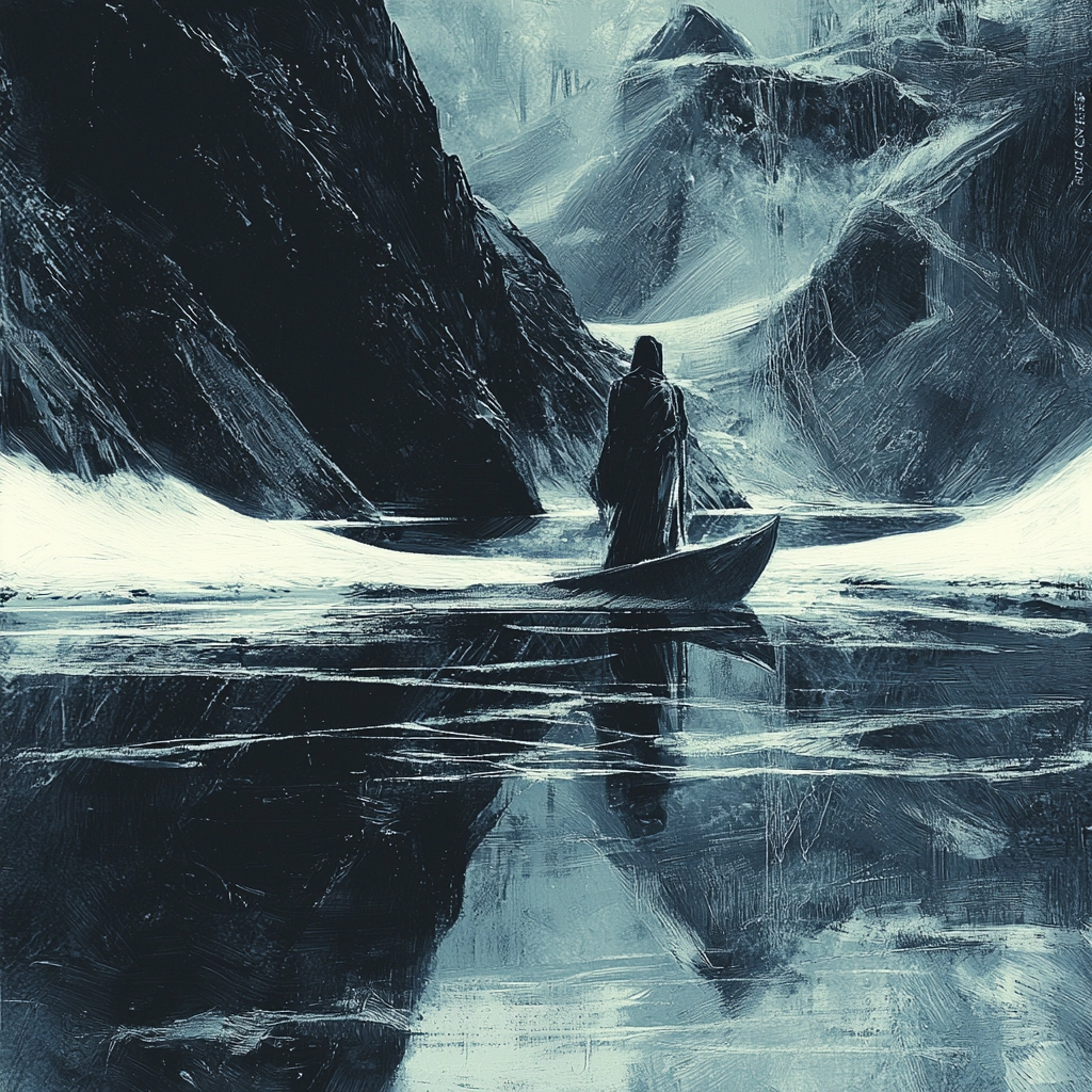Dramatic use of dark blue and white with stark contrast and detailed, evocative line work.
