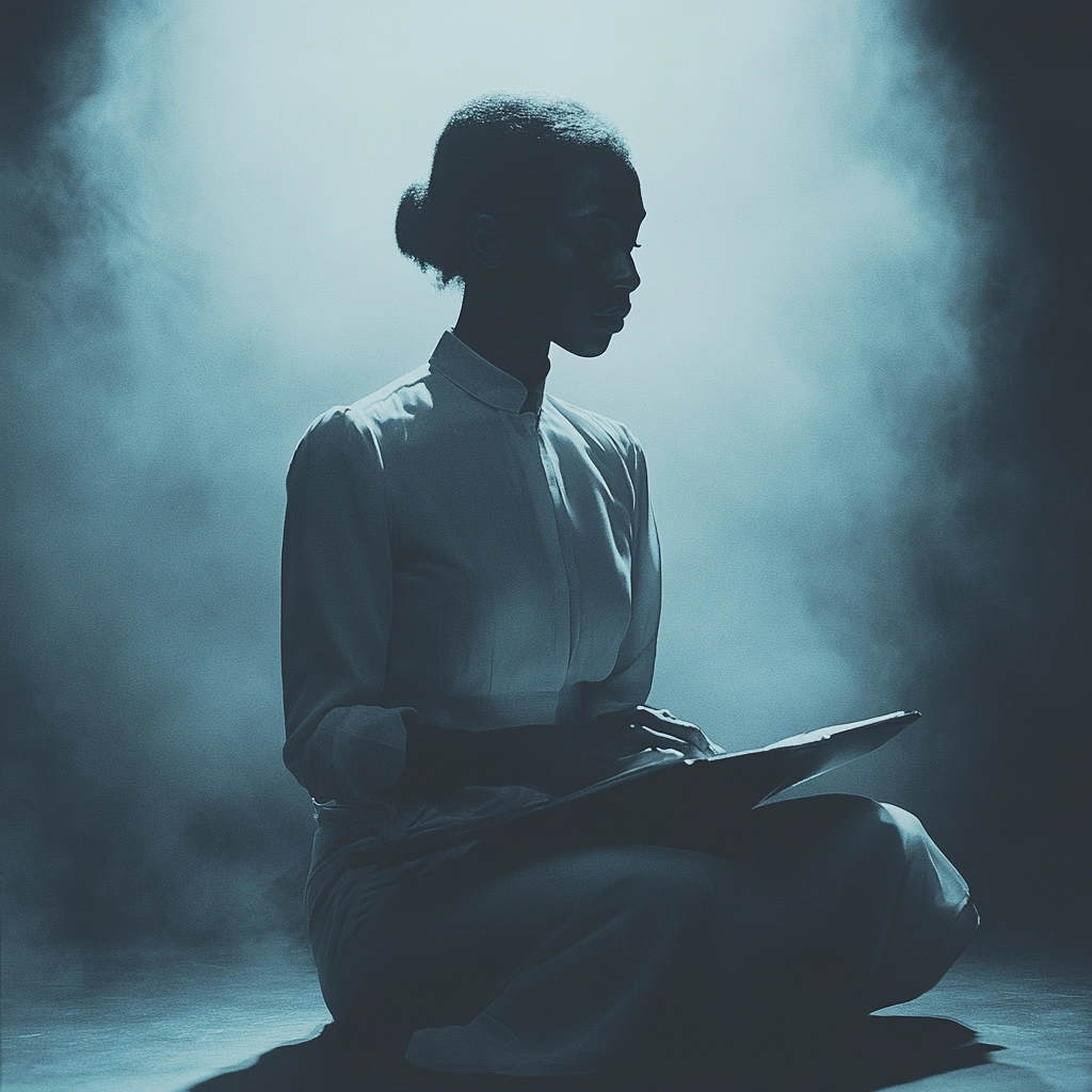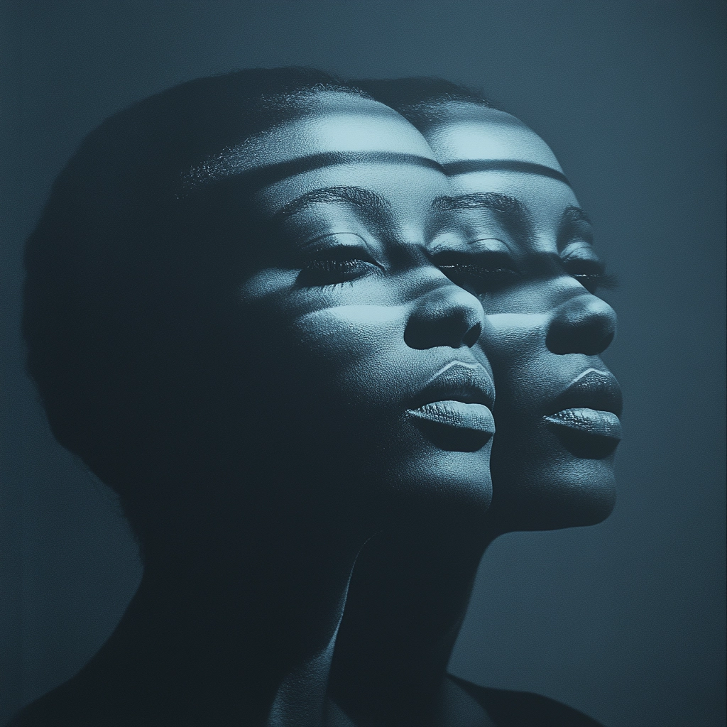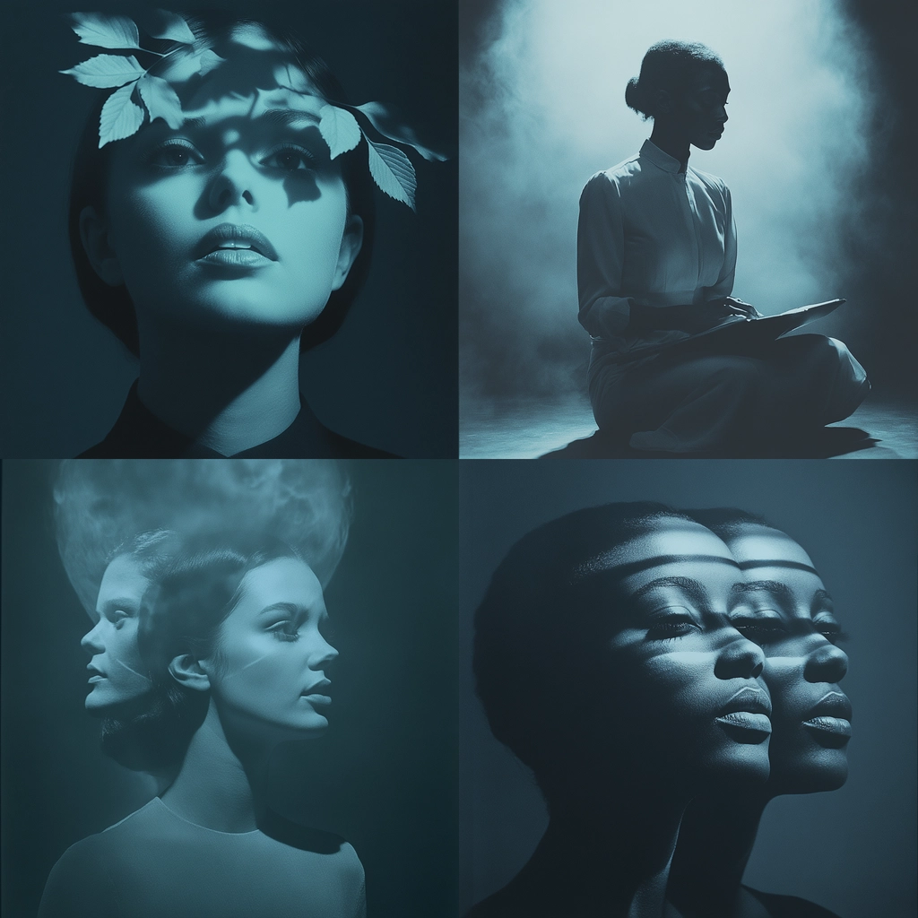The use of dark blue dominates the color palette, creating a deep and immersive visual experience. The subtle lighting effects enhance the textures and contours, creating a sense of depth and volume. The spatial arrangement draws the viewer's eye across the scene, emphasizing the interplay between light and shadow.