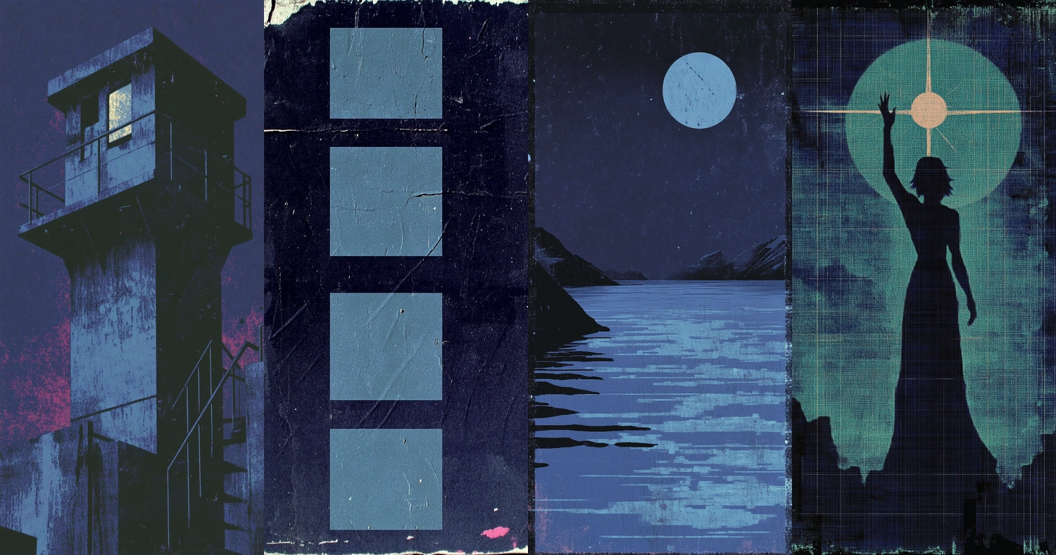 Strong use of shadows creates depth with a play of light and dark, while textures enhance the visual density. The precise use of dark blue evokes a filmic, atmospheric quality.