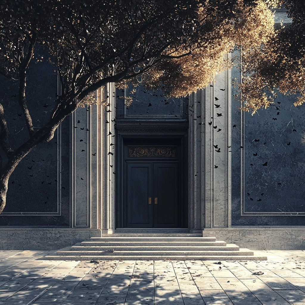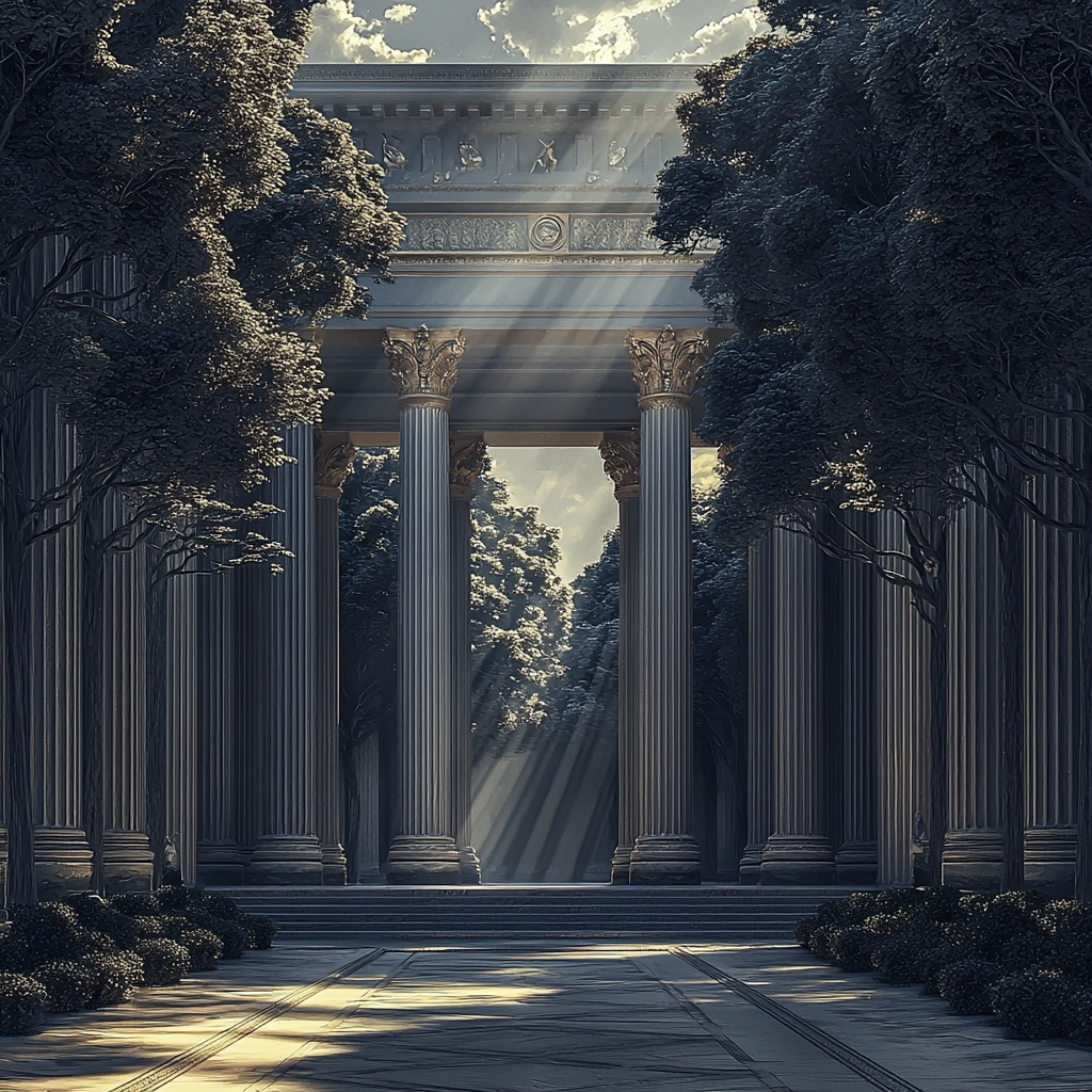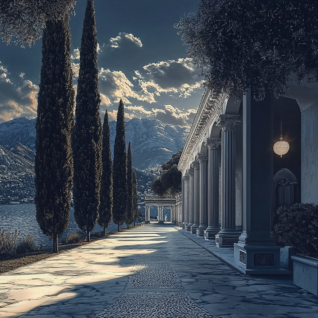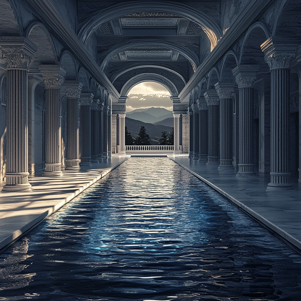 Utilizes cool tones and symmetric composition creating structured elegance.