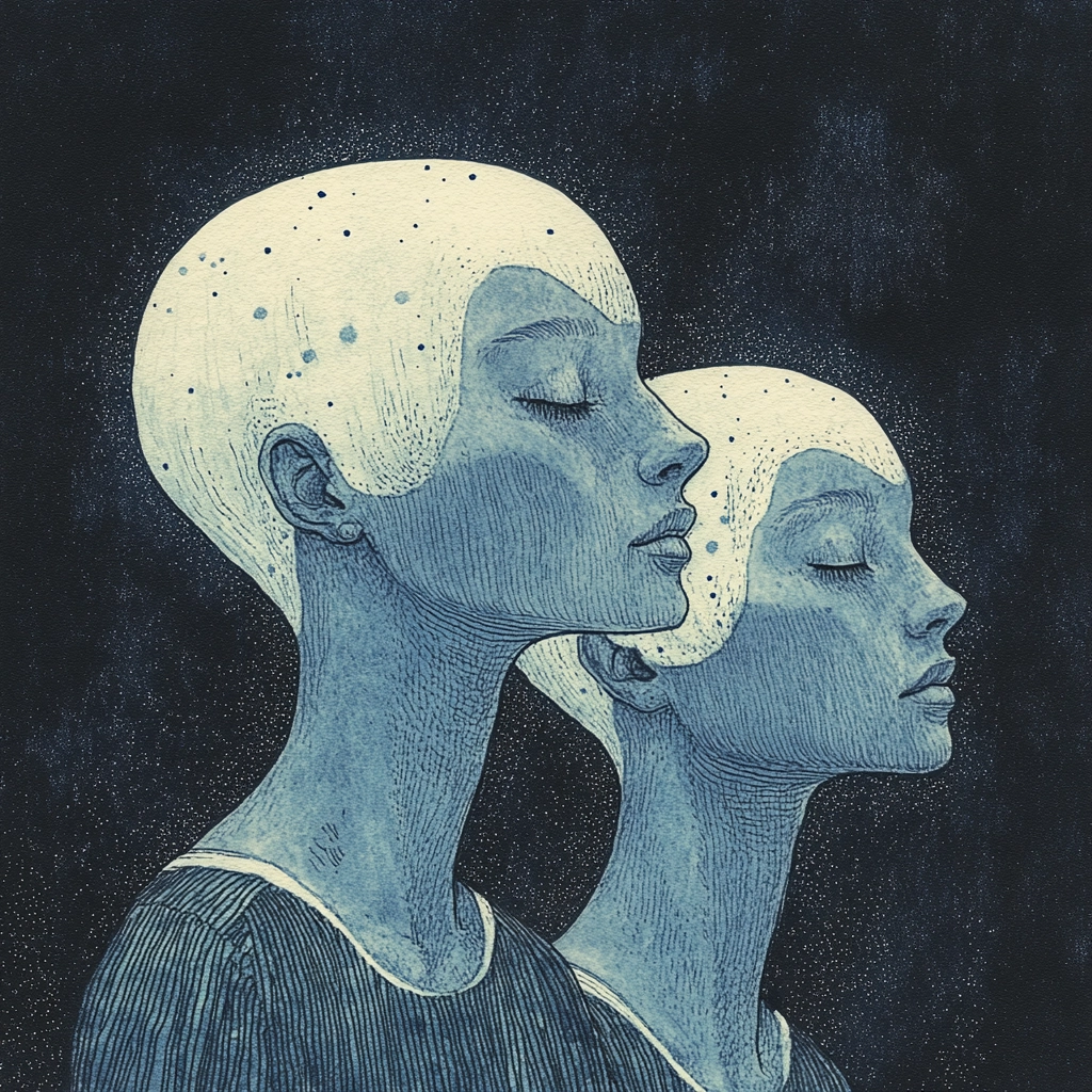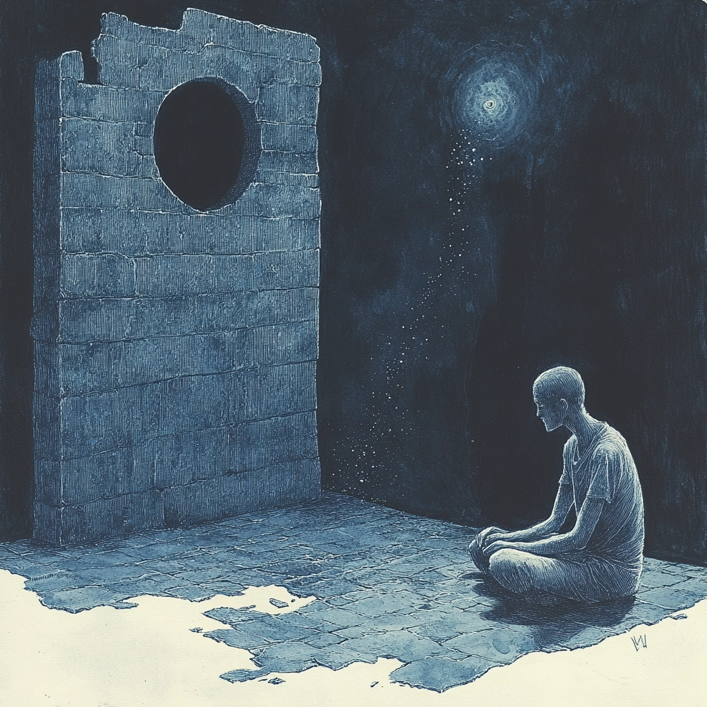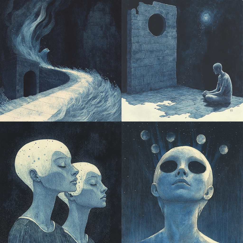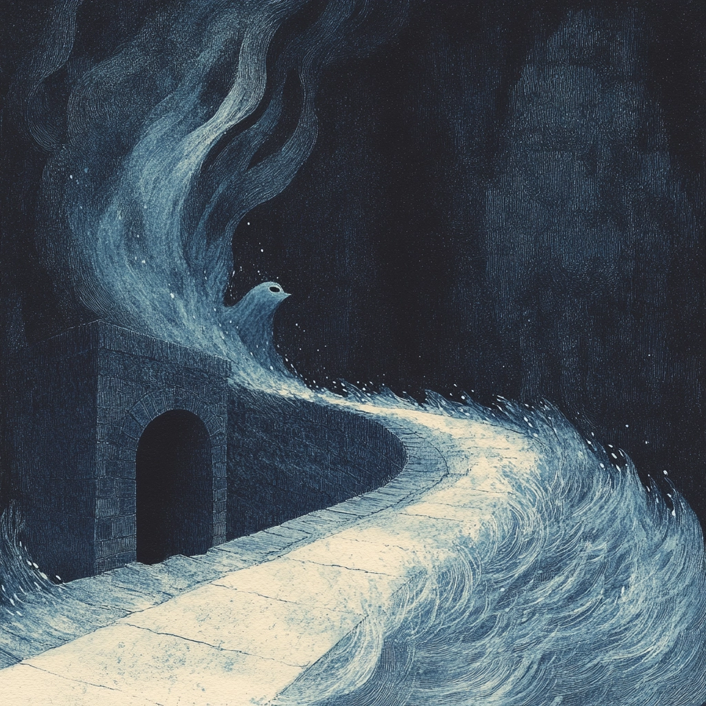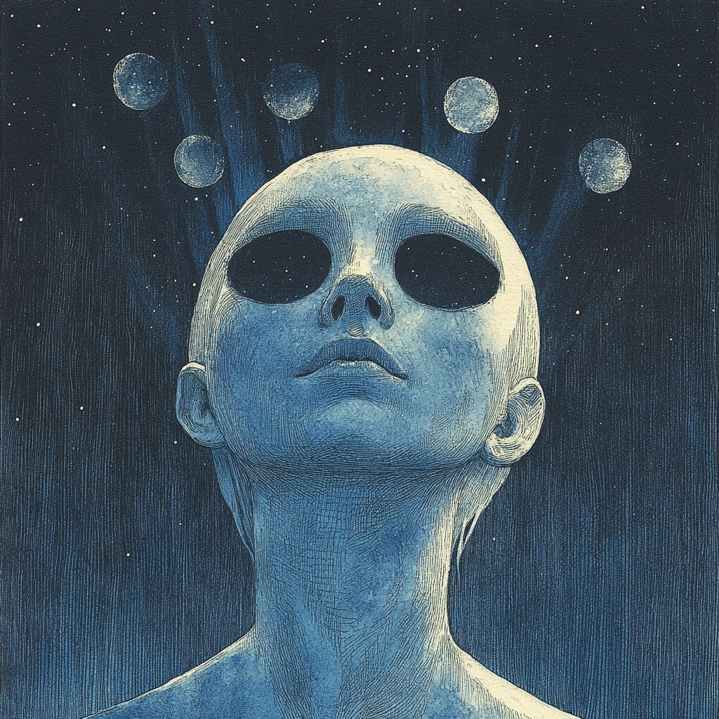 The lighting conveys a subdued and mystical ambiance, achieved through the interplay of dark blue and white hues that define the contour against indigo backgrounds. Texture adds depth to the artwork, creating a sense of dimensionality and spatial transcendence.