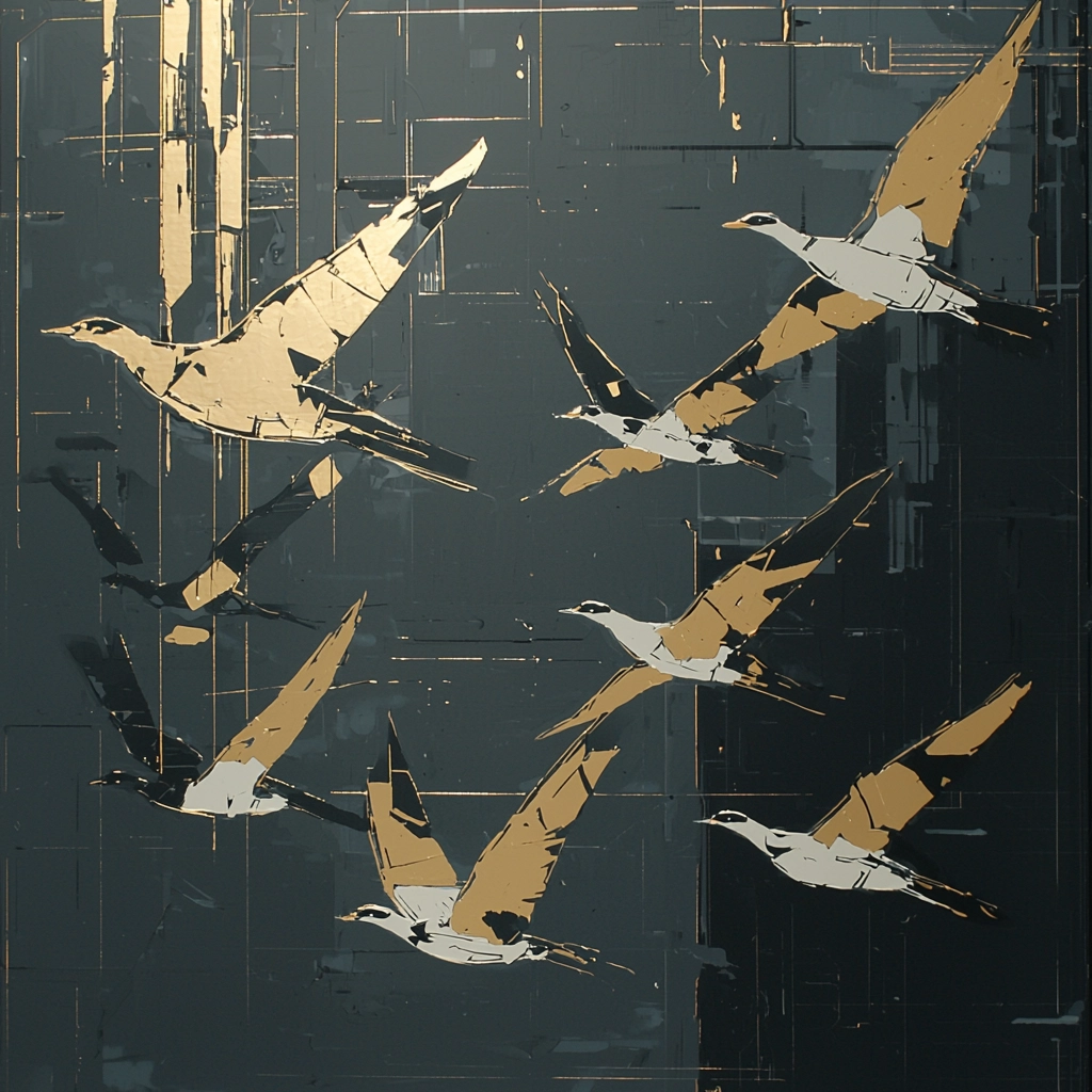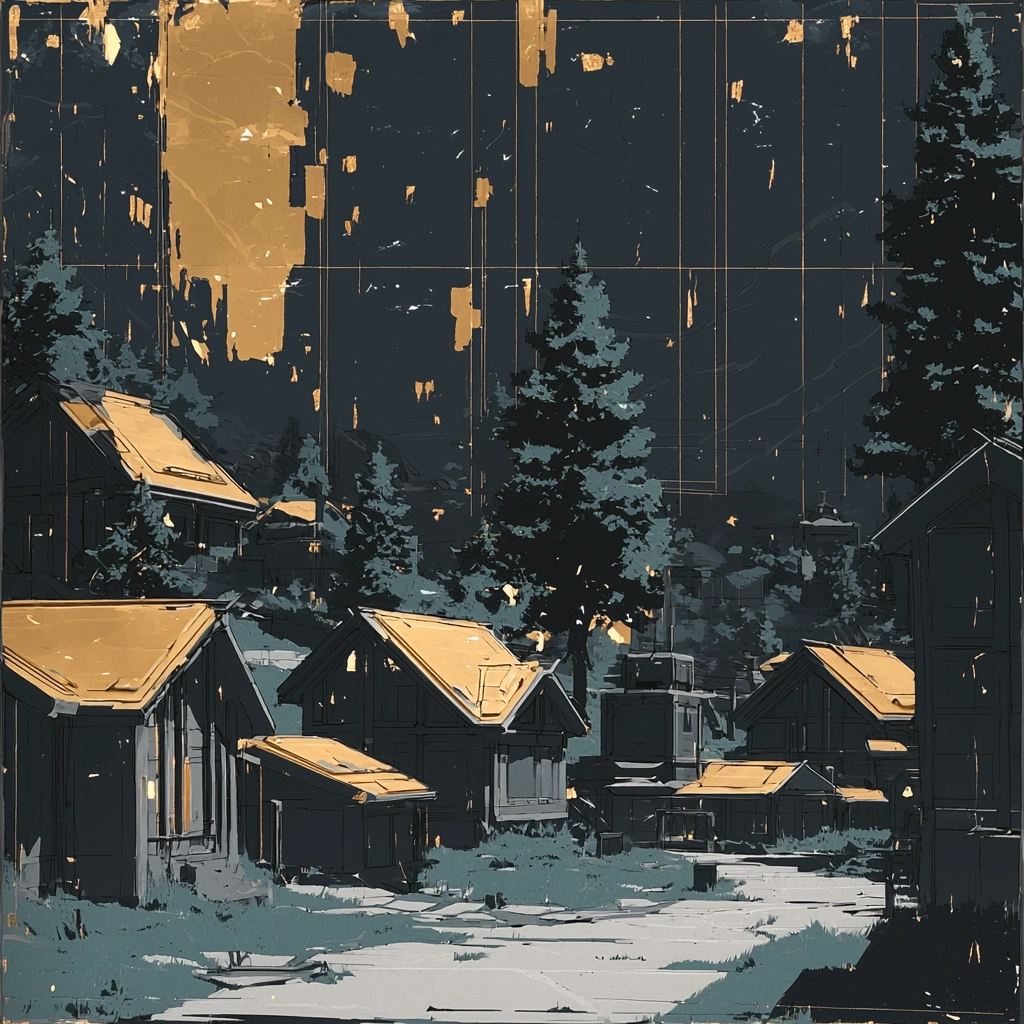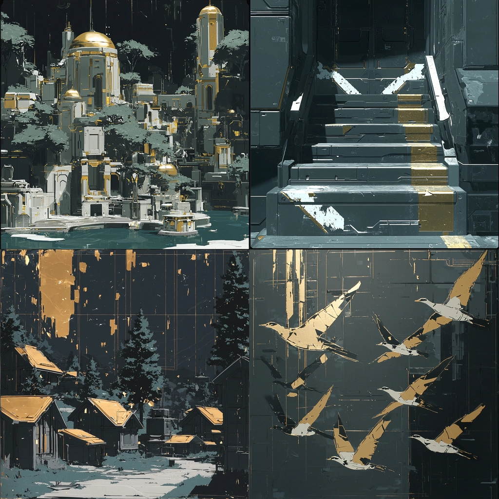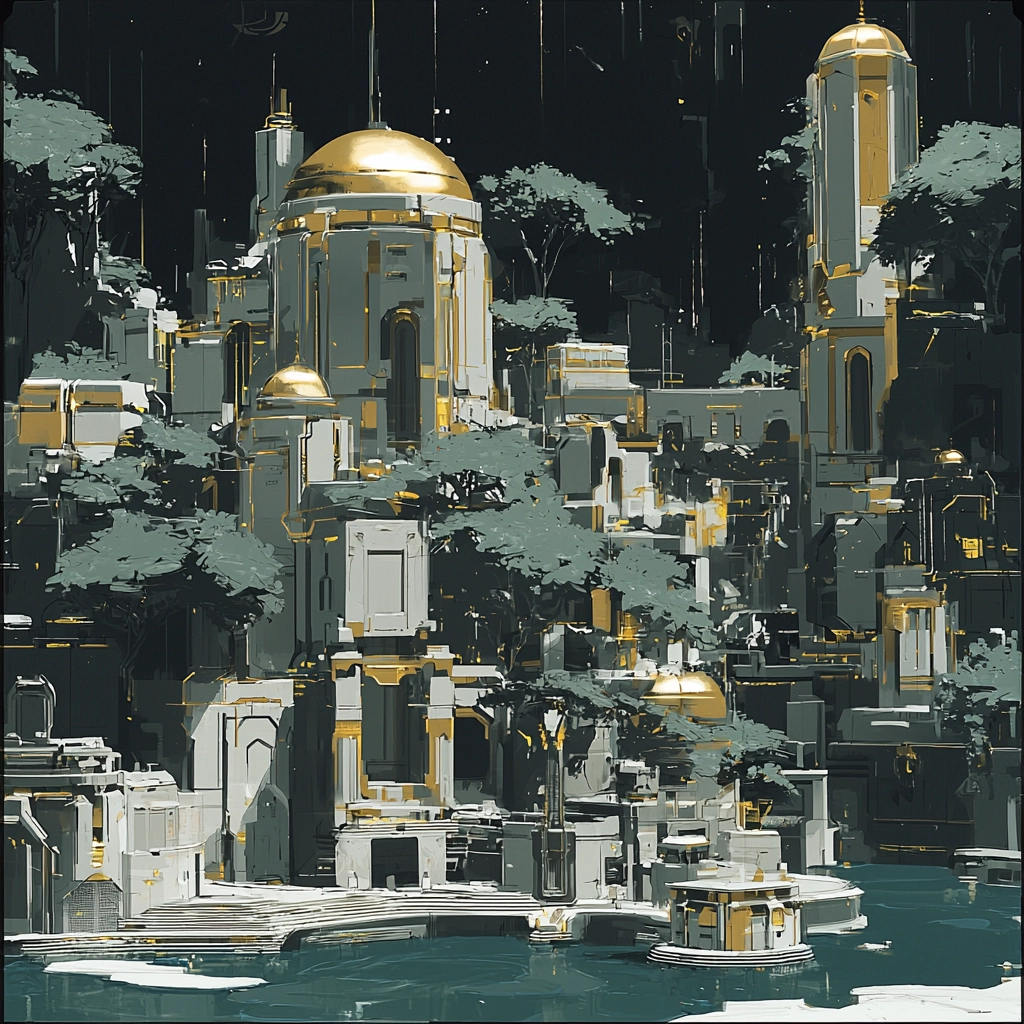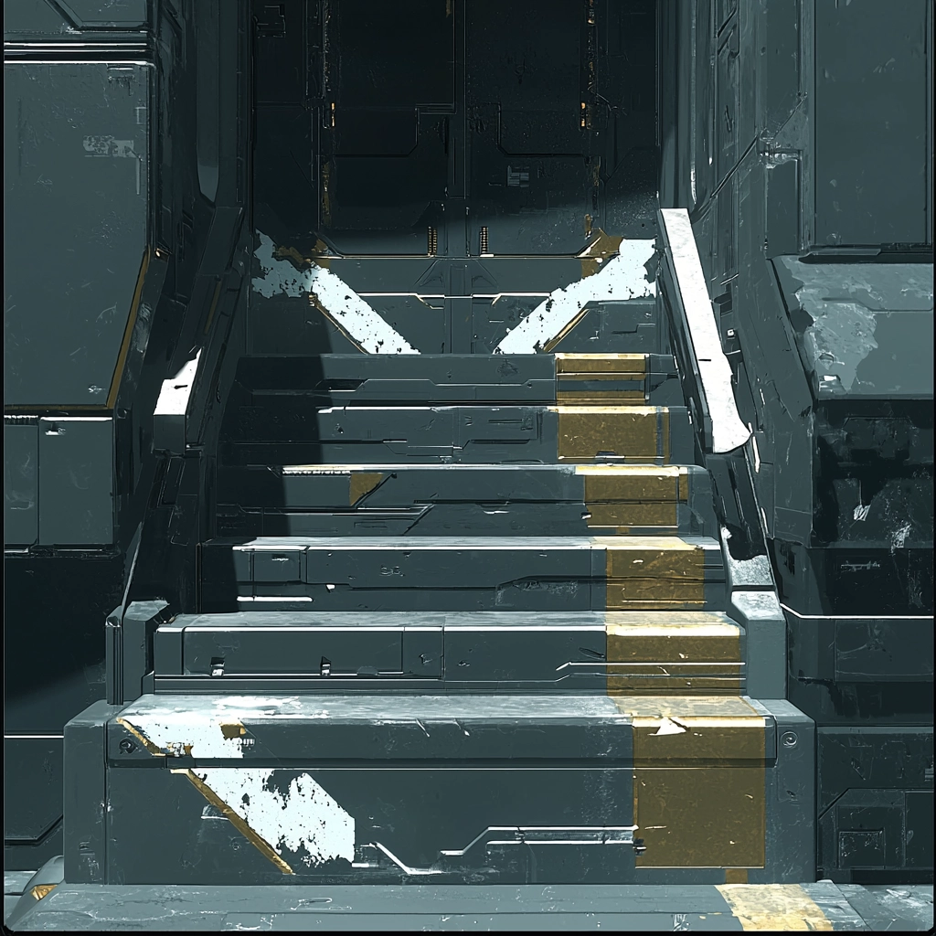 The lighting creates a contrast between dim backgrounds and notable gold embellishments, enhancing a layered spatial depth. The texture appears rugged, providing a sense of age and weight, supported by geometry-heavy structures with clean lines.