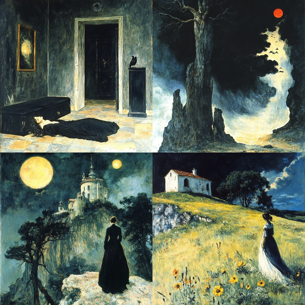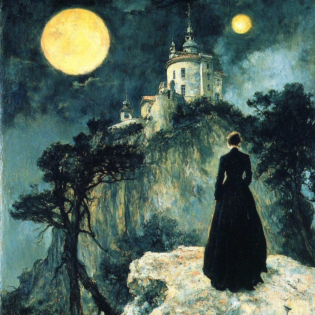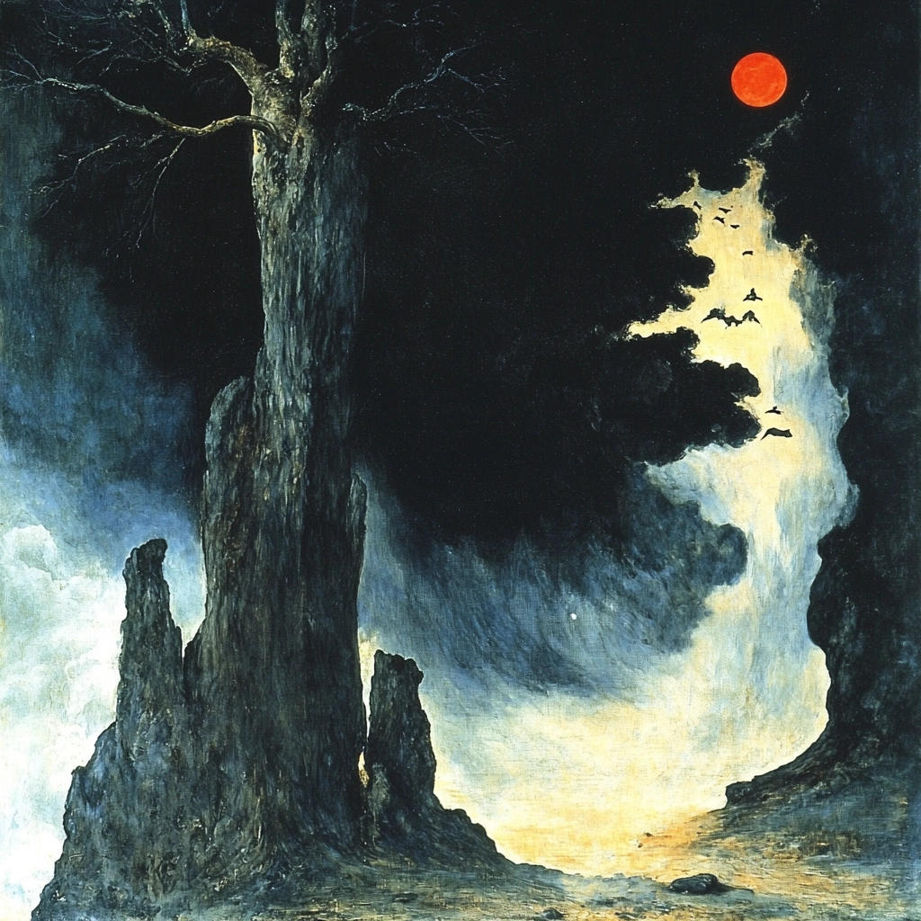 The use of chiaroscuro lighting emphasizes deep shadows juxtaposed with bright lunar or artificial illumination. Textures vary from smooth, open skies to textured vegetation, providing spatial depth. Cool and warm tones are used to create contrast in the night-time atmosphere.
